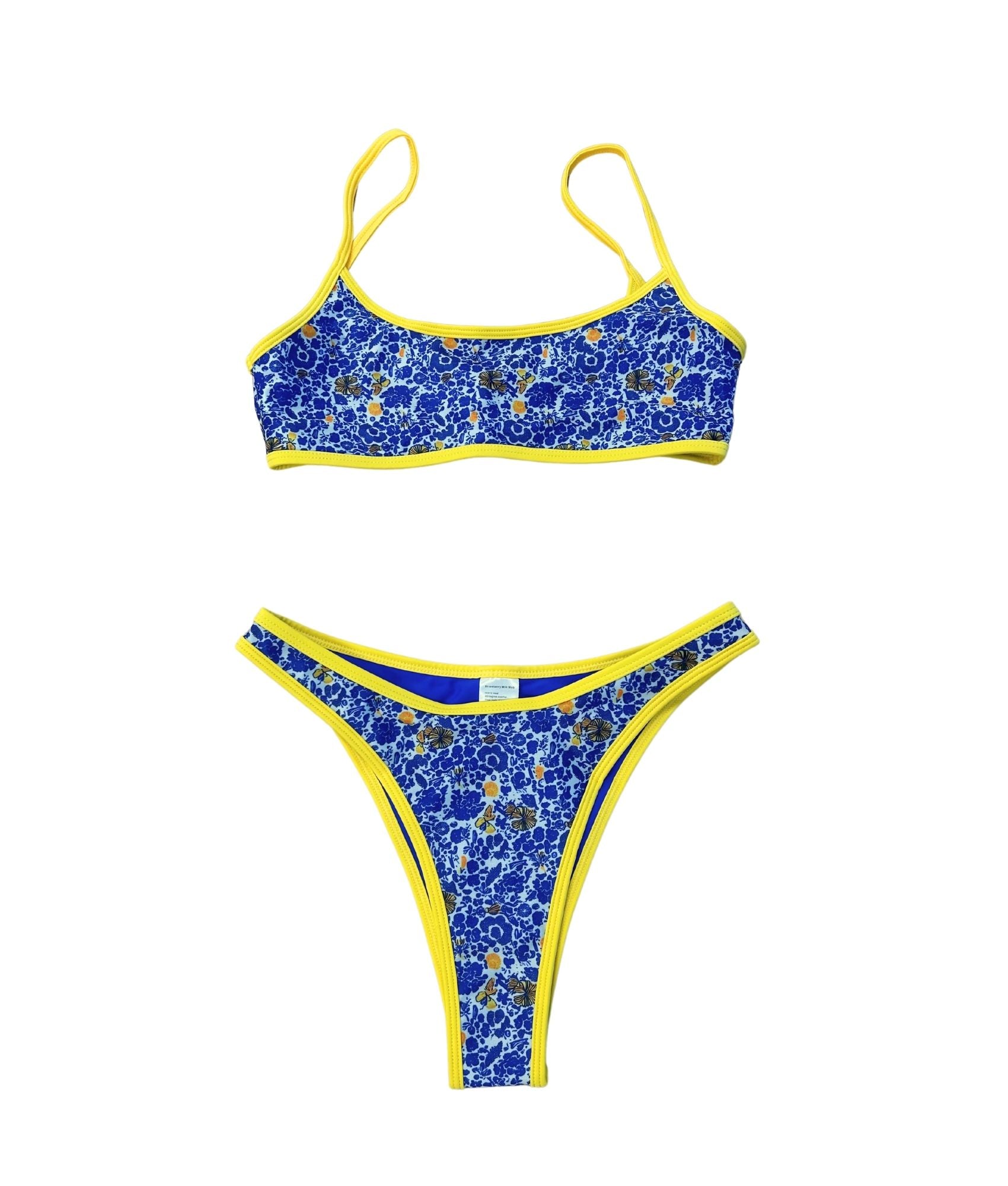 Channel the wisdom and beauty of the goddess herself with the Athena bikini bottom. Part of our Cento per Cento reversible collection, this floral print piece captures the essence of Greece with vibrant blue, white, and yellow blooms, while the reverse side flaunts a striking solid cobalt blue with yellow trim. With a cheeky cut and medium coverage, Athena is as practical as she is beautiful—perfect for every adventure.
