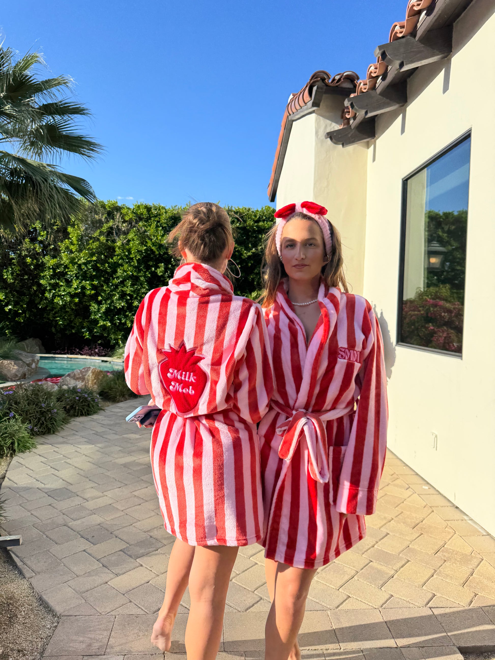 Wrap yourself in soft sweetness of our Bathrobe! Made from soft, quick-drying fabric that feels like a fuzzy blanket, it’s perfect for poolside lounging, post-shower pampering, or a mini getaway. The eye-catching red and pink stripes bring the fun, while the classic silhouette keeps it effortlessly chic. Finished with SMM stitching on the front and our signature strawberry on the back, this robe is your cozy new essential.