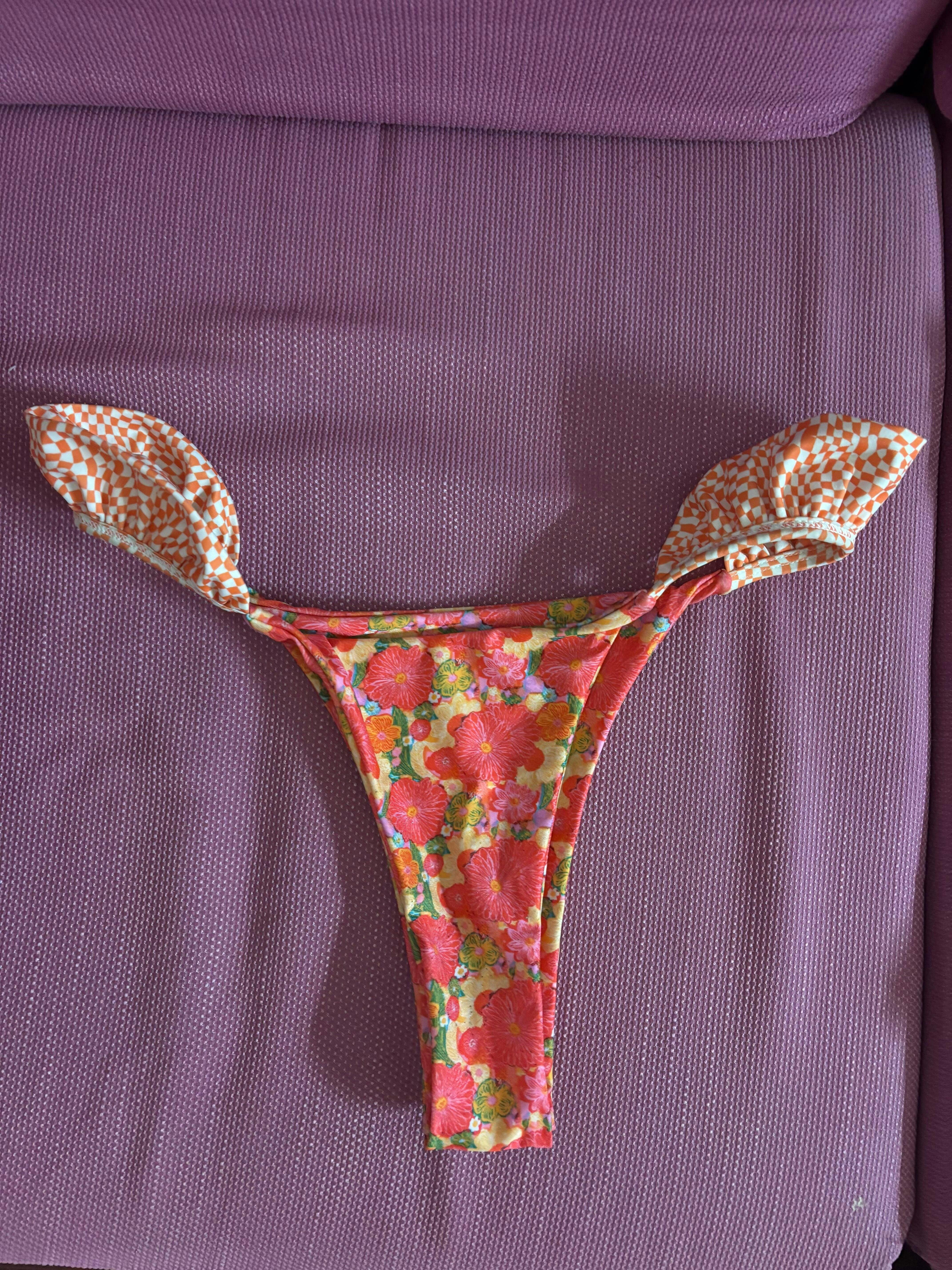 Embrace the vibrancy of sunny days with our Citrus Kiss bikini bottoms – a darling addition to your beach attire. Featuring ruffled orange checkered sides that sit gracefully on your high hip, these bottoms boast a cheerful blend of orange, red, and yellow flower print. With a very cheeky cut, they add a touch of playfulness to your beach look. The frill on the waist enhances their cutesy charm, while the seamless stitching ensures unparalleled comfort.