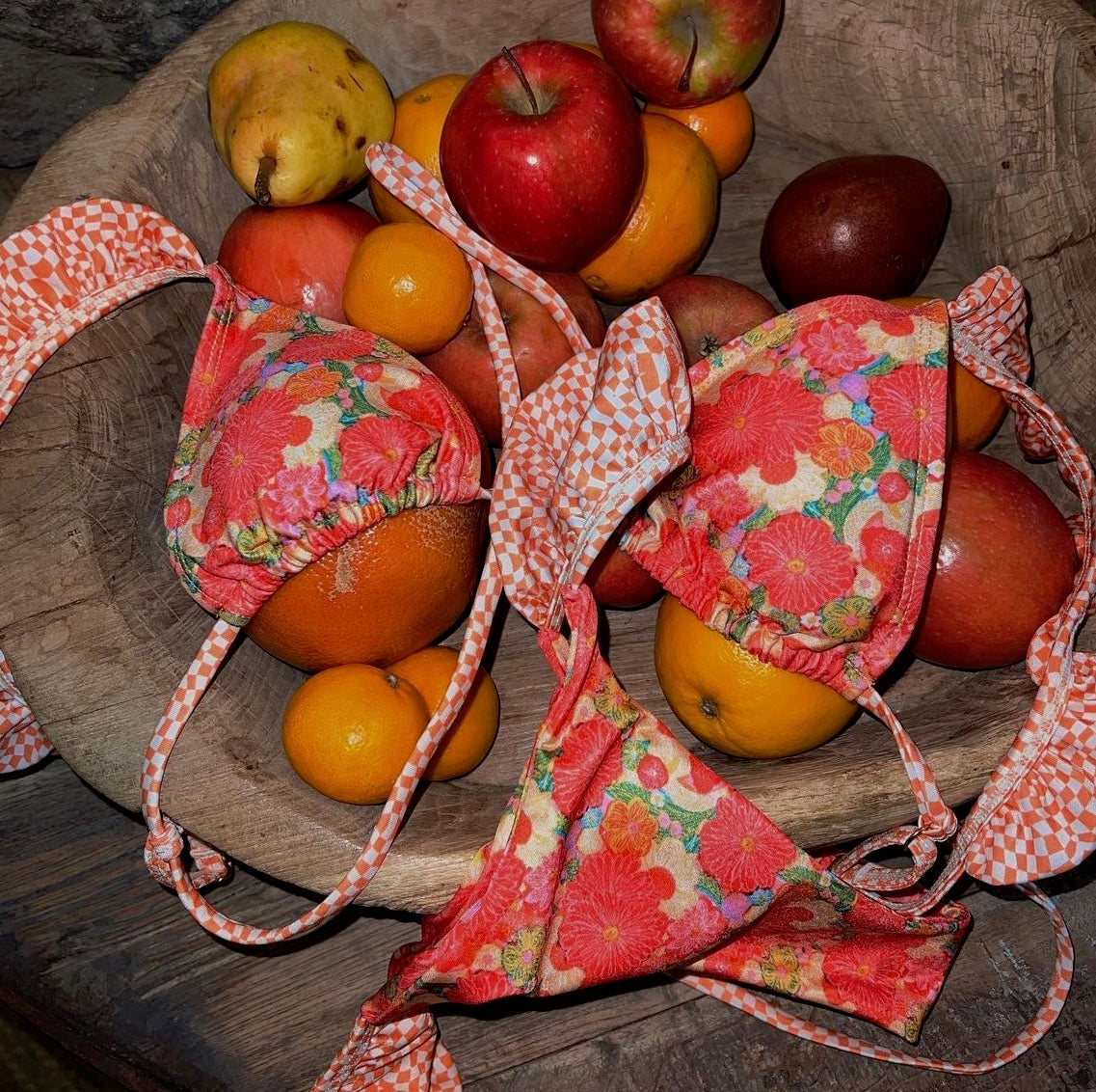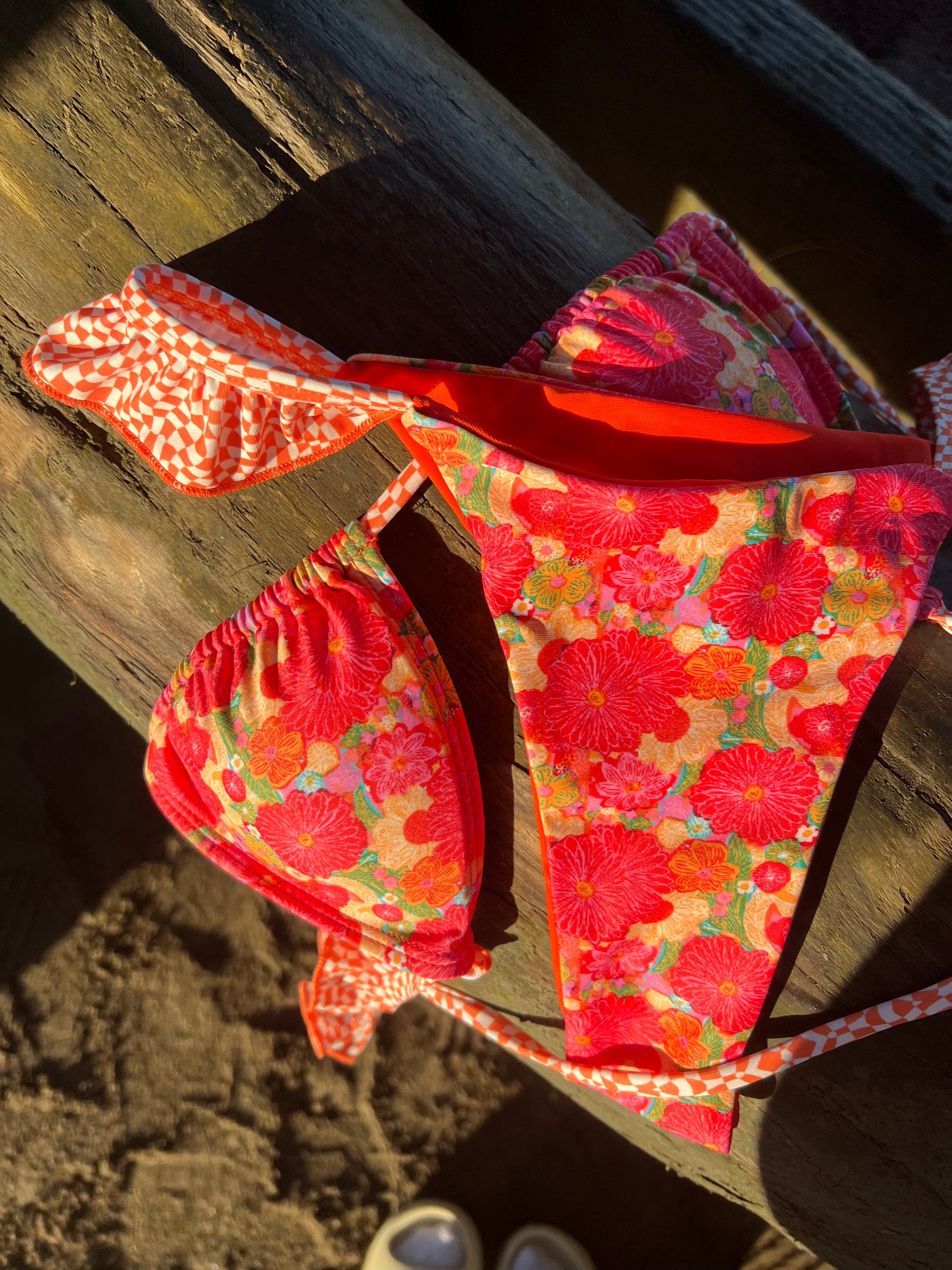 The Citrus Kiss bikini top is a darling addition to your beach wardrobe. With ruffled orange checkered straps and a burst of orange, red, and yellow flower print, this playful top captures the essence of sunny days. While the cups are designed for a smaller fit and may not accommodate larger busts, the frills on the shoulders add charming detailing. Adjustable tie strings ensure a personalized fit, while the padded feature offers versatility, with the option to remove if preferred. Elevate your beachside look with the vibrant and cheerful spirit of the Citrus Kiss bikini top.