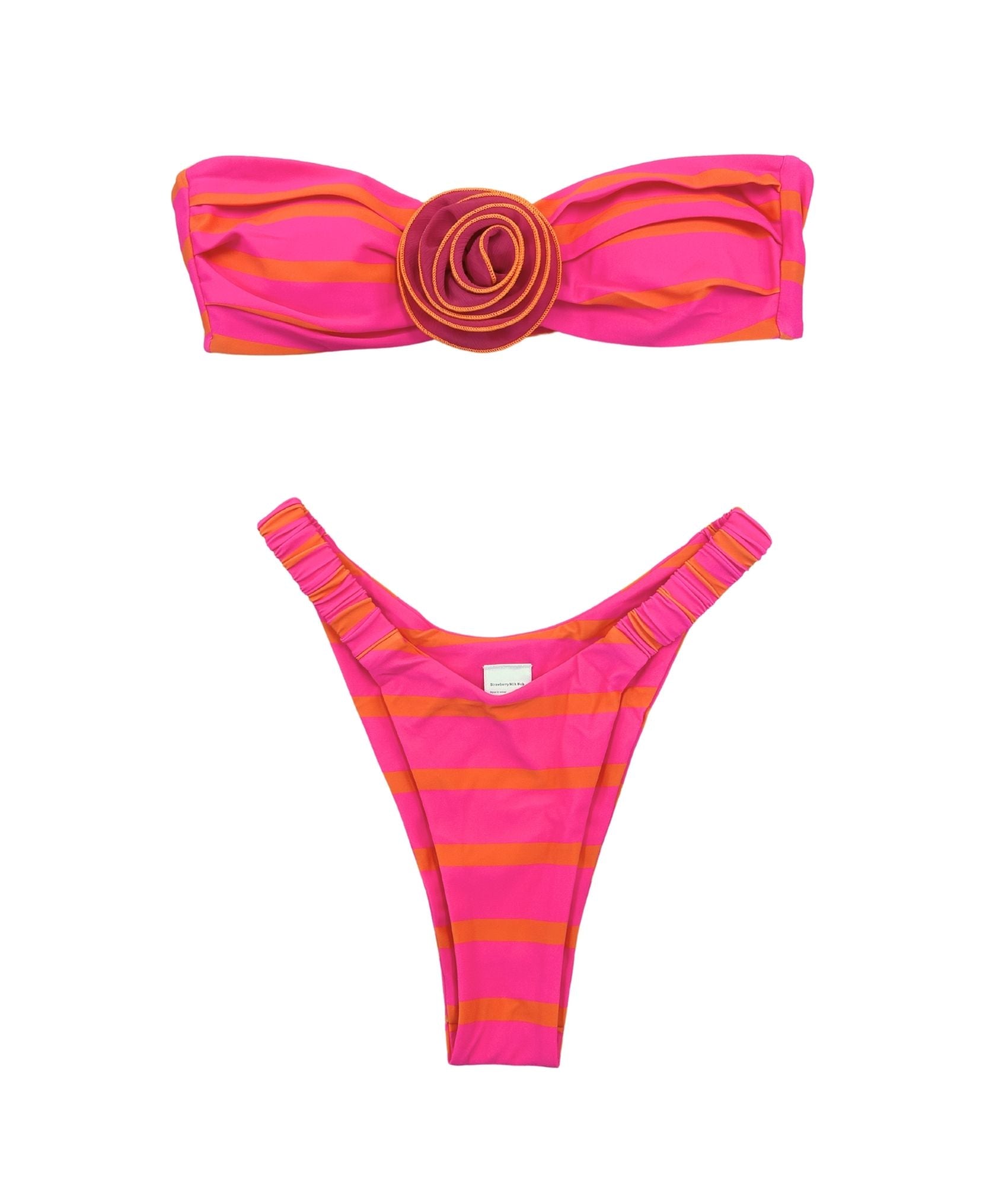 Brighten your beach look with the Clair de Lune bikini top, where bright and bold pink meets playful orange stripes in a chic, strapless design! Designed after our popular French Kiss bikini, this top features a secure tie back, removable padding, and rubber grip lining for that comfy, stay-put fit. Complete with a detachable pink fabric flower, it’s an instant mood-lifter you can style your way. Perfect for catching both rays and attention, the Clair de Lune’s lively color palette adds a fresh glow to every skin tone, making it your new go-to for unforgettable beach days.