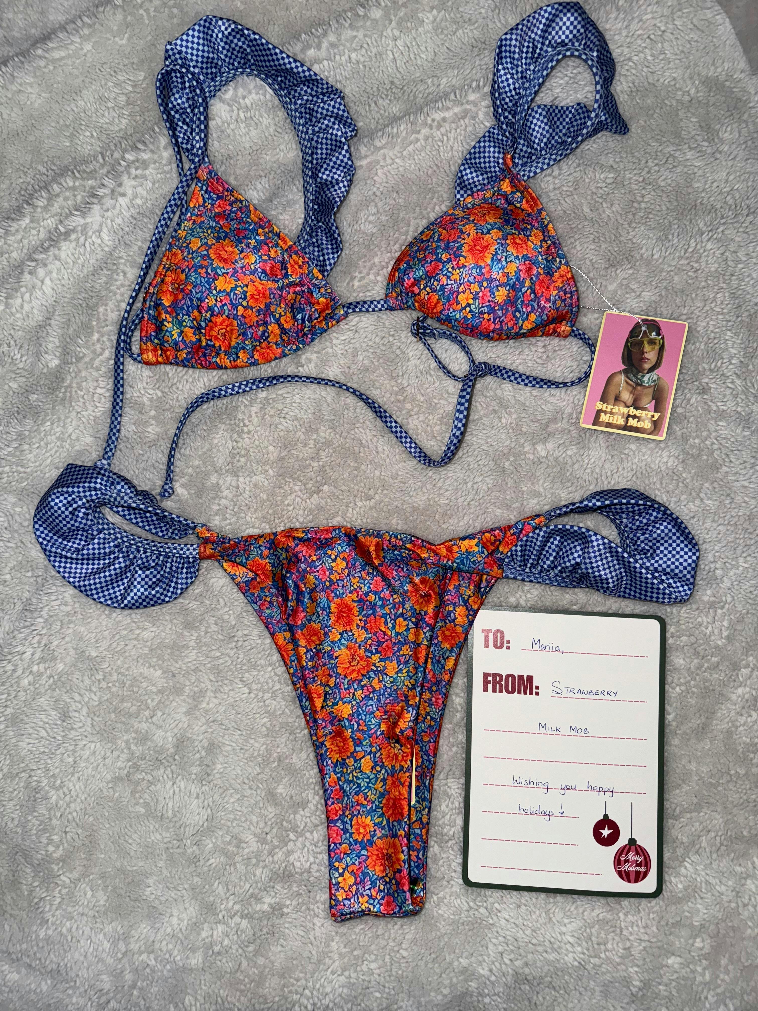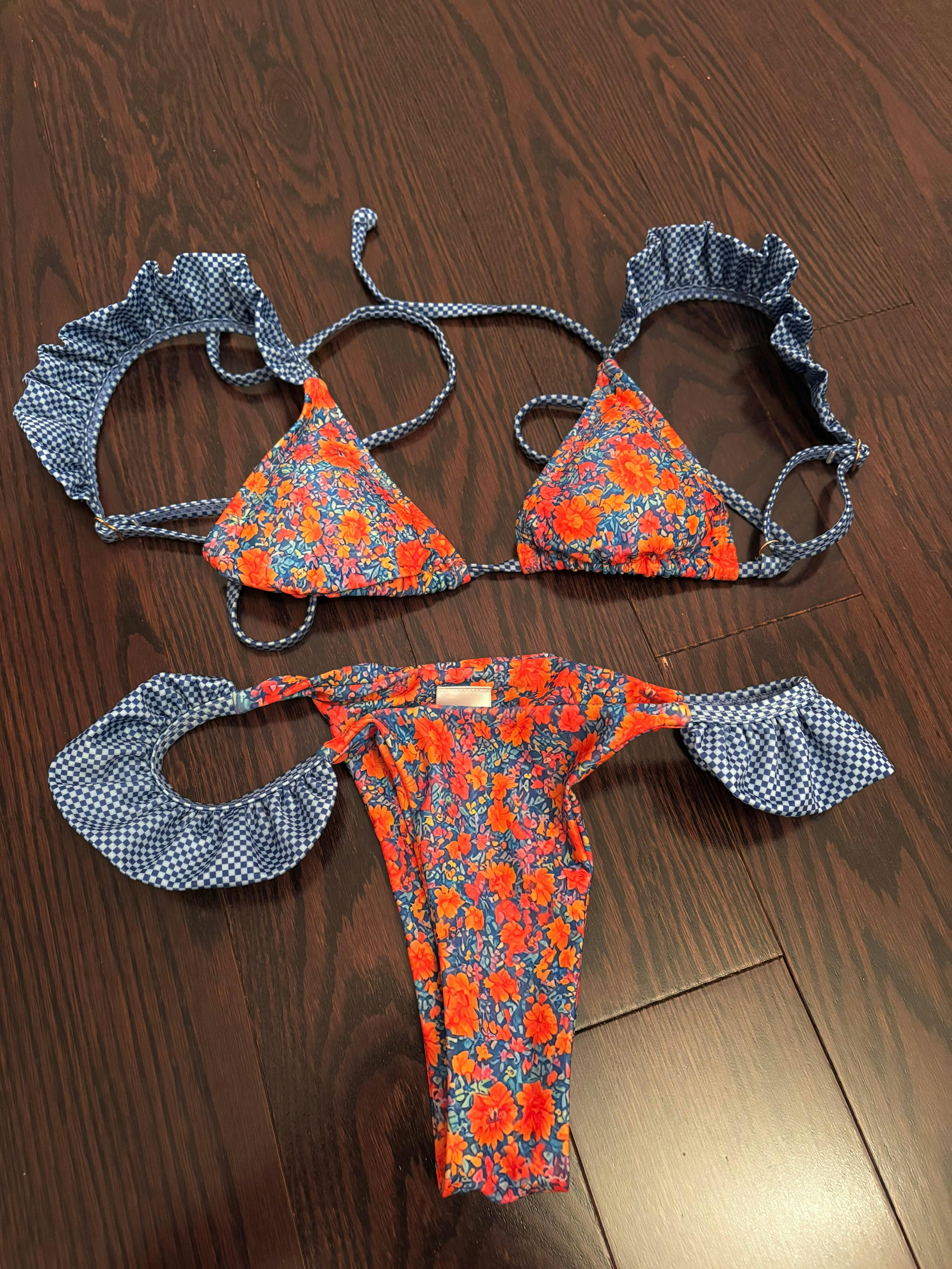 The Electric Smooch top is a vibrant fusion of elegance and playfulness that's sure to turn heads. Adorned with a lively mix of blue and orange flowers, complemented by charming blue gingham ruffled shoulder and back ties, this top brings a burst of color to your beach days. While designed for a smaller fit, the frills on the shoulders provide delightful detailing that catches the eye. The adjustable tie strings allow you to customize the fit to your comfort, while the added padding offers versatility, easily removable according to your preference. Embrace the beauty of blooms with the Electric Smooch Top.