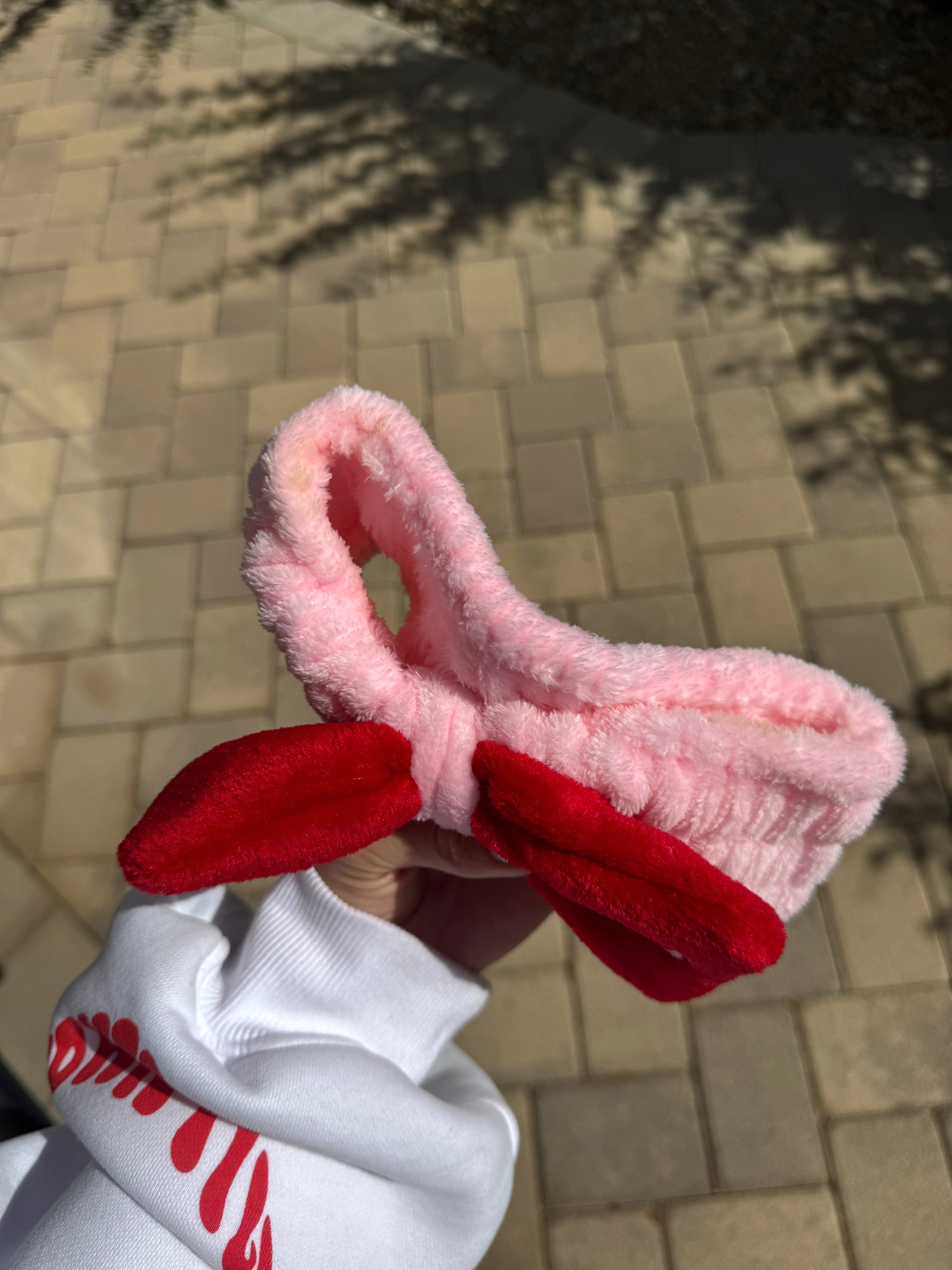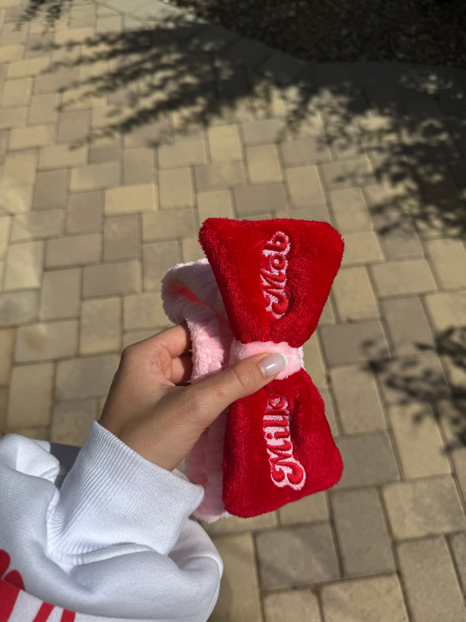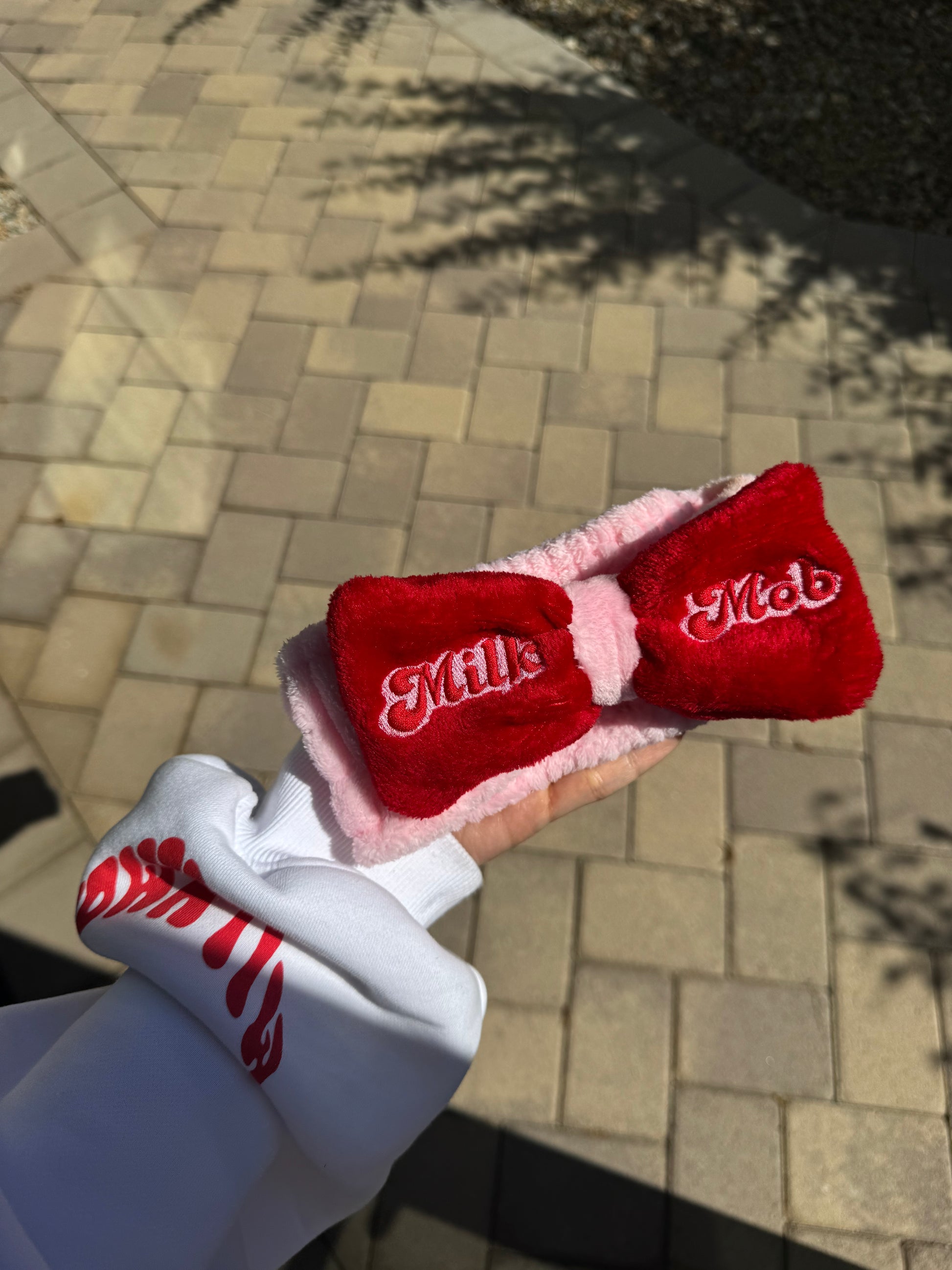 Stay cute 24/7 in our Headband! This adorable pink headband is SO SOFT and features a plush red bow and delicate pink "Milk Mob" embroidery—perfect for keeping your hair back while washing your face, doing your makeup, or enjoying a relaxing face mask. Made from ultra-soft, quick-drying fabric for comfort and water absorption. Add a touch of sweetness to your skincare routine—because self-care should always be cute!