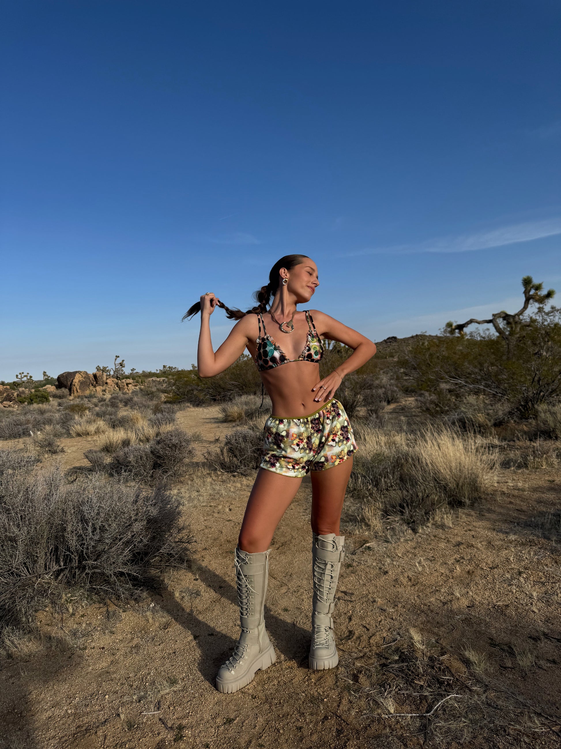 Bloom where it’s hottest in the Innerbloom bikini top. A classic triangle-cut with a desert-dot print in earthy greens, warm browns, and pops of orange/turquoise and a tie-dye effect, that's made to turn heads. Frilly cups, supportive double-spaghetti straps on the shoulders, adjustable back-tie, and removable padding offer comfort with a flirty edge. Your desert flower moment starts from within!