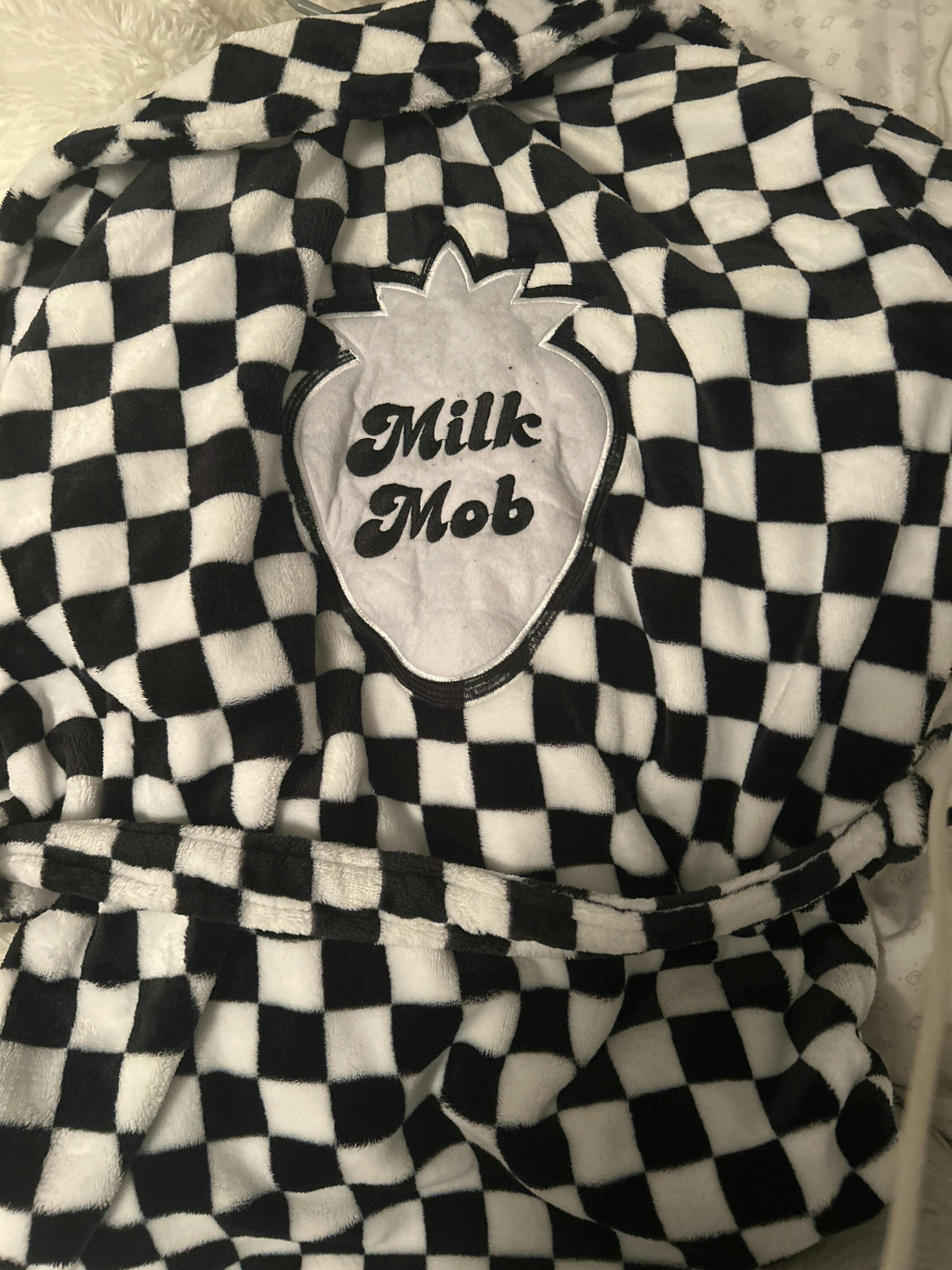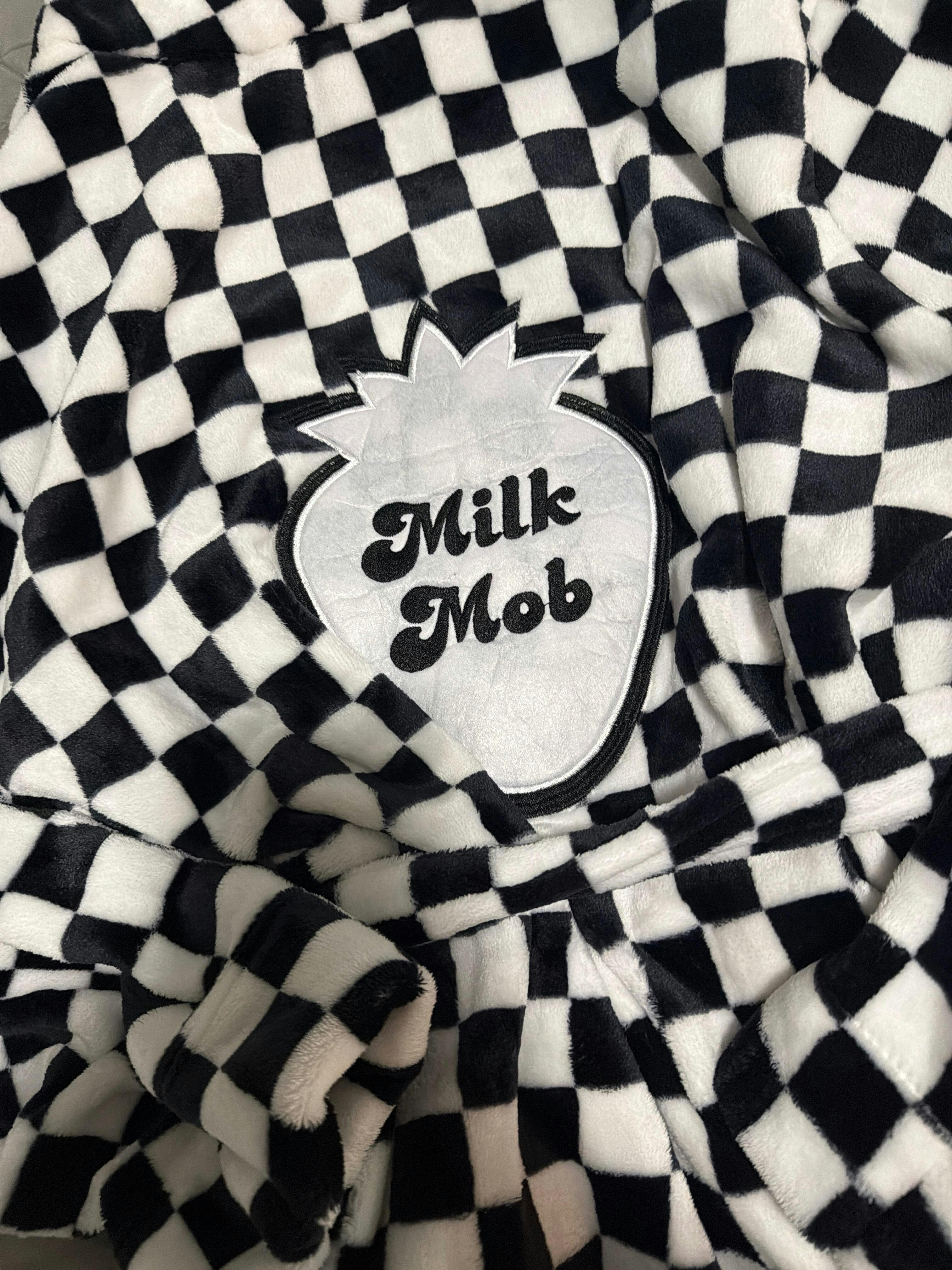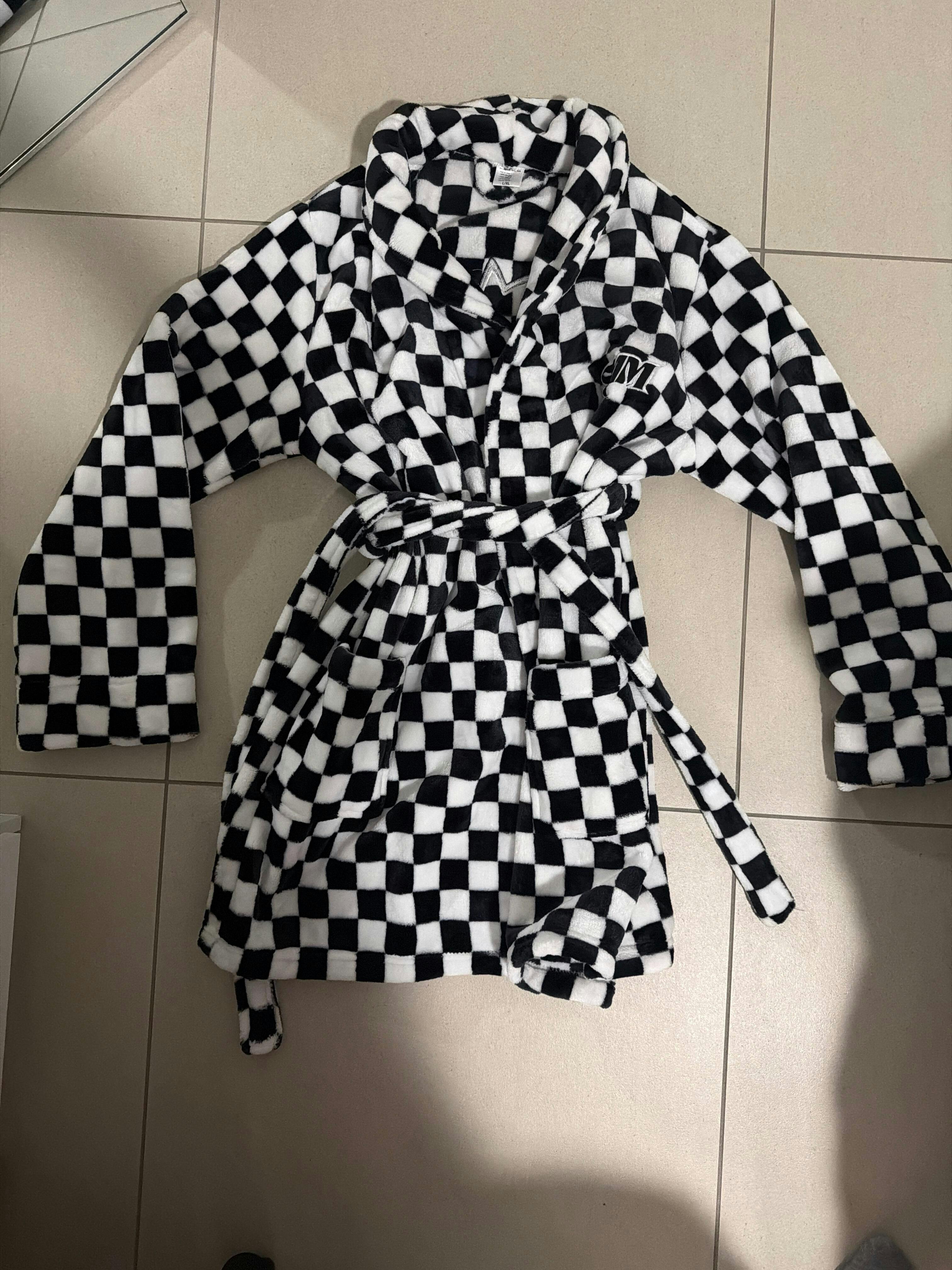 Cozy up in timeless style with this black and white fuzzy checkered bathrobe—warm, soft, and effortlessly chic for lounging in comfort and flair.