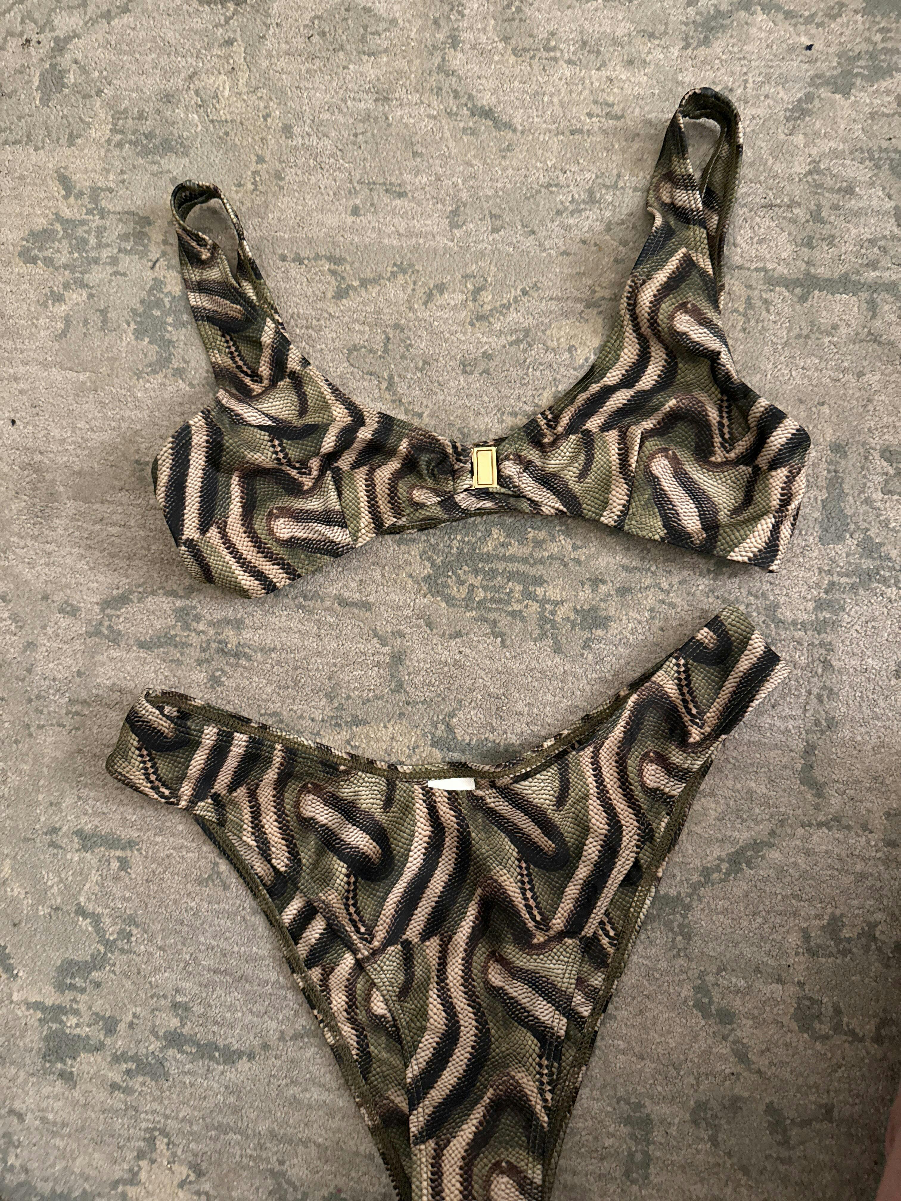 Introducing the Jungle Bikini Top—our most comfortable triangle top yet! Featuring a captivating green, beige, and black snake print, this stylish top is here to scale up your swim game. The Jungle Bikini Top stands out with chic gold rings connecting the cups to thick, adjustable shoulder straps for a luxe touch that adds bite to this classic silhouette. Designed with a string-tie back and removable padding, it offers both comfort and versatility for the perfect fit. Slip into this snakey style and turn heads wherever you sunbathe!