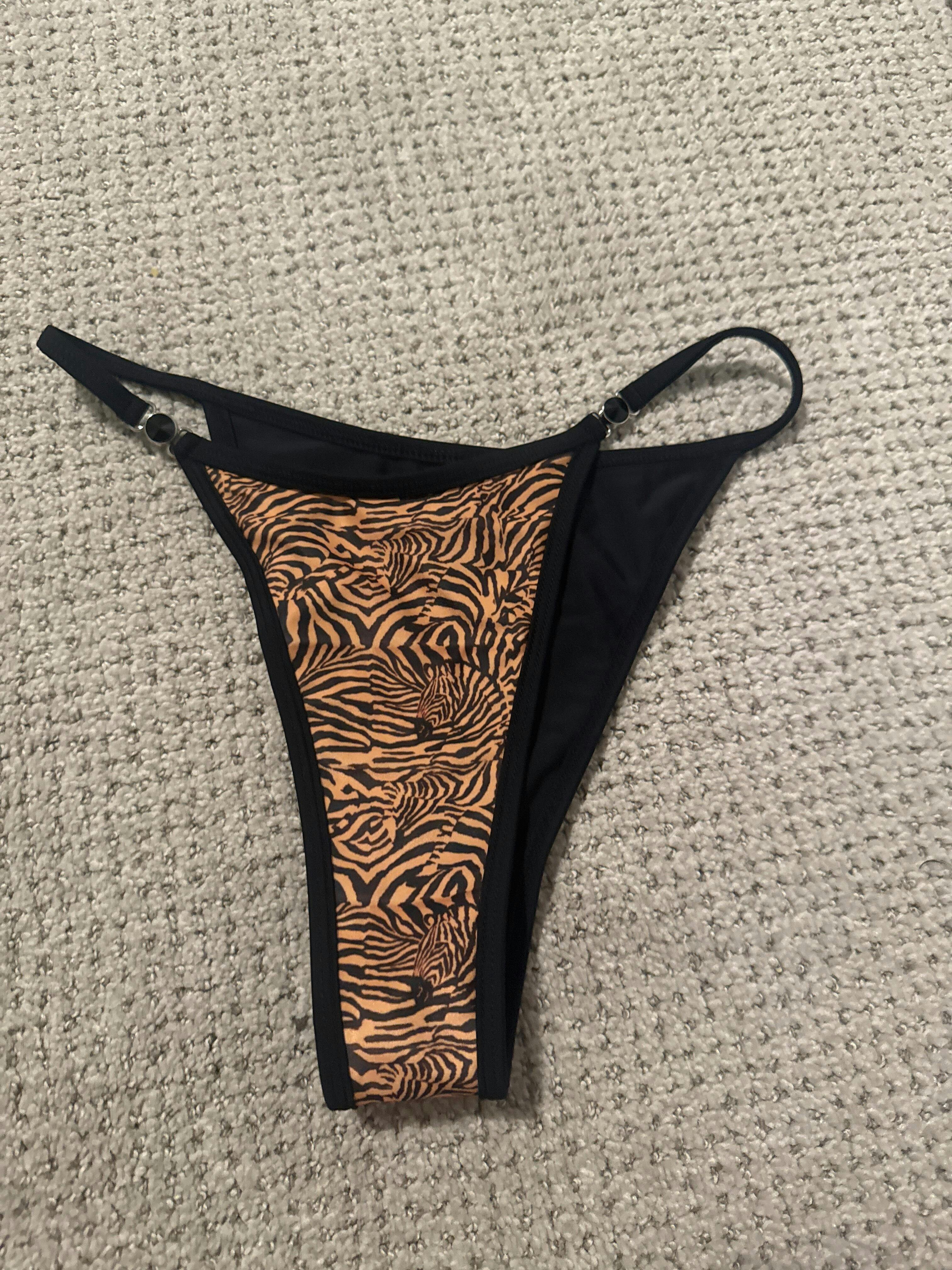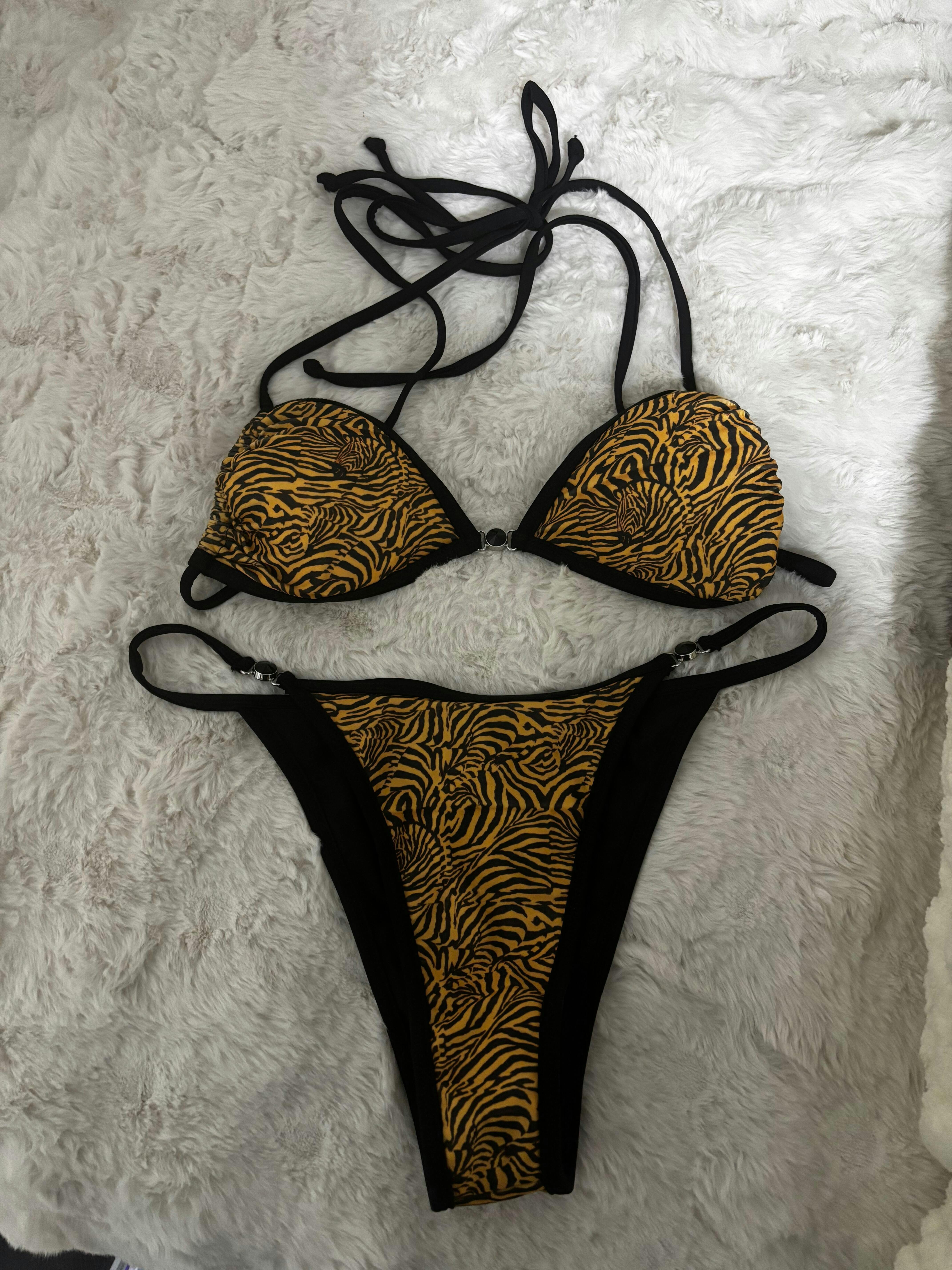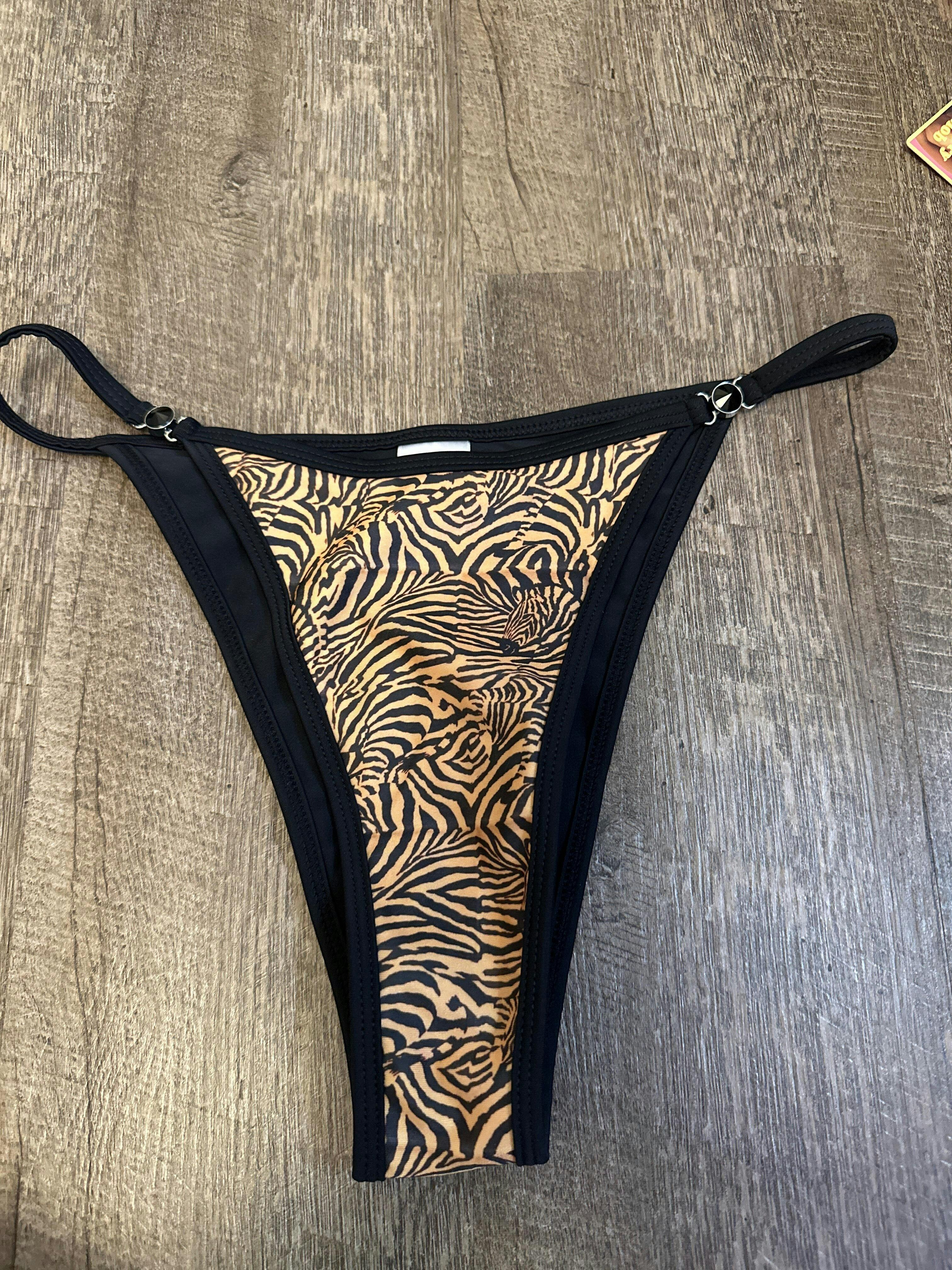 Unleash your inner wildcat with our Medusa Bikini Bottoms! These tiger-striped beauties bring fierce style and flirty vibes to your swimwear collection, featuring bold orange and brown tiger stripes with sleek black lining. Inspired by our beloved Milky Way bottoms, the Medusa cut offers thin, adjustable straps and medium cheeky coverage for a flawless fit—purrfect for poolside lounging! Adorned with eye-catching black gemstones, these bottoms add just the right amount of sparkle to your look. Dive in, and let your wild side shine!