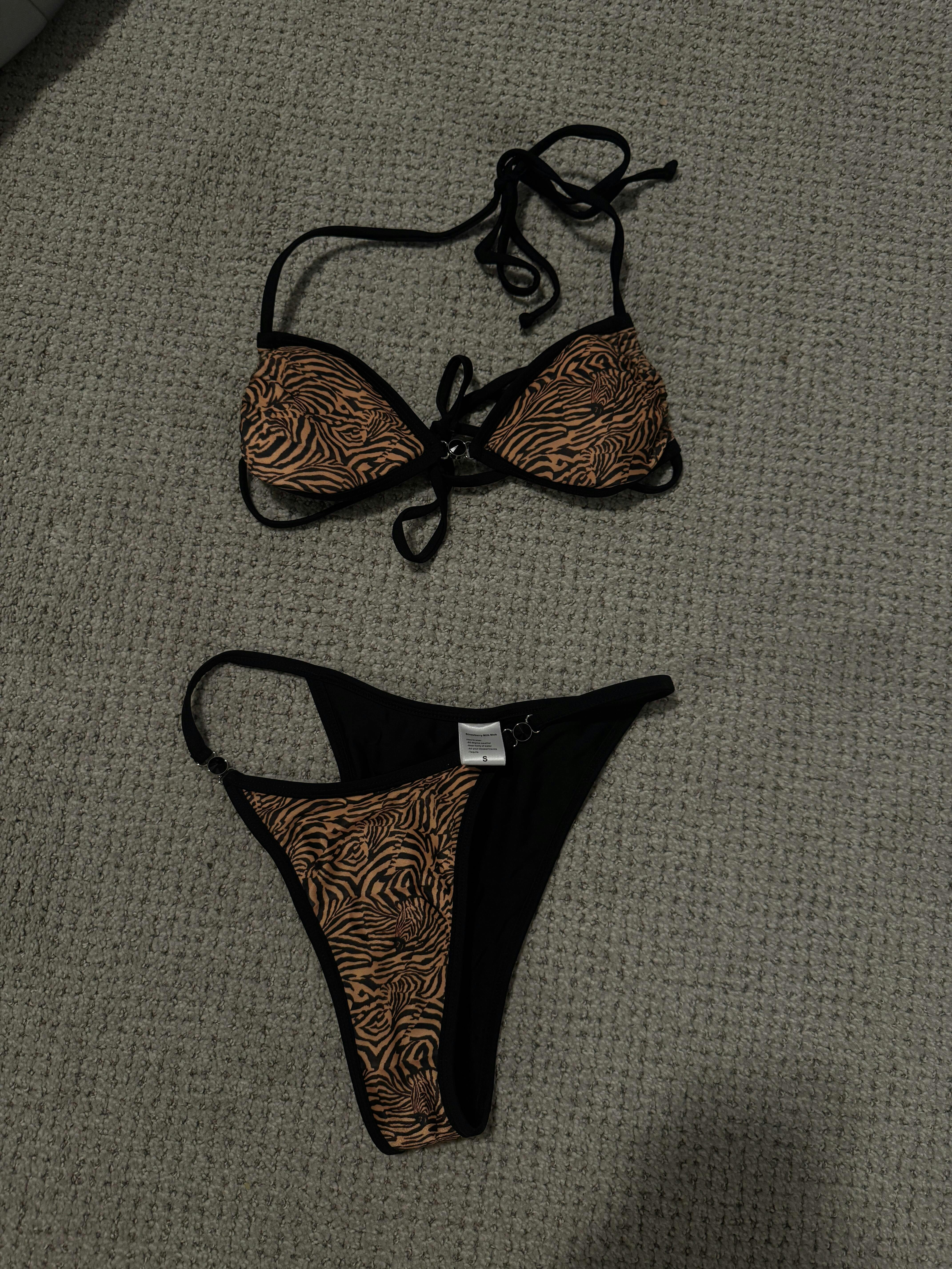 Unleash your wild side with our fan-favorite Milky Way Bikini Top in a fierce tiger stripe print! This tiger-inspired bikini top combines bold bronze stripes with sleek black lining for a look that's both fierce and chic. Featuring removable padding and adjustable tie straps, this versatile style ensures a comfortable fit, whether you’re lounging poolside or catching waves. The gem decal detail adds a unique sparkle that’s simply purr-fection. Get ready to channel your inner tiger—this top is all about style and confidence!