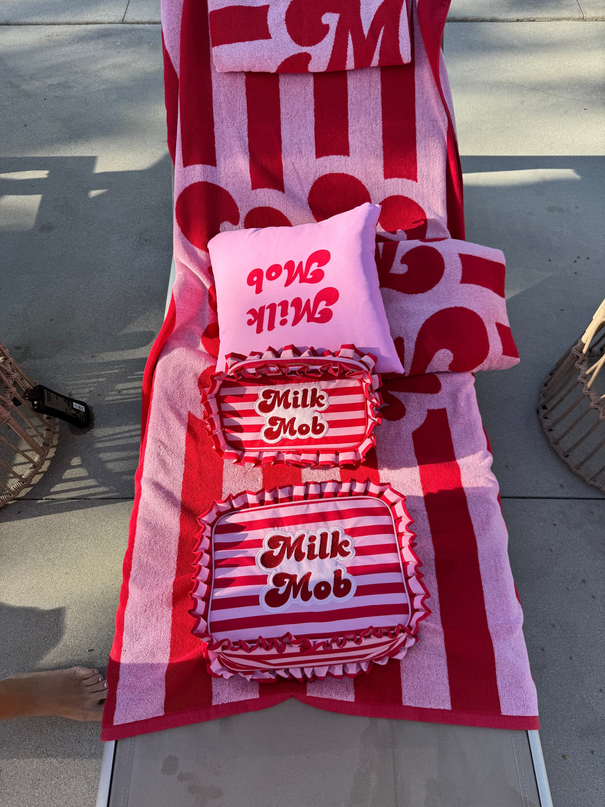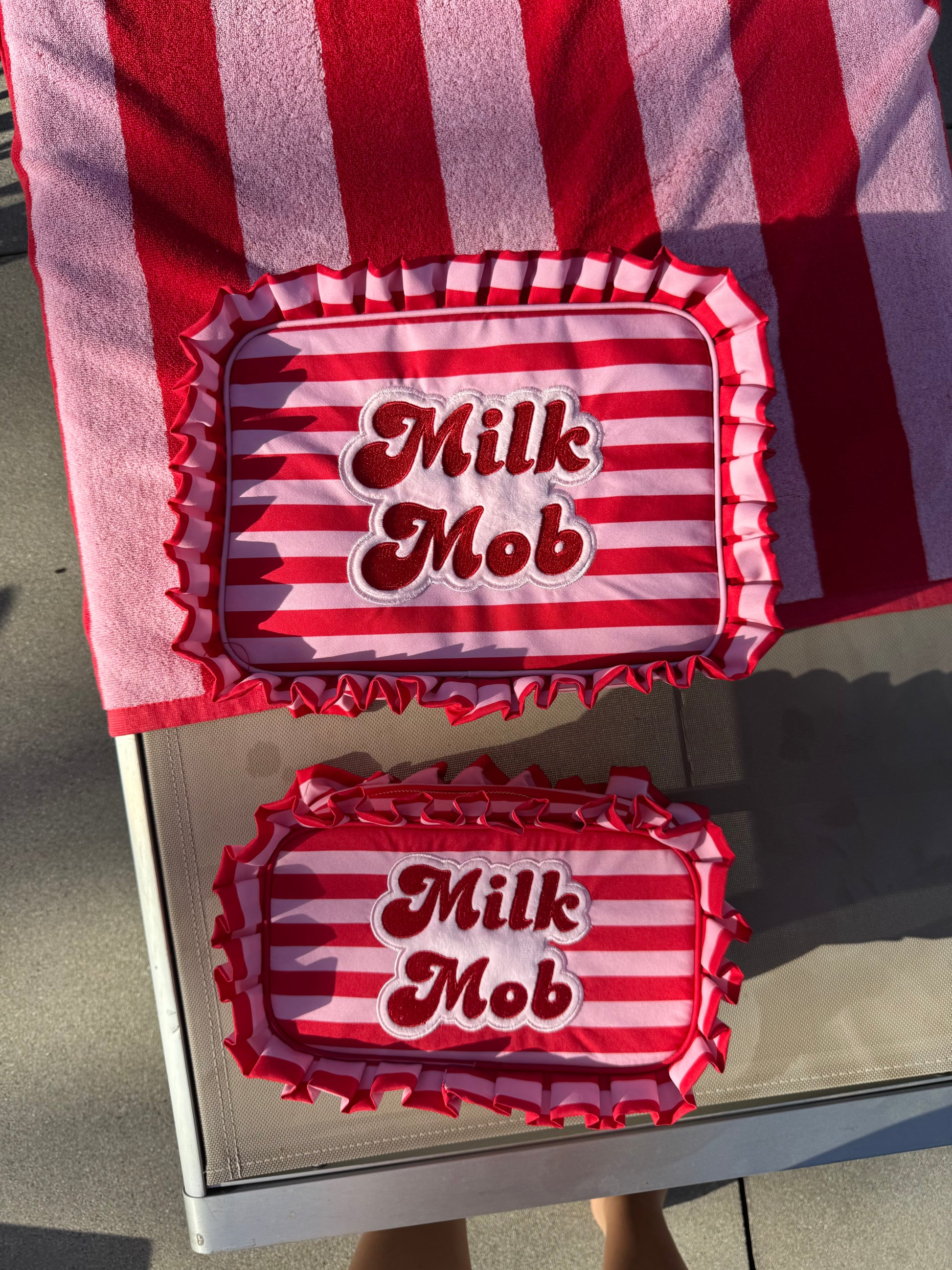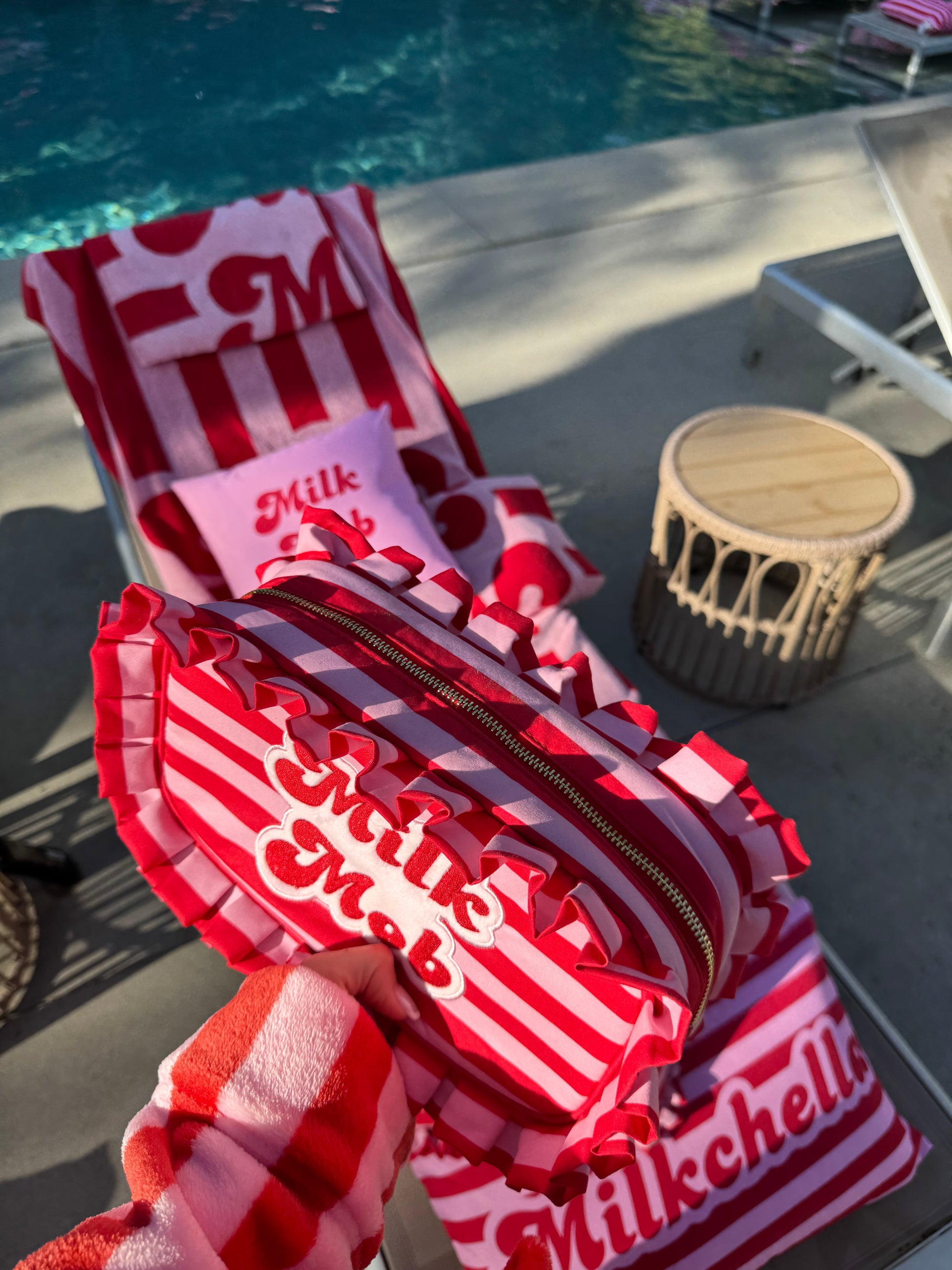 Meet Milkchella—the boldest beauty bag in your lineup! Featuring vibrant red and pink stripes, flirty ruffle edges, and signature Milk Mob stitching, this cosmetic bag is made to stand out. Whether you're stashing daily essentials or packing for a weekend escape to the Coachella Valley, Milkchella Cosmetic Bag brings playful charm and practical style wherever you go. Choose from two sizes!
