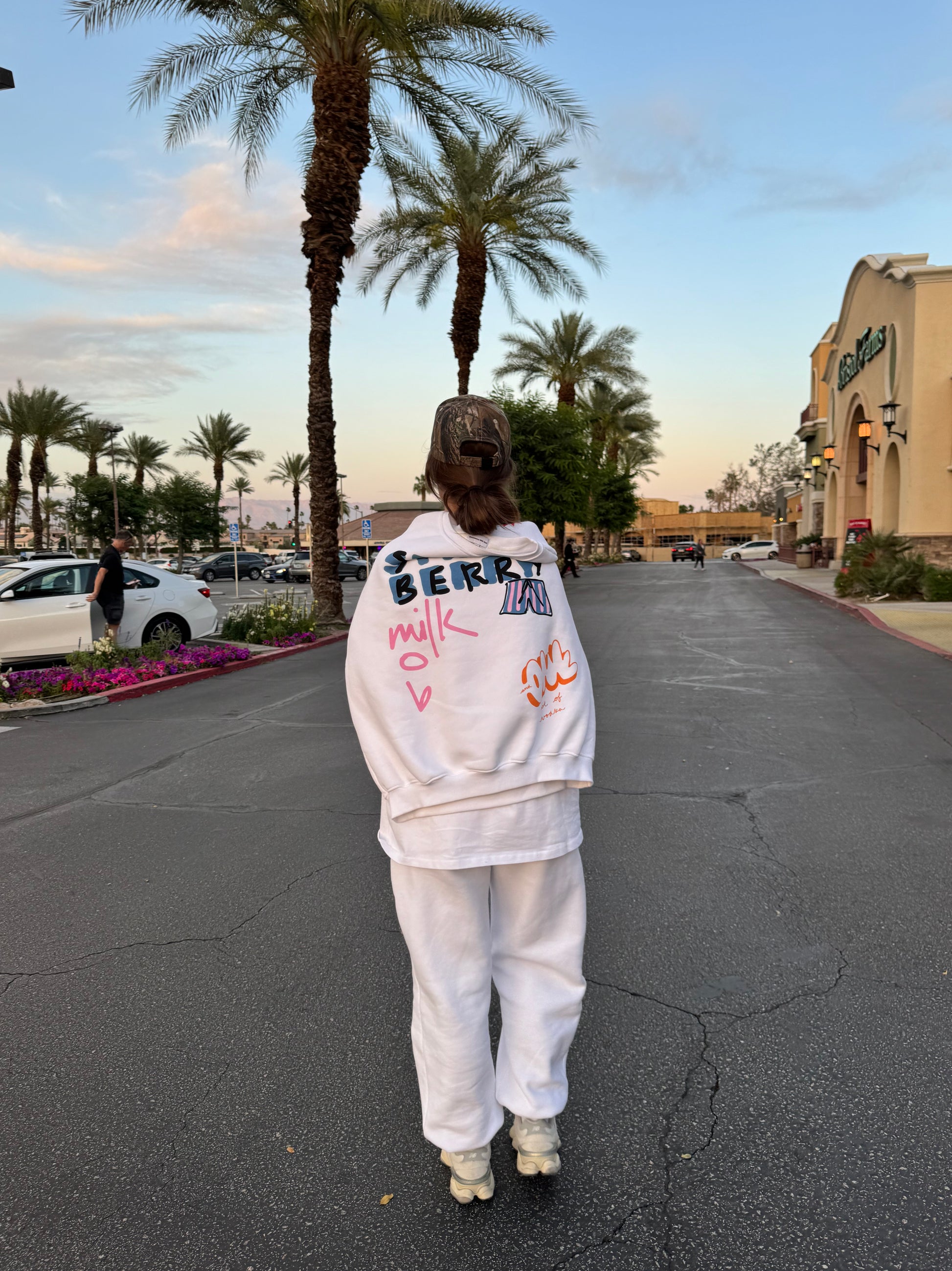 Make major moves in the Milkchella Sweatpant—your limited edition uniform for dancing 'til sunrise, crashing campfire hangouts, or just cozying up post-swim or festival. These crisp white sweats feature bold “Strawberry Milk Mob” graffiti-style lettering down the front leg and a cheeky little SMM pool-ball graphic right on the booty (because why not have a little fun back there?). Soft, plush, and made to match your Milkchella Crewneck and T-Shirt, these are the pants you’ll live in long after the lights go down.
