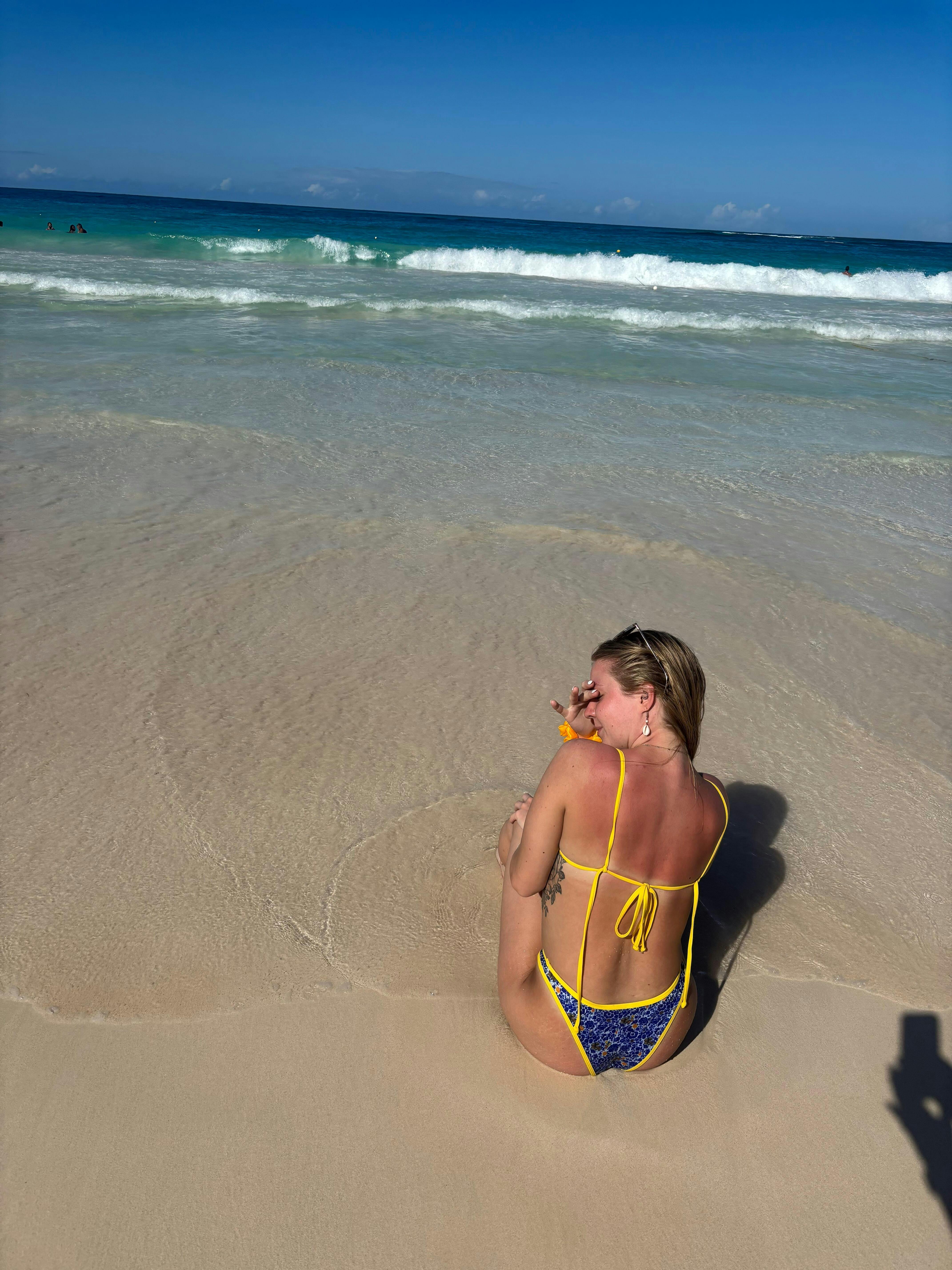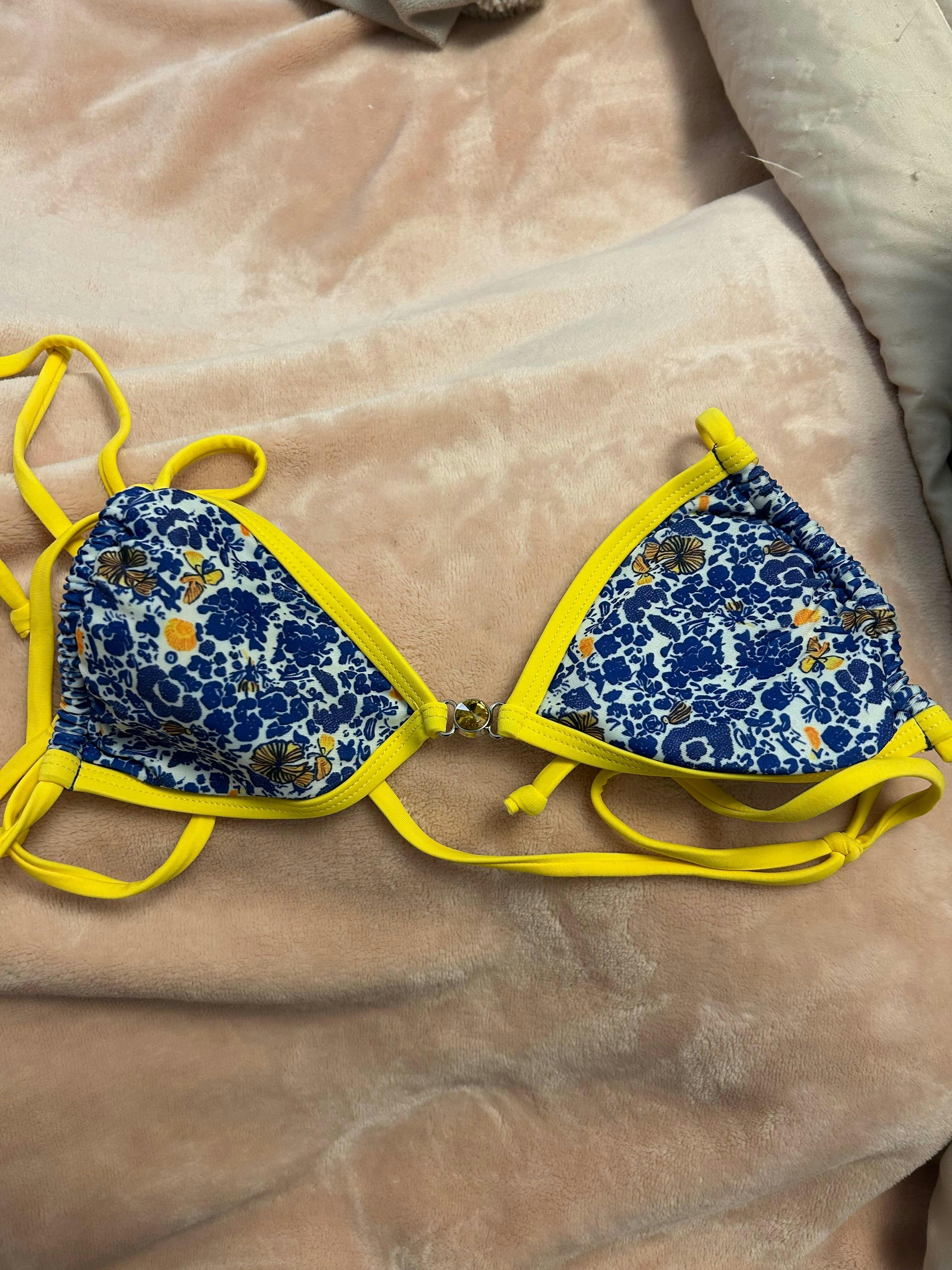 The Ophelia bikini top from our Mykonos collection is your new summer essential, radiating the vibrant hues of Greece with its blue, white, and yellow floral print. Accented with bright yellow lining and a sparkling yellow gemstone at the center, this top captures a playful yet elegant Mediterranean vibe. Adjustable string ties and removable padding allow for a custom fit, while the design, inspired by our best-selling Milky Way bikini, adds a unique charm to your beach or poolside look.