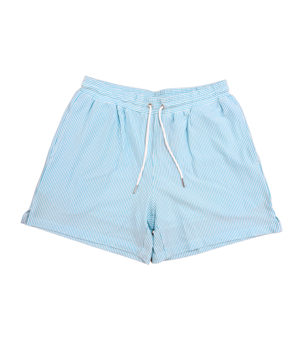 Soak up the sun in style with our SeaBob Short. This classic baby blue and white pinstriped short comes in seersucker fabric, giving them that laid-back, beachy vibe. The unique seersucker texture with bunched threads creates a subtly bubbled appearance, adding texture to your beach look. Designed for ultimate convenience and versatility, this short features two side pockets, including sneaky zipper compartments for your secrets, so you'll have plenty of room for your essentials. The tie-string waist ensures a personalized fit, while a small slit on the leg bottom adds a hint of detail. These shorts boast a 5.5-inch inseam, and feature double-lined fabric, making them the perfect balance between everyday loungewear and swimwear.