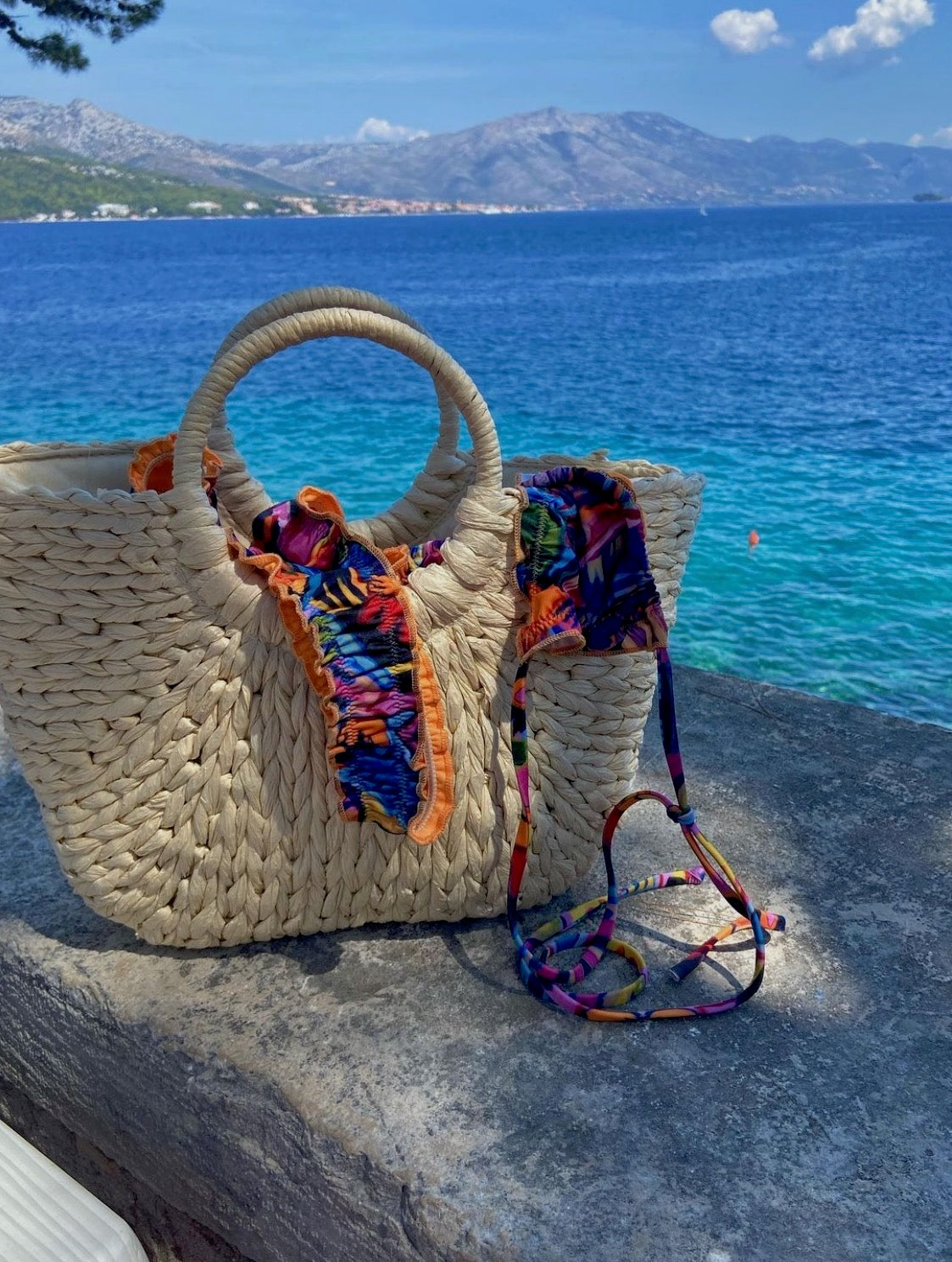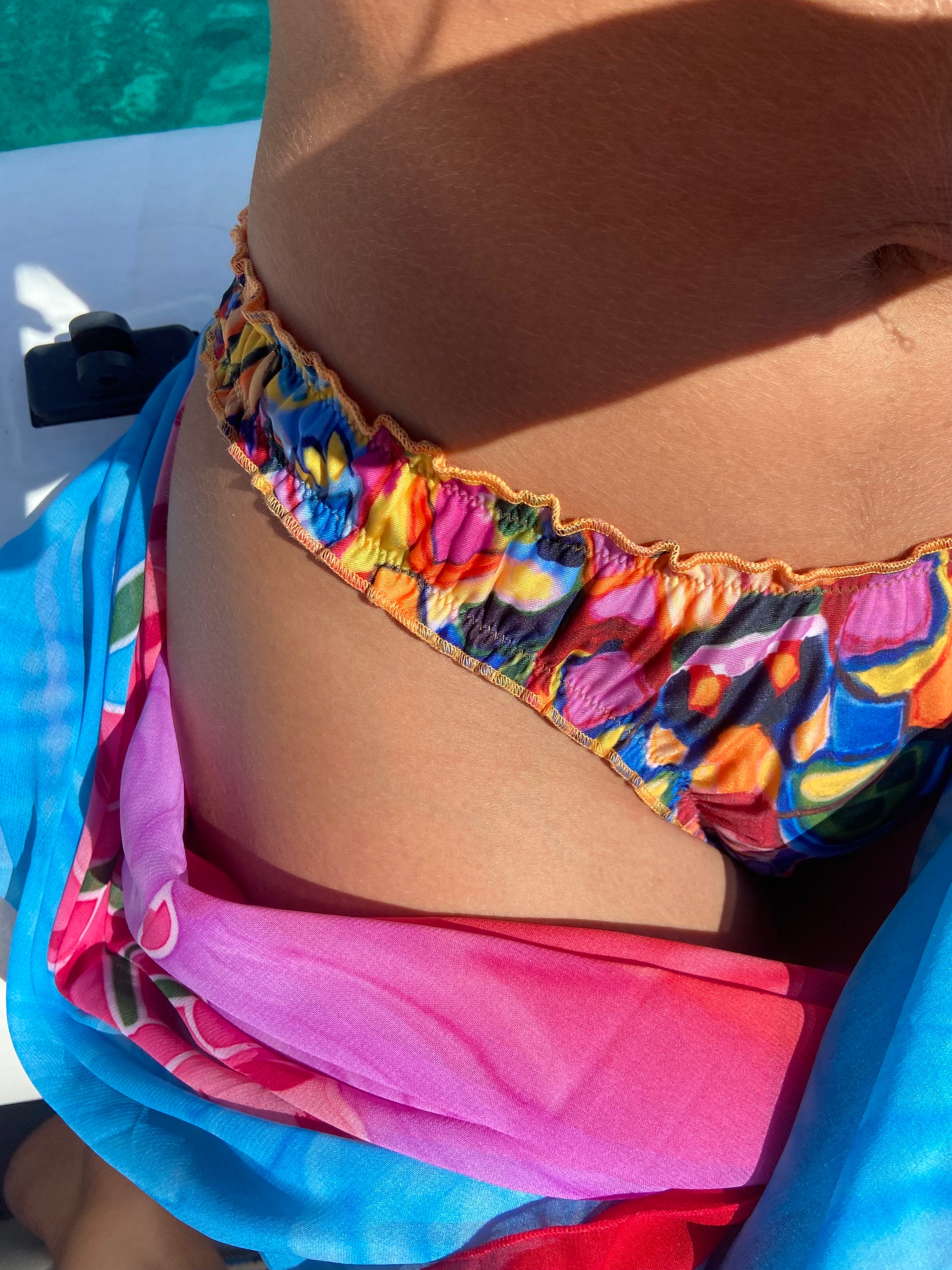 Discover vibrant beach vibes with our Sto Posto Dobro bikini, translating to "one hundred percent good" in Croatian. This bikini is a celebration of color and style, featuring a playful mix of hues and a charming ruffled lettuce hem with lots of stretch. Embracing natural comfort, this bikini boasts no padding, allowing you to revel in your authentic shape. With 4 adjustable strings that invite creative tying, it's your canvas for endless beachside looks. Embrace the sun-soaked days with Sto Posto Dobro and capture the essence of vibrant energy with every tie and twirl.