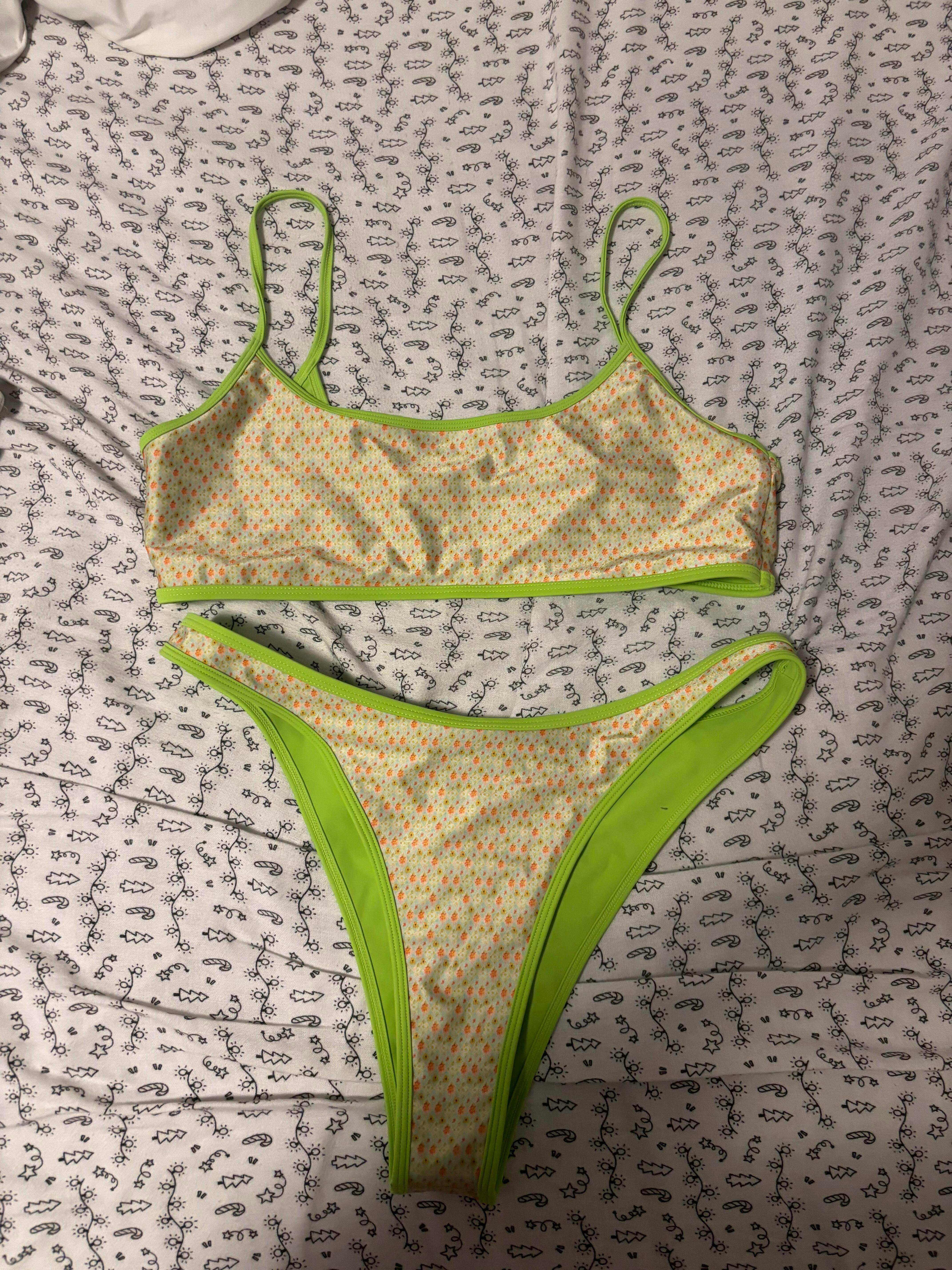 It's Tea Time! The Tea Party bikini top blends sweetness with sporty flair in a minimalist yet adorable silhouette. Designed in a soft yellow-cream base with vibrant orange and yellow florals and a fresh lime green lining, this bikini top brings a pop of color to any beach day. With a sports-bra style cut and non-adjustable straps, it offers a sleek, fuss-free fit and effortless comfort. Inspired by our popular Cento per Cento bikini top, this lightweight, unpadded bikini top lets you move freely while staying stylish. Ideal for those who love a balance of playful prints and athletic design.