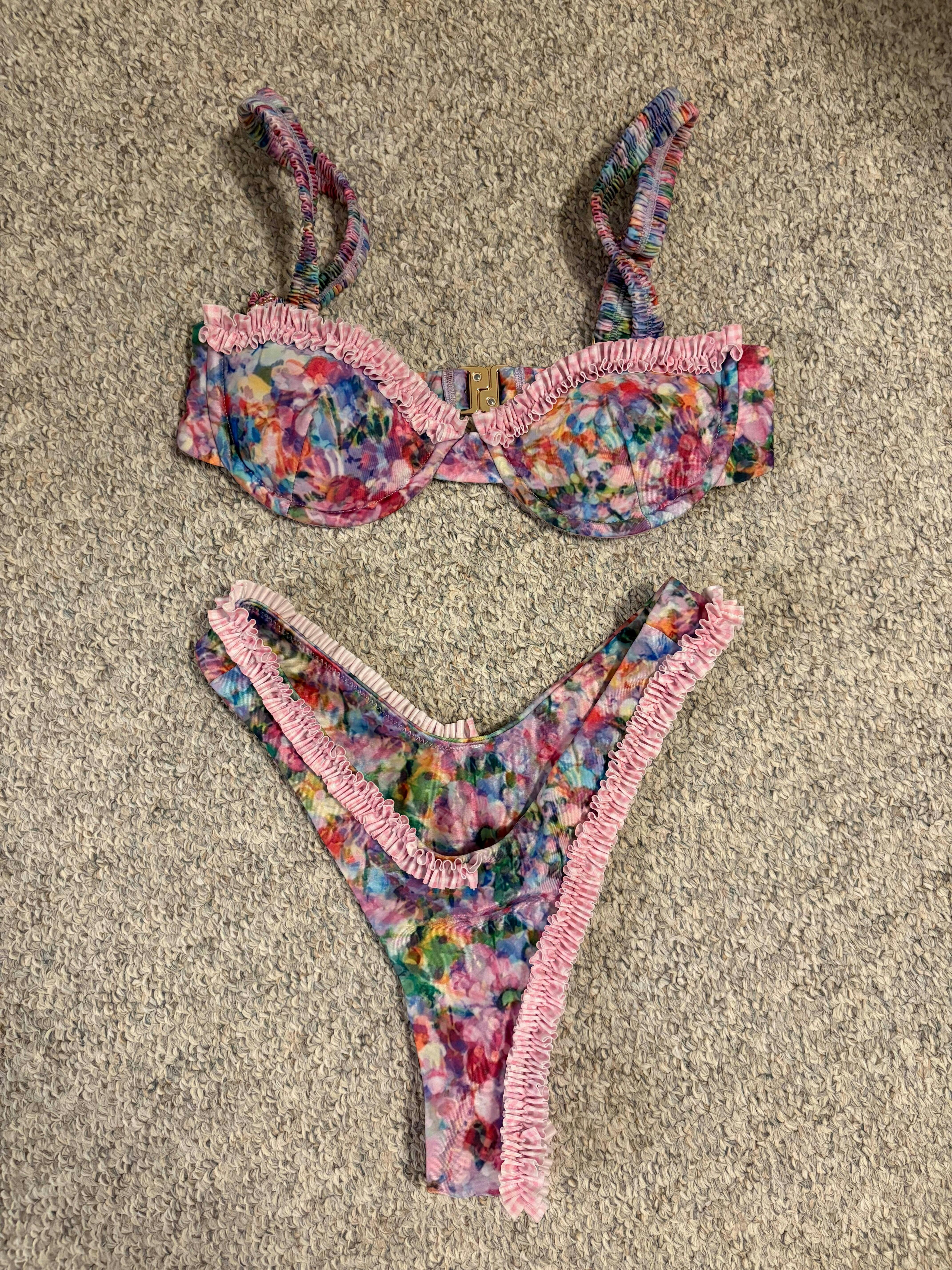 The Thumbelina bottoms are proof that even the smallest details can make the biggest impact. Designed in a pastel watercolor floral print, this cheeky, almost-thong cut brings the heat while keeping things sweet. A unique half-and-half ruffle trim adds a playful twist—one flirty frill on the front right hip, and another hugging the lower left leg for that perfectly unbalanced charm.