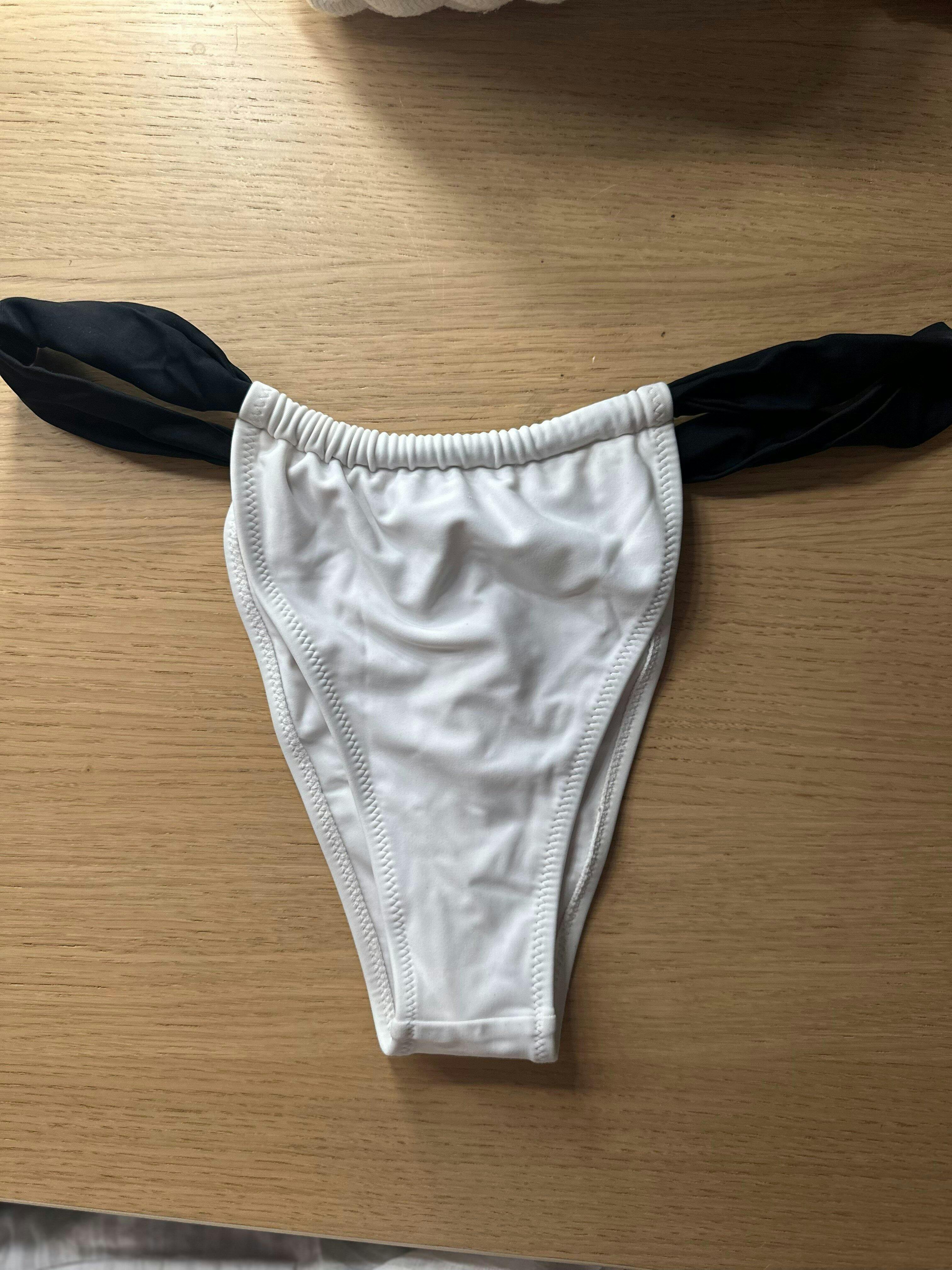 The Tuxedo bikini bottoms are a classic combination of black and white that's a testament to timeless charm. The all-white base is complemented by black side straps, creating a sleek contrast that's effortlessly stylish. Designed to fit true to size, and meant to be worn on your high hip, these bottoms are a reliable choice for embracing your curves. As our most popular bottom style, they offer a balance of cheeky to medium coverage, ensuring you feel confident and comfortable. The zig-zag stitching creates a comfortable and secure stretch, while the thick waistband ensures a snug fit that won't dig into your skin.