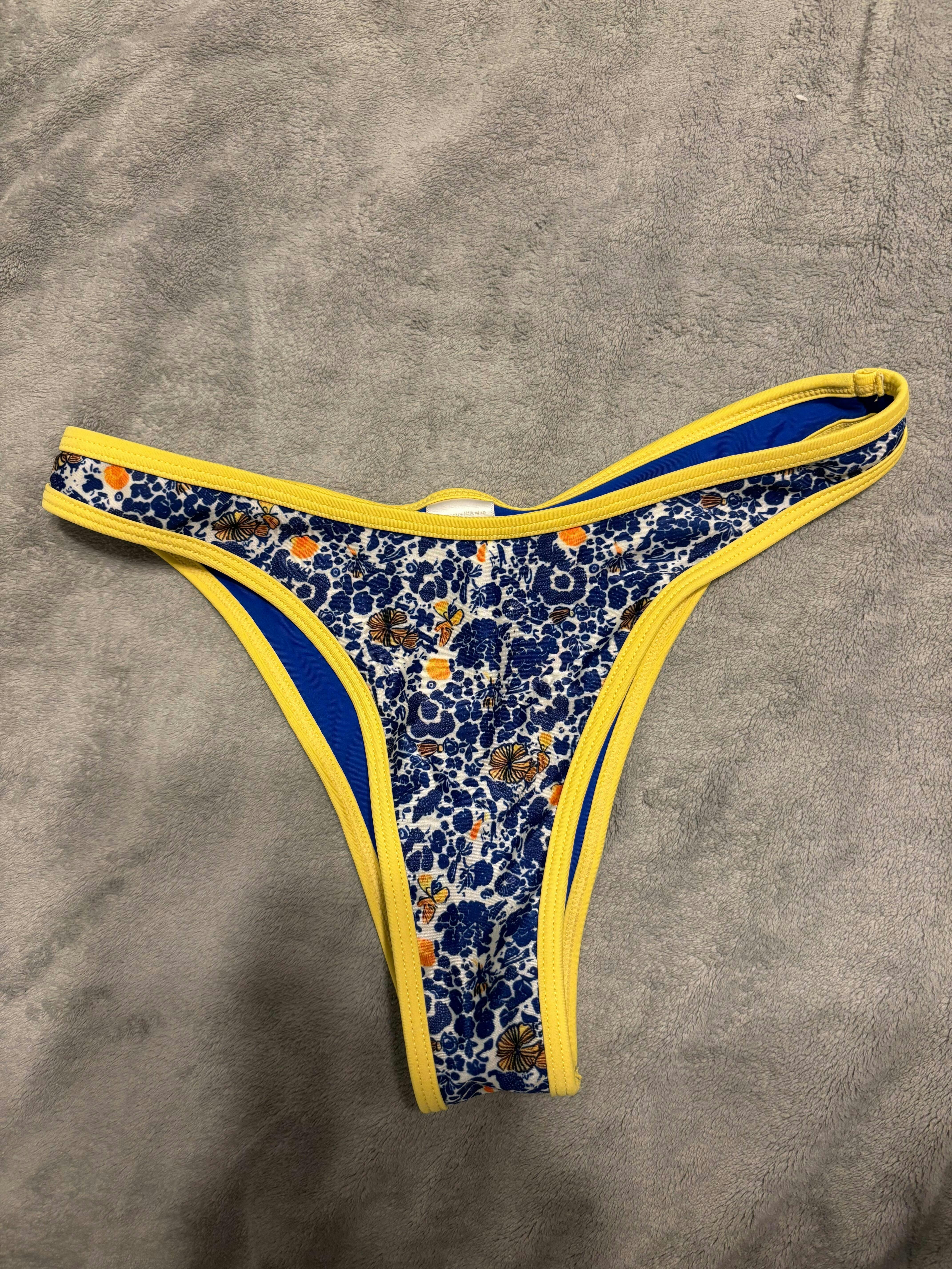 Channel the wisdom and beauty of the goddess herself with the Athena bikini bottom. Part of our Cento per Cento reversible collection, this floral print piece captures the essence of Greece with vibrant blue, white, and yellow blooms, while the reverse side flaunts a striking solid cobalt blue with yellow trim. With a cheeky cut and medium coverage, Athena is as practical as she is beautiful—perfect for every adventure.