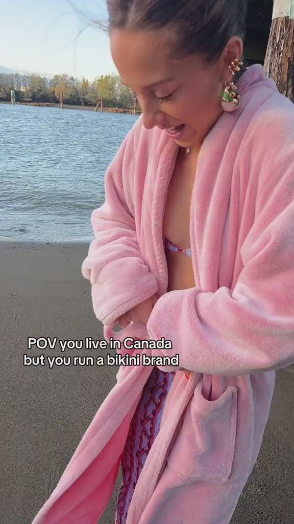 There's no better suit then your birthday suit right?! This year, the Mob is celebrating Georgia's birthday with a bang- a brand new design, rightfully named after the occasion. This bikini top features a beautiful blend of blues and burgundy, in a striking geometric print. No padding and a tie bow in the back makes it adjustable for maximum comfort. The thick straps and unique cup shape are our favorite yet. We love it so much, we could cry....and you know what they say, "It's my party and I'll cry If I want to"!