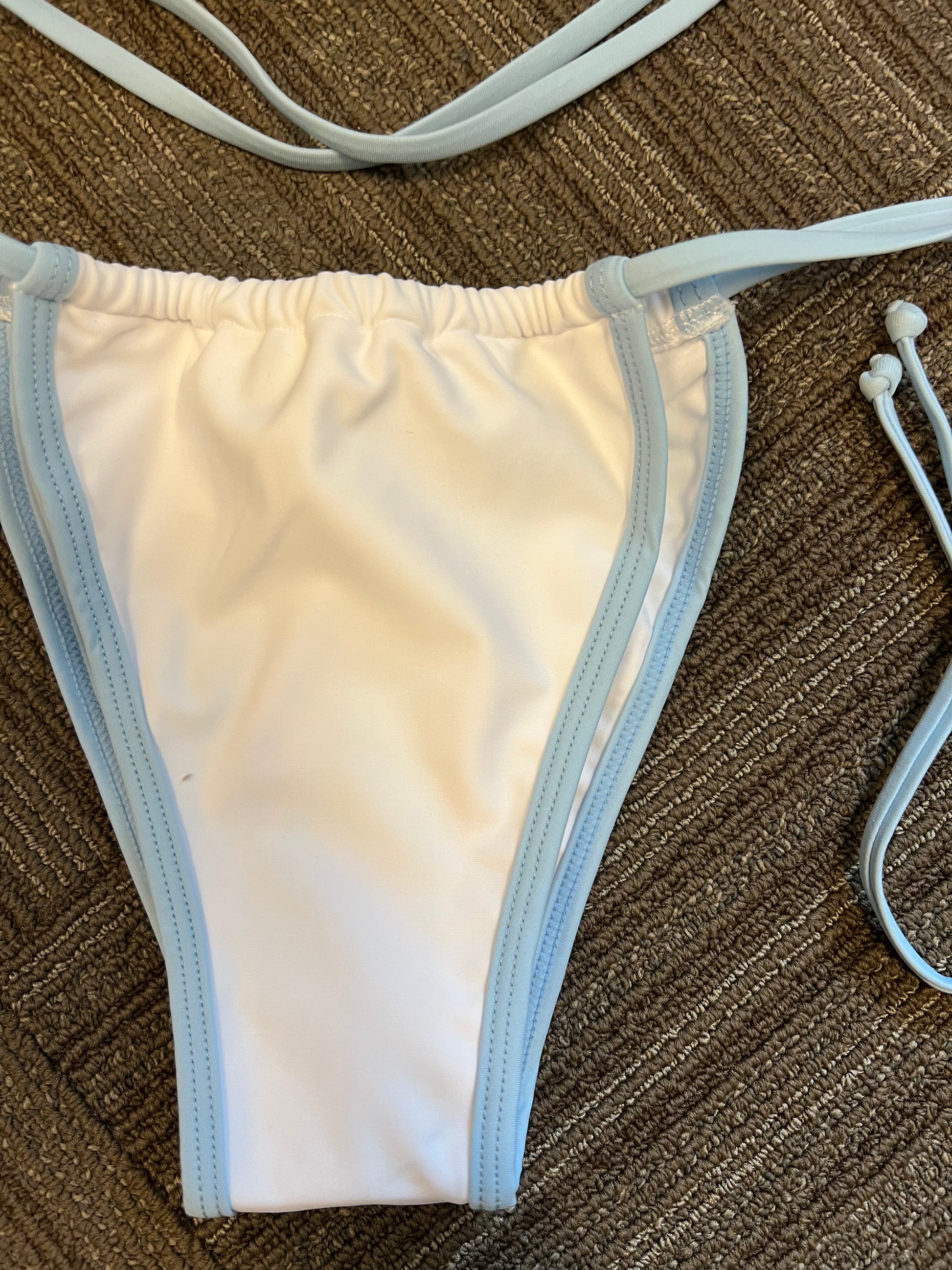 Complement the artistic flair of the Coconuts Design bikini top with our elegantly simple bottoms – an all-white canvas with light blue hems and ties that lets Coconut's stickman creation shine as the star. Designed with string adjustable ties, these bottoms offer a customizable fit that adapts to your comfort. Embracing a medium bum coverage, they strike the perfect balance between playfulness and confidence. True to size, they ensure a secure and comfortable fit for your beach adventures. With understated elegance, the Coconuts Design bottoms enhance your beach look while allowing the stickman top to take center stage.