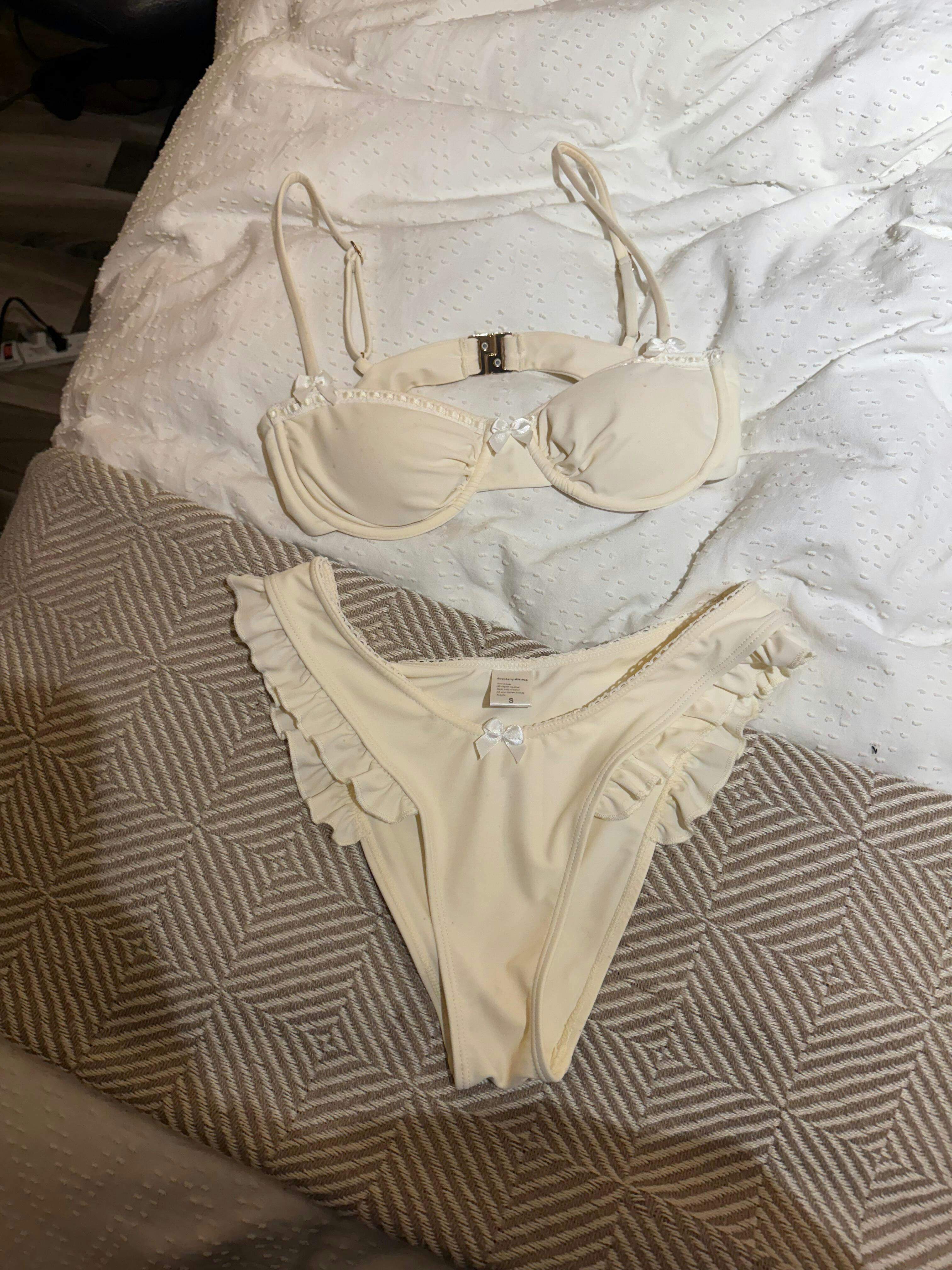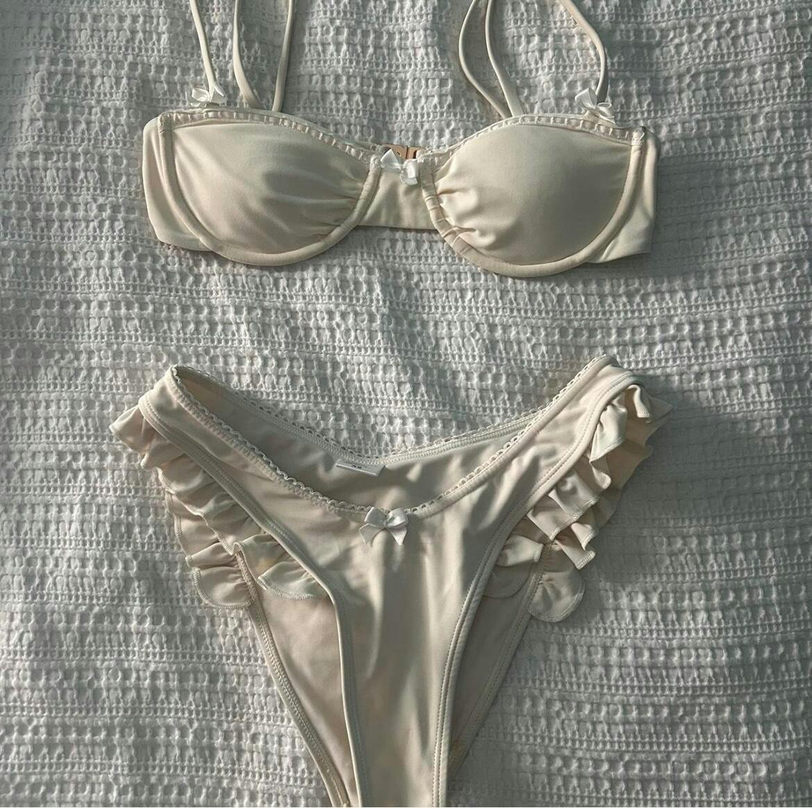 My cutest and most worn bikini!! Not cheeky at all, so flattering. I love the ruffles and the little bow detail. Such high quality. I wear size small!
