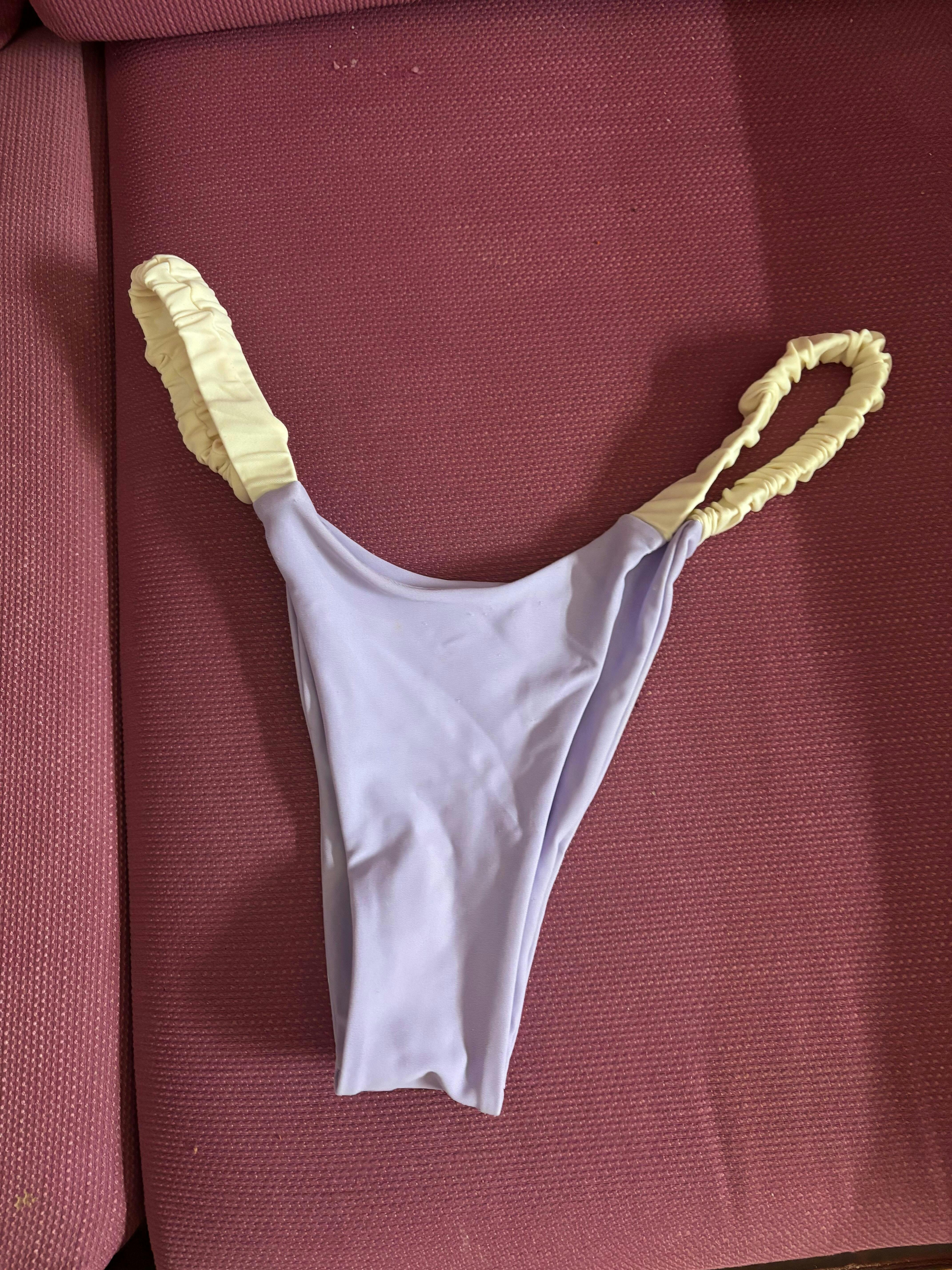 The grape vine bottoms joins our iconic “Sporty” bikini collection to create the most perfect elegant bikini. These bottoms feature a scrunched thicker stretch strap that is meant to be worn high on the hip to produce the most comfortable bikini bottom. The cream and purple colorblocking is the perfect way to add some style and flair to your look! Be sure to turn heads in this cheeky eye-catching lavender bottom;)