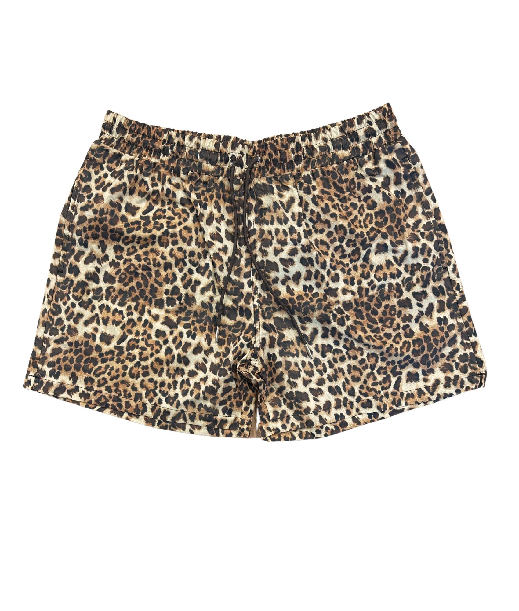 Stand out in style with the Kit Kat men's swim shorts—a purrfectly bold choice for any adventure! These bronze, brown, and black leopard print shorts will have you spotted as the life of the pool party (or the beach)! With a comfy 5.5" inseam and a tie-string waist, they’re crafted for a paw-some fit that’s just right. No annoying mesh lining here, just pure freedom to prowl. Plus, with two side pockets featuring secret zippers and a back pocket, your essentials stay safe and snug while you soak up the sun.
