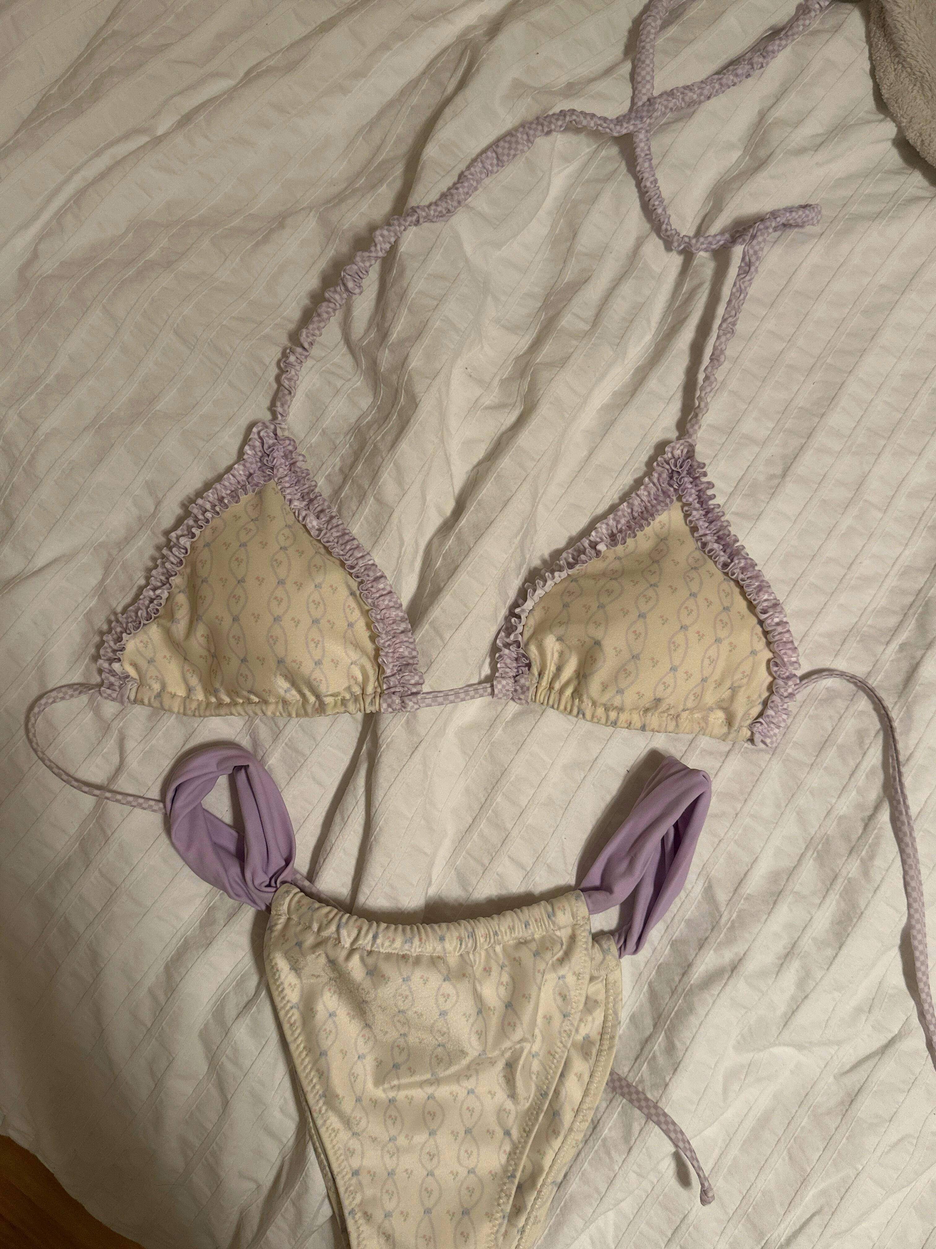 Sip the sweetness of our Limoncello Bikini Top. This creamy light yellow beauty features a splash of delicate florals and topped with a flirty ruffle lavender trim around the cups. With adjustable lavender scrunch-straps that tie at the neck and back, PLUS removable padding, it’s a perfectly customizable and comfortable fit.