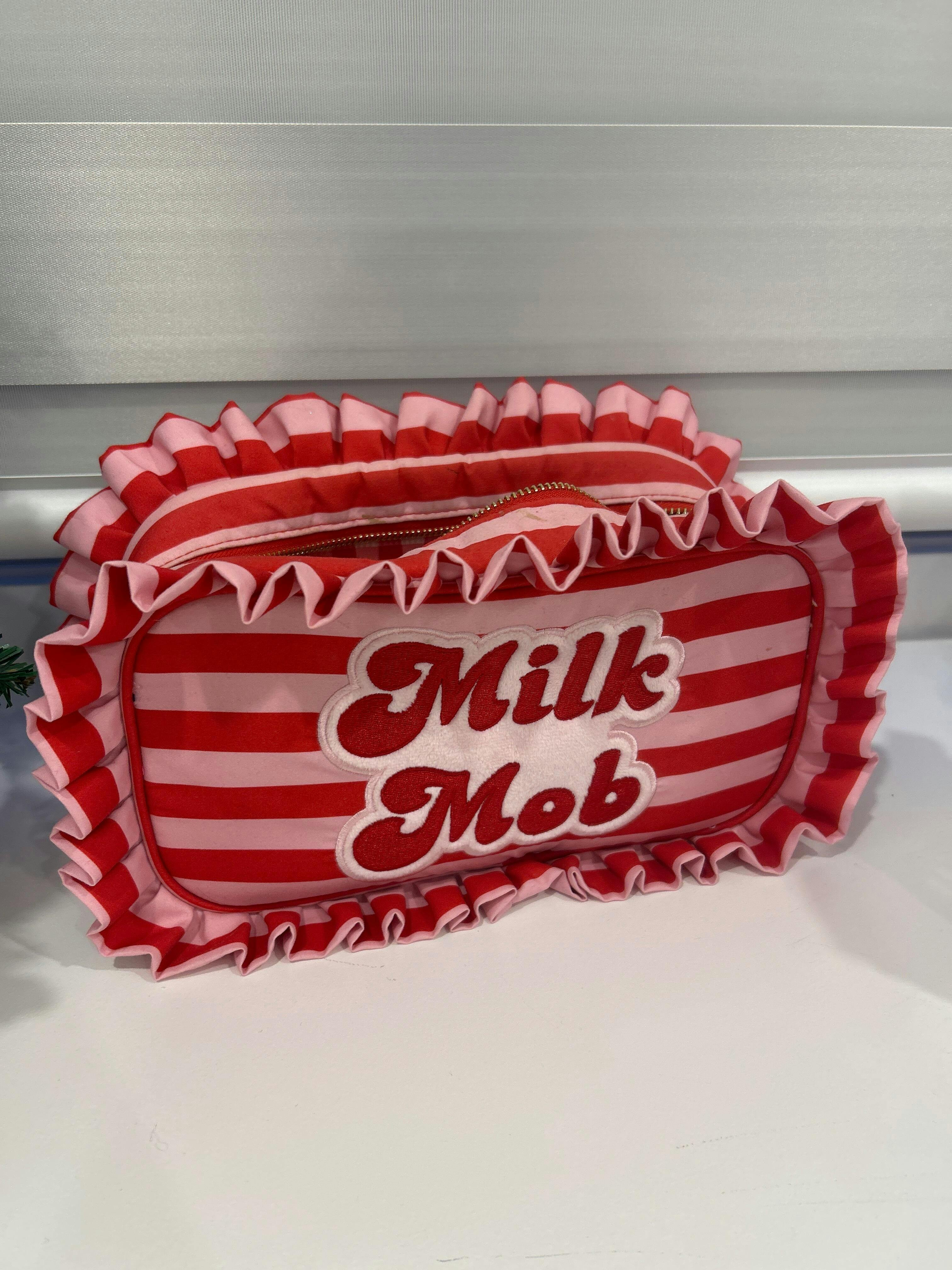 Meet Milkchella—the boldest beauty bag in your lineup! Featuring vibrant red and pink stripes, flirty ruffle edges, and signature Milk Mob stitching, this cosmetic bag is made to stand out. Whether you're stashing daily essentials or packing for a weekend escape to the Coachella Valley, Milkchella Cosmetic Bag brings playful charm and practical style wherever you go. Choose from two sizes!