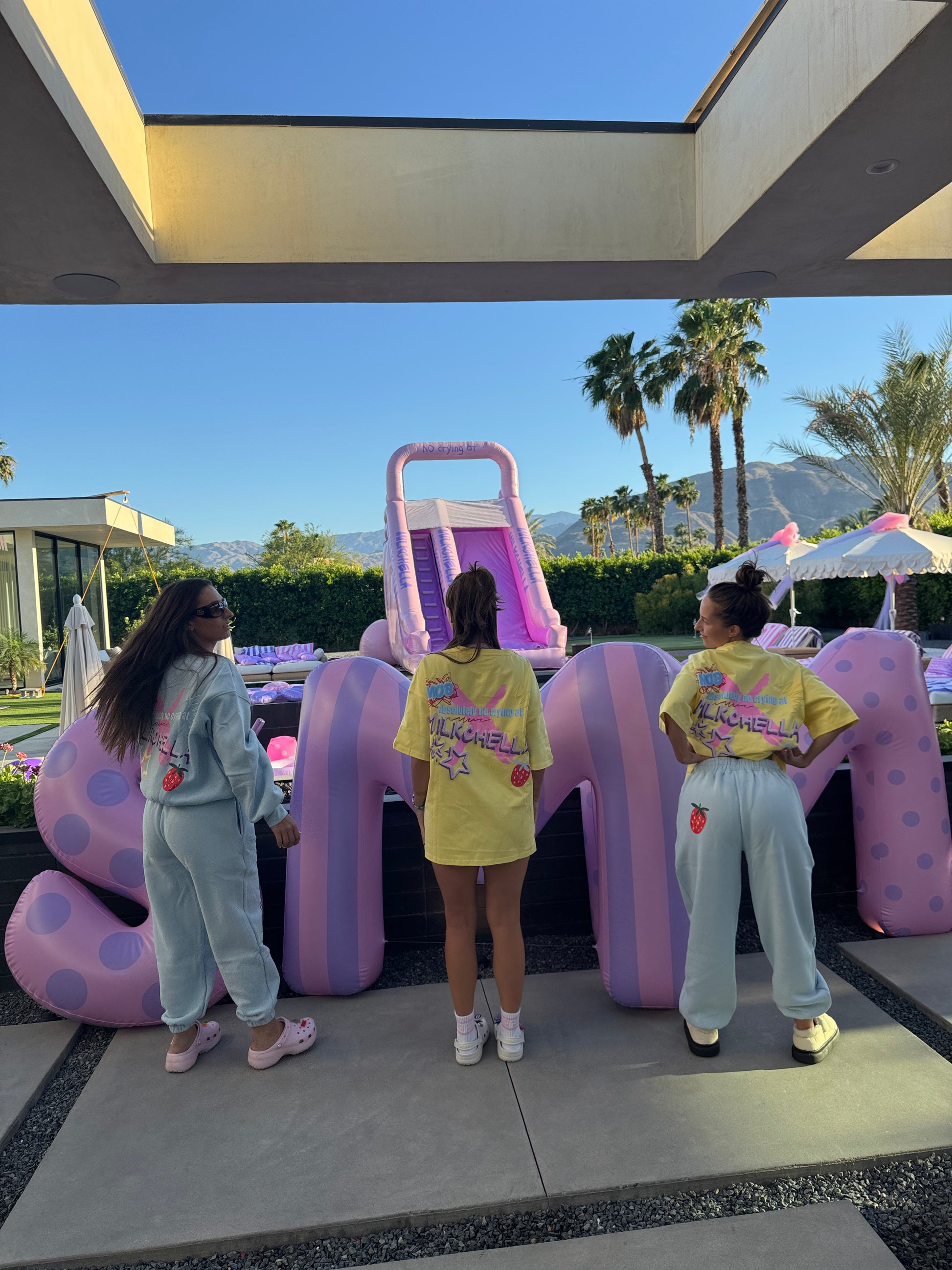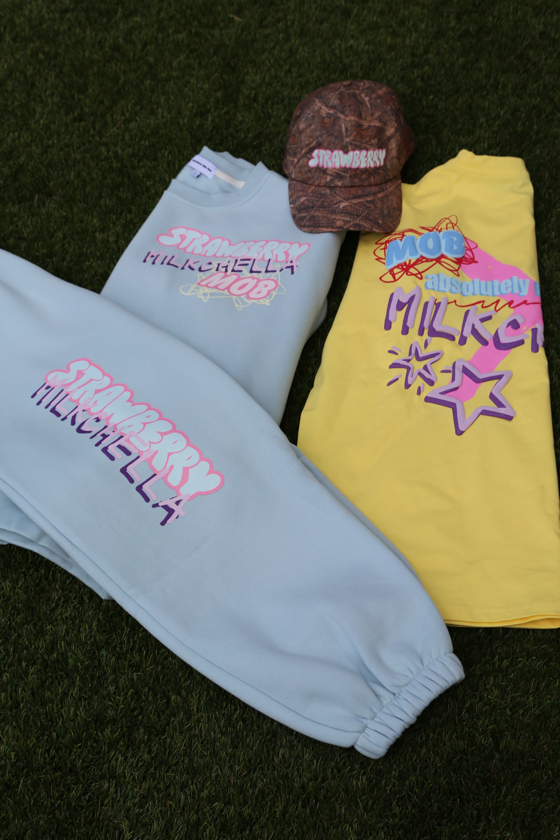 Step into the moment with the Milkchella Sweatpant—your limited-edition staple for sunrise dancing, late-night hangs, and everything in between. Designed in light blue with bold “Strawberry Milkchella” graffiti-style lettering down the leg, plus an iconic SMM “ABSOLUTELY NO CRYING AT MILKCHELLA” graphic on the back for a little unexpected edge. Ultra-soft, plush, and made to match your Milkchella Crewneck and T-Shirt, these are the sweats you won’t want to take off—even after the festival’s over.