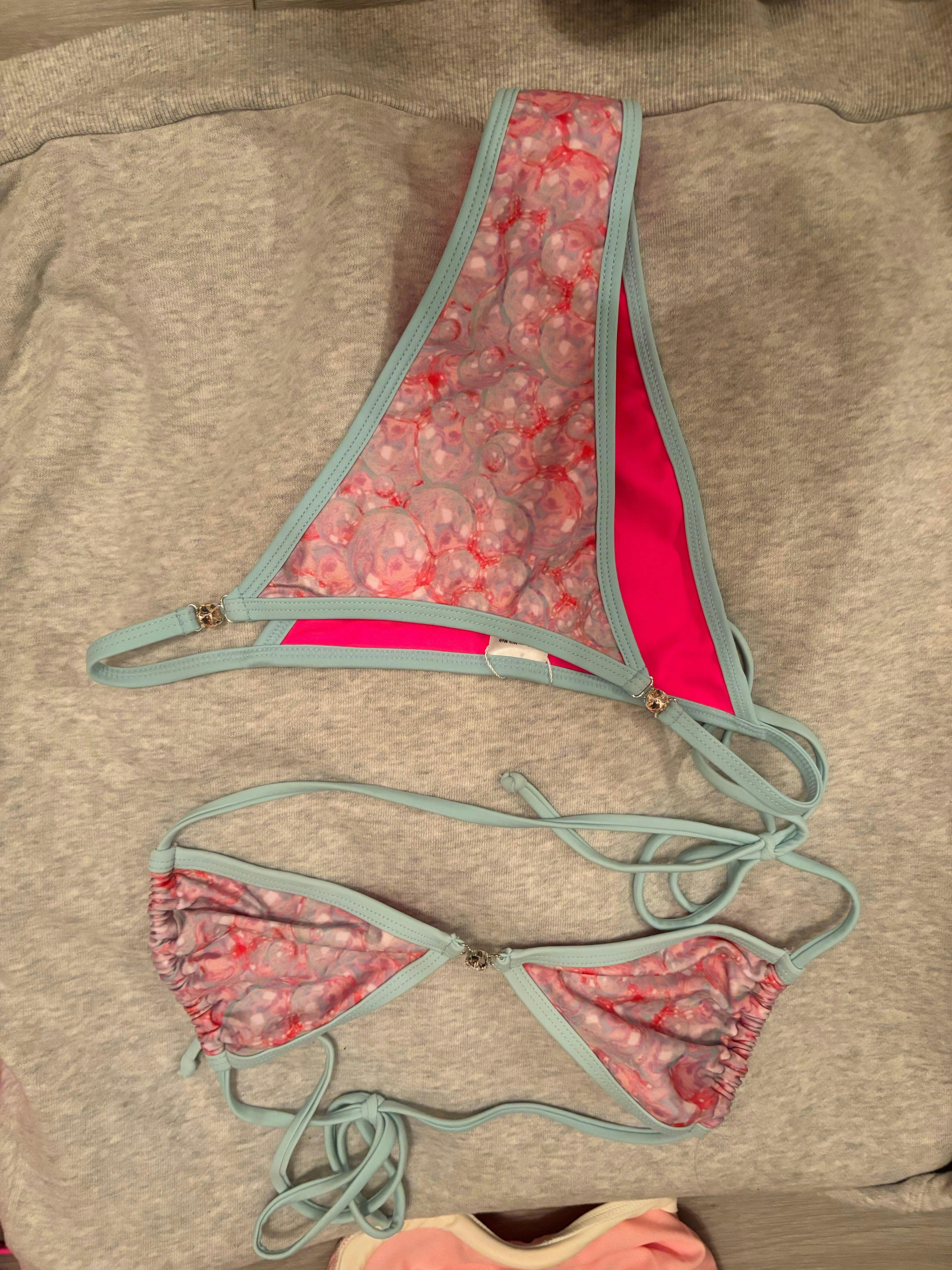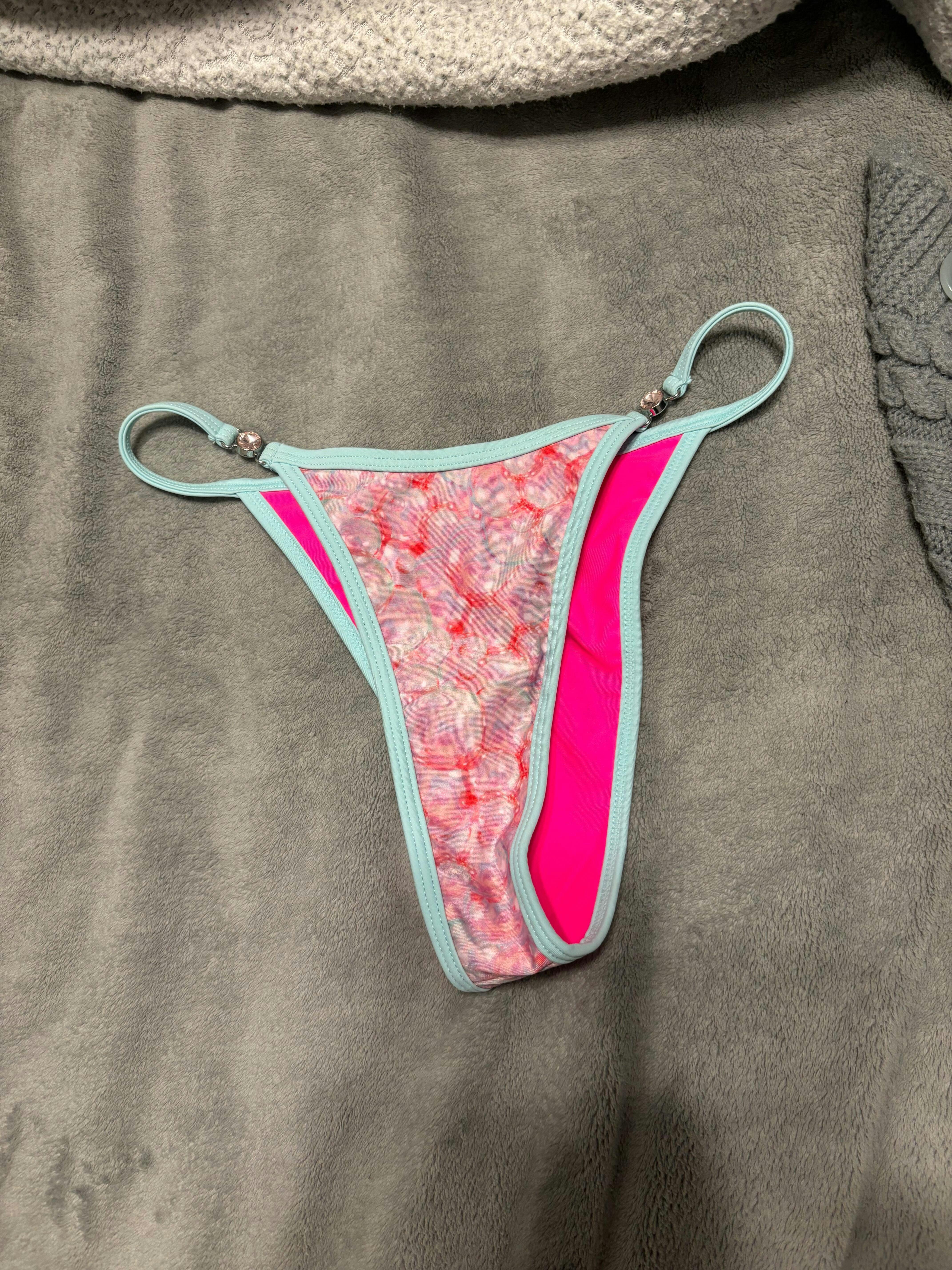 Make a stellar impression at the beach or poolside with our Milky Way Bikini, where style and sophistication collide in a celestial dance. Adorned with an abstract print of pink and purple bubbles and accented with aqua blue trim, these bottoms radiate playful sophistication. The spotlight feature? Delicate baby pink diamonds on each side of the hips. Designed for comfort and versatility, these bottoms offer a snug fit while allowing freedom of movement. The bottoms are not adjustable. Medium coverage cheeky