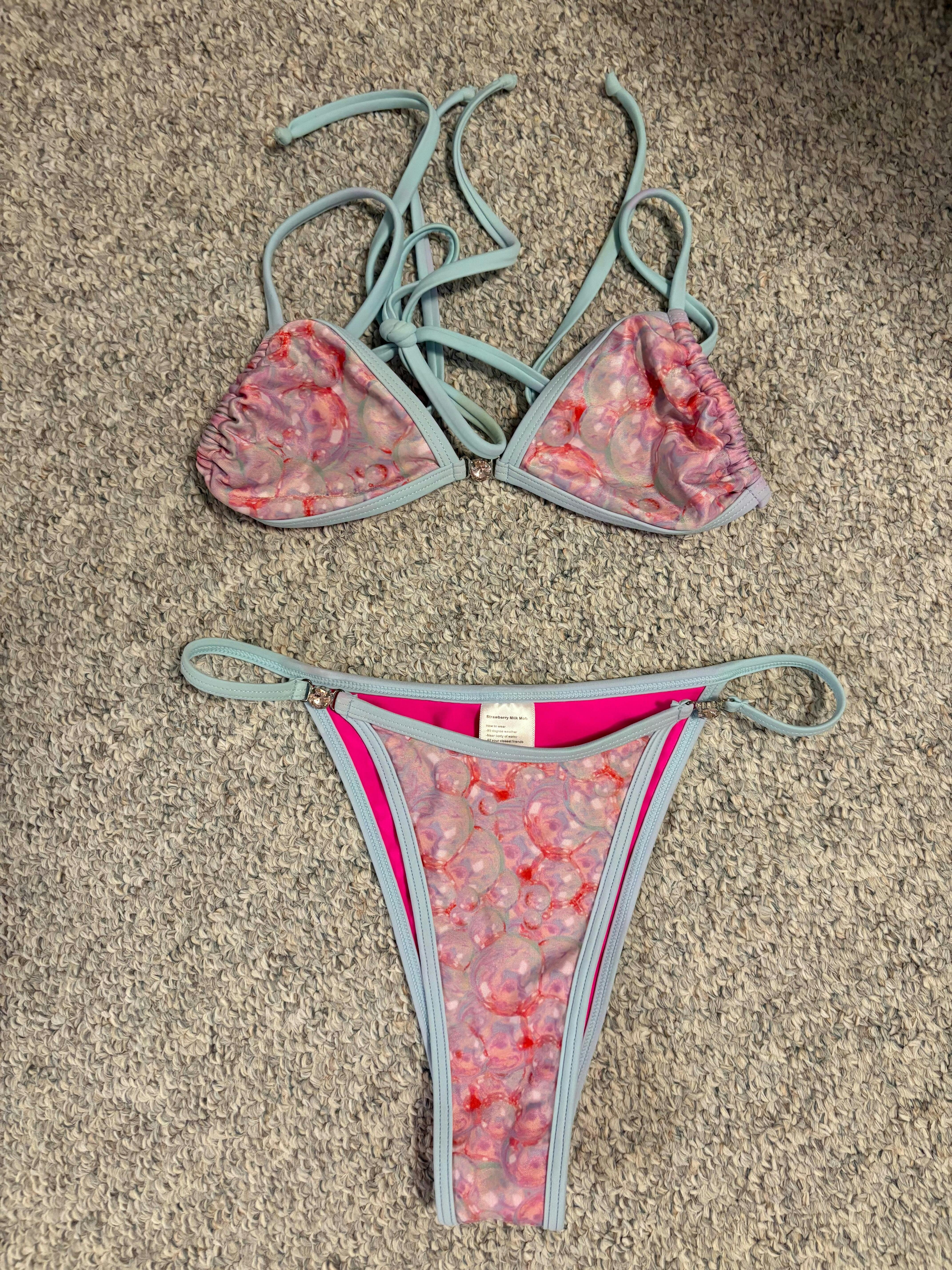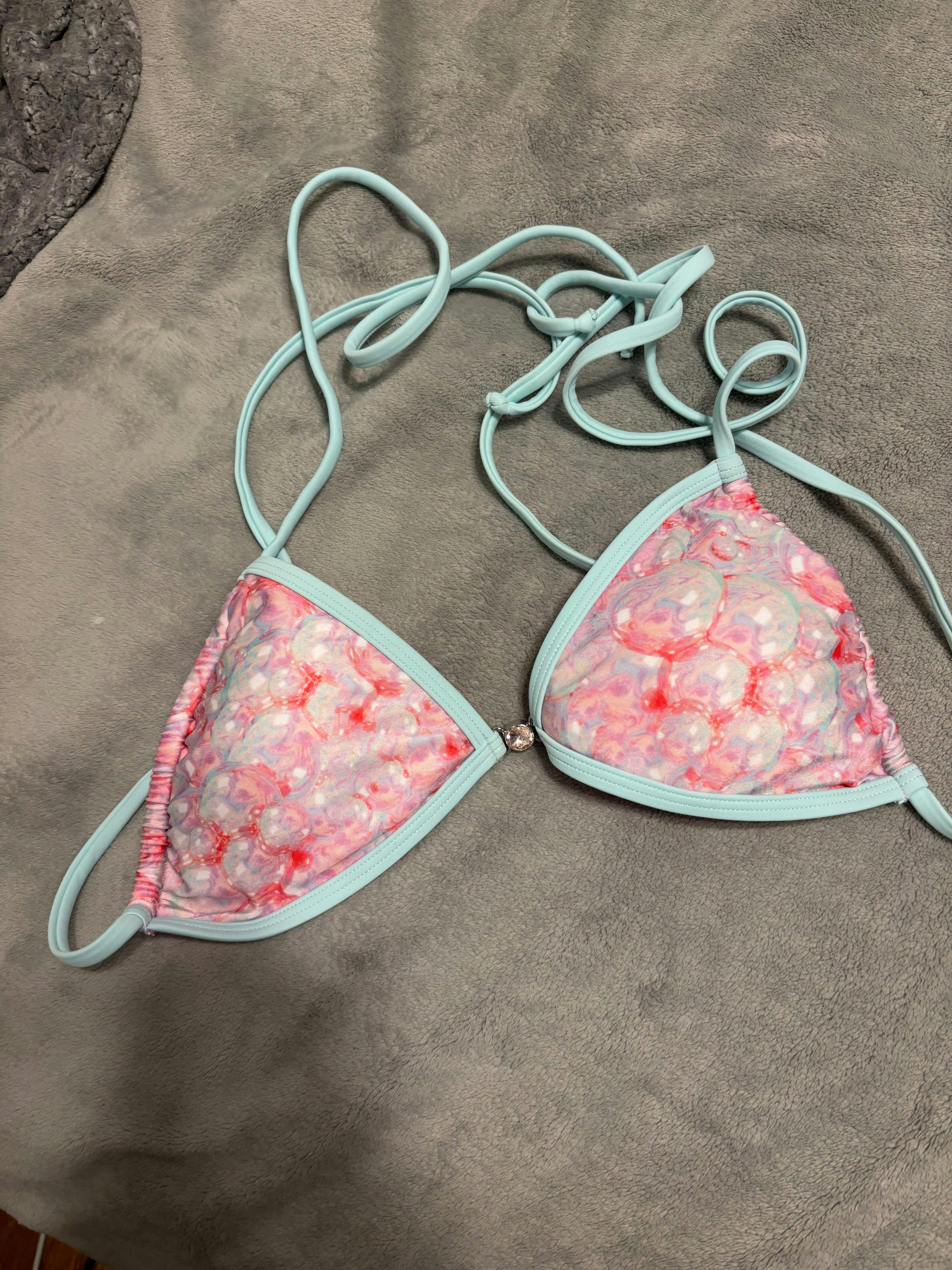 Like a celestial spectacle streaking across the night sky, our Milky Way Bikini commands attention with its captivating design. Featuring an abstract print of pink and purple bubbles and adorned with aqua blue trim and shoulder straps, and a delicate baby pink diamond center, this bikini top embodies cosmic elegance. Offering adjustable halter or over-the-shoulder string ties and removable padding for personalized comfort, it ensures versatility and support. However, please note that the overall fit runs small, so be sure to size up for the perfect fit.