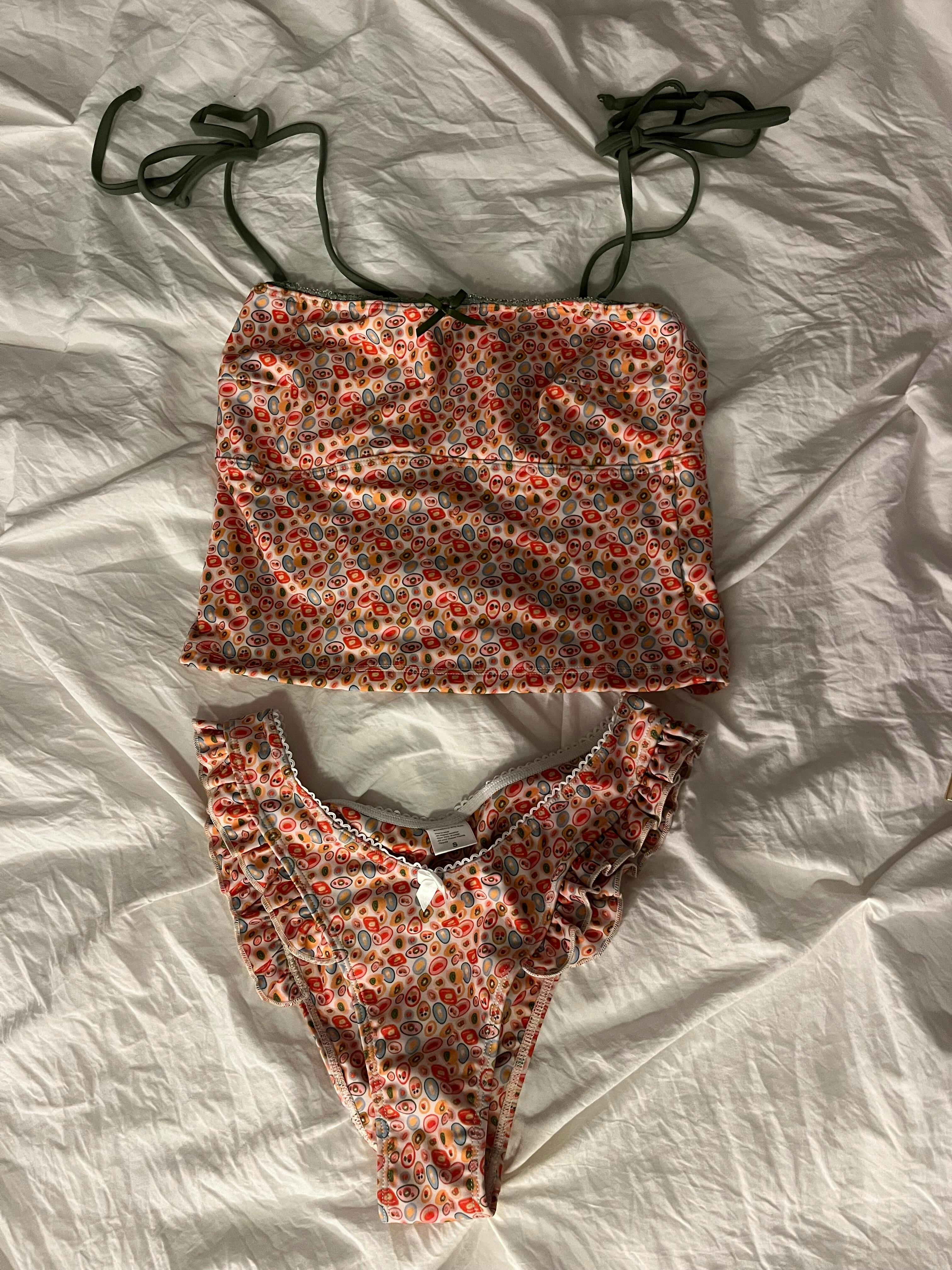 Meet the Orchard Tankini Top from Strawberry Milk Mob – the perfect blend of sweet style and beach-ready charm! This first-ever tankini by SMM features a playful orange bubble abstract print that pops against elegant olive green spaghetti straps. With its olive lace hem, a dainty center bow, and no-padding design, Orchard adds a dash of playful chic to any beach or casual outing. Designed to flatter without fuss, this tank-top-style tankini combines comfort and class, proving that modest truly can be the hottest.
