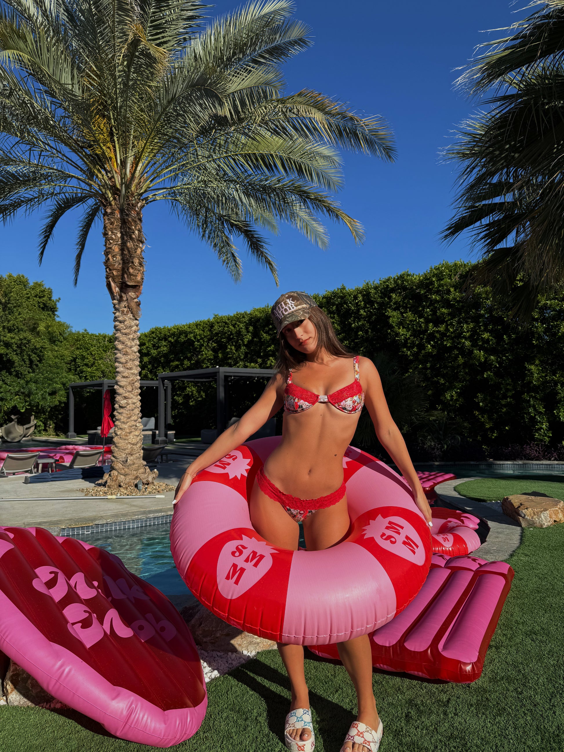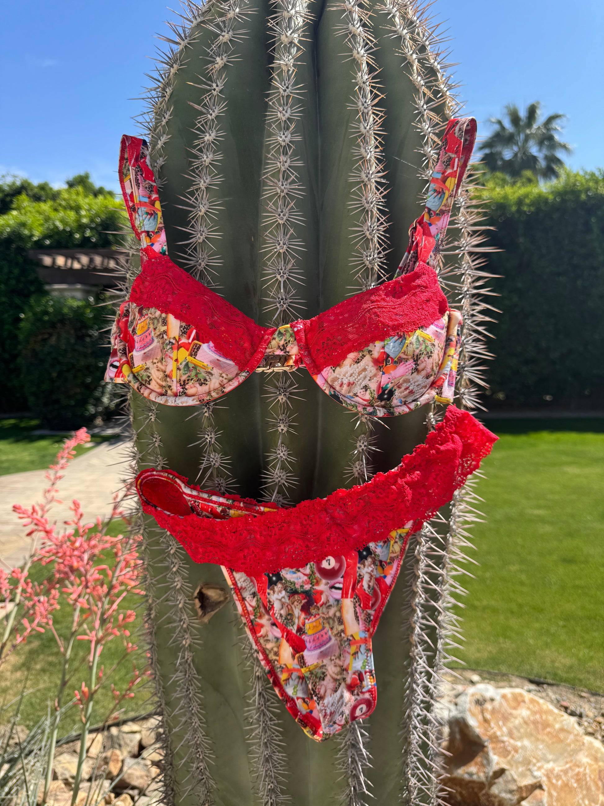Poker Face Bikini Top is a high-stakes stunner made for the bold. Featuring a Vegas-inspired print and sultry red lace overlay on the wired cups, this top blurs the line between swimwear and lingerie. With adjustable shoulder straps, supportive underwire, a gold metal clasp-back, and removable padding, it's designed to flatter every hand you're dealt. Whether you're poolside or playing to win, this top keeps your look fierce, flirty, and impossible to bluff.