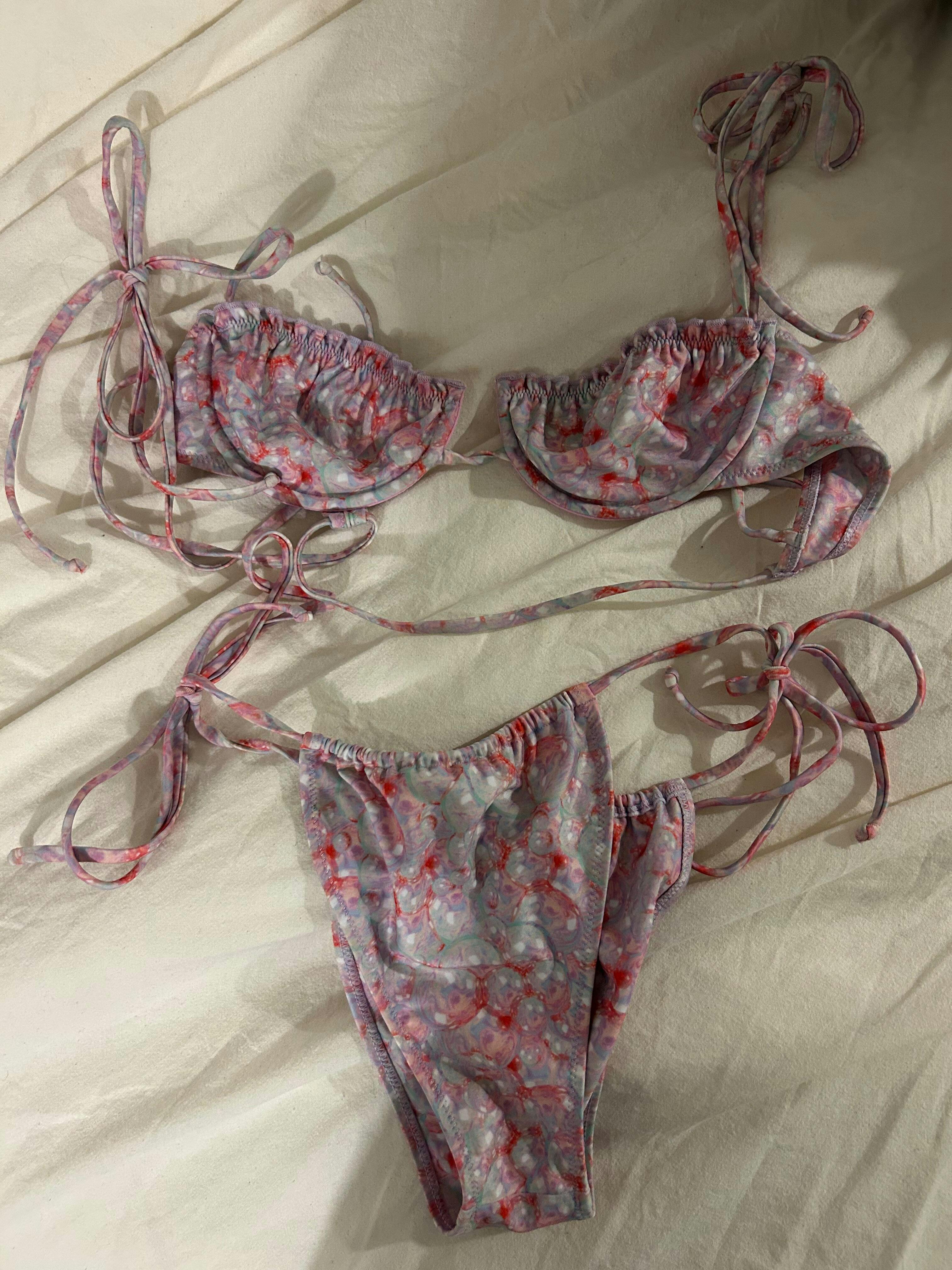 Introducing Rainbow Fish, a whimsical nod to our favorite childhood fish book. With hues of purple and pink bubbles adorning its print and cute frills topping the cups, this top captures the magic of underwater adventures. While the top fits true to size, it's tailored for those with smaller busts, offering minimal support. However, adjustable string ties ensure a snug fit. Dive into nostalgia and shine like the Rainbow Fish this swim season.