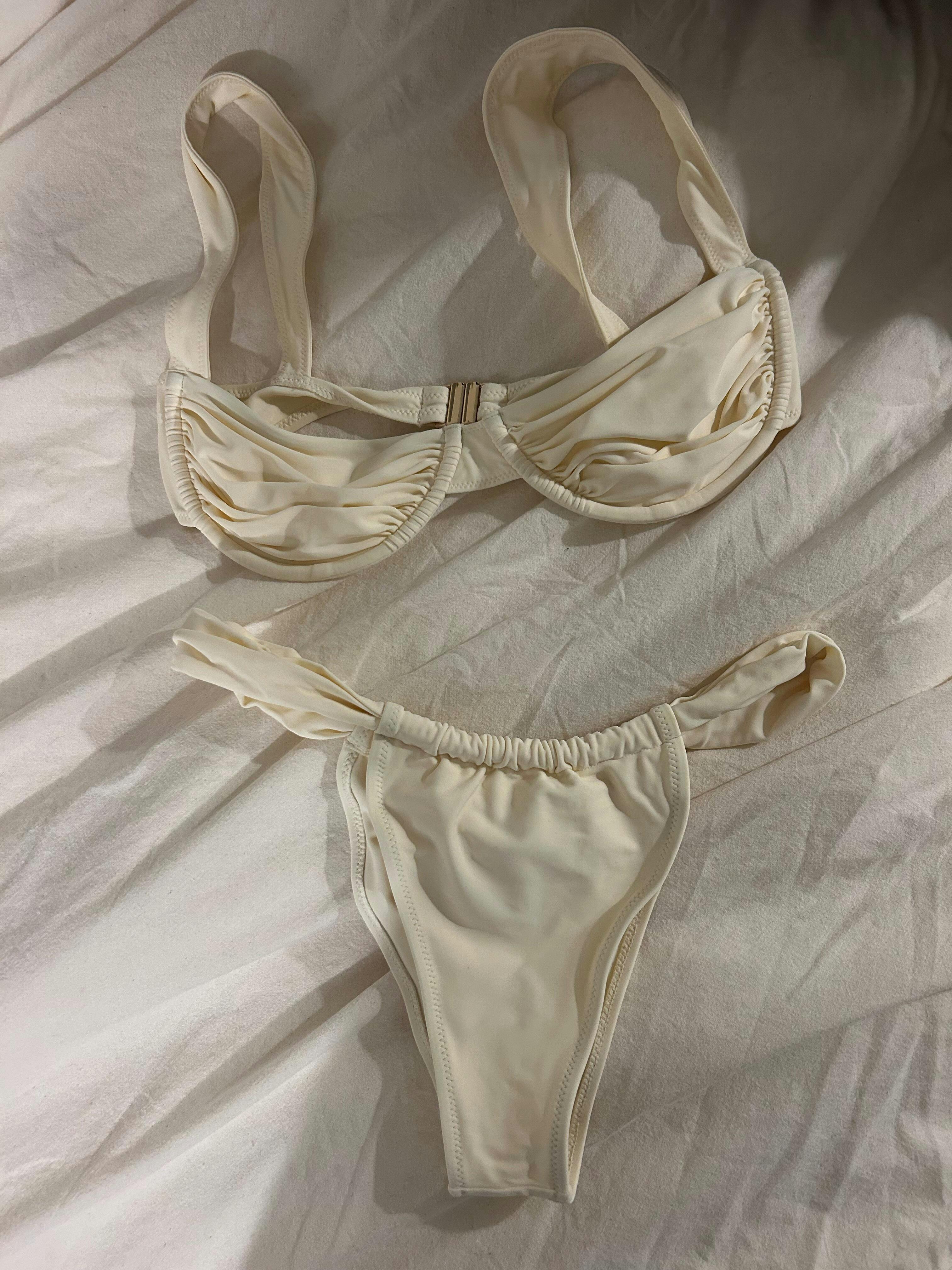 Indulge in the art of relaxation with our Dolce far Niente bikini top, a serene embodiment of the "Sweetness of Doing Nothing." Designed in an alluring cream-colored shade, this bikini top captures the essence of tranquility. Designed to fit generously, the spacious cups ensure a comfortable embrace. Padded yet removable, it's customizable to suit your preference A secure metal clasp at the back adds a touch of elegance, while the structured metal wiring shape provides support and shaping. With non-adjustable straps, this top blends minimalism and sophistication for an effortlessly chic beachside look that embodies the beauty of leisure.