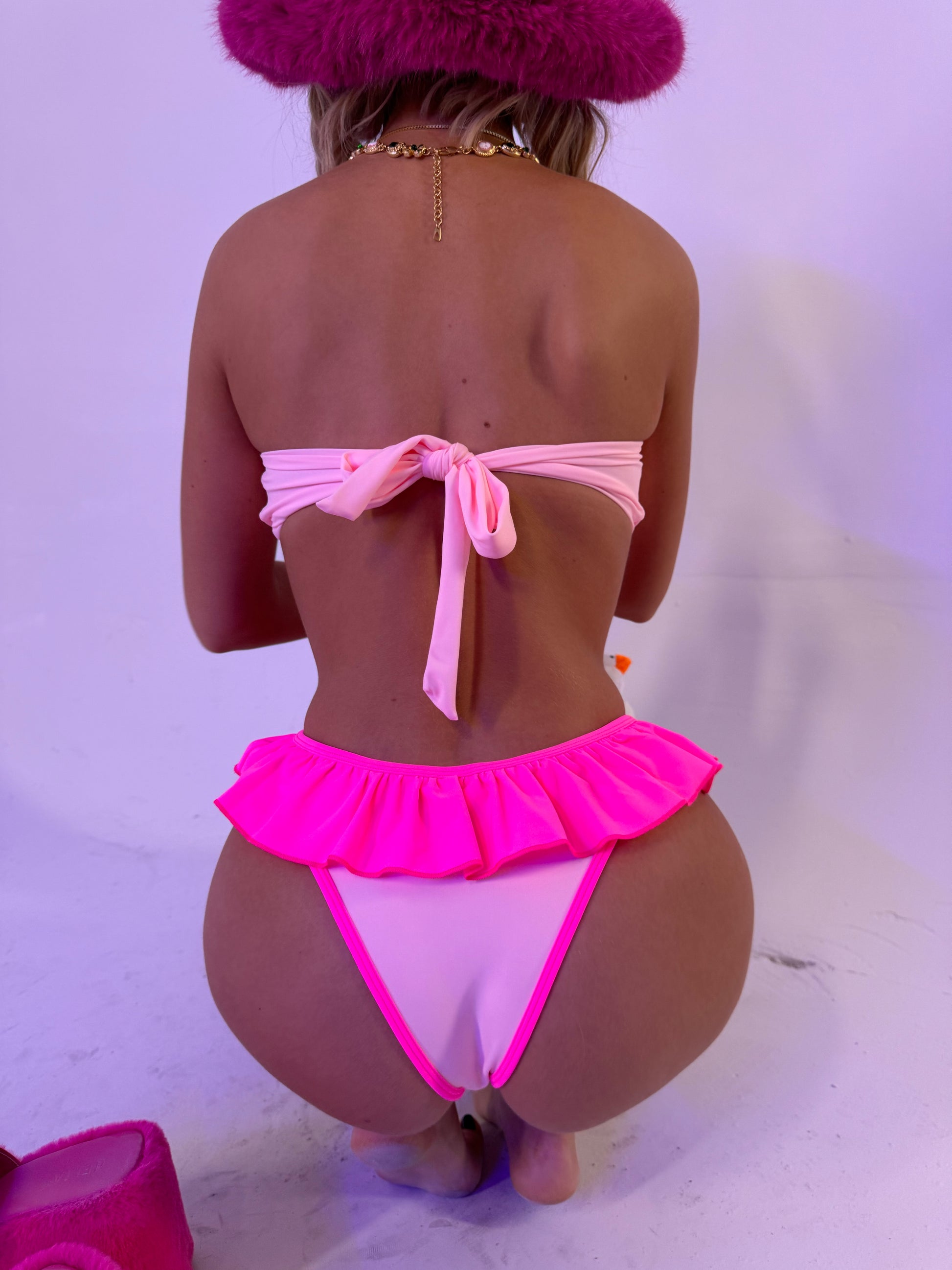 Twirl into Scorpio Season with our Scorpio Smooch Bikini Bottom! Perfect for celebrating Georgia's November birthday, this limited-edition piece combines a flirty two-tone color block of soft baby pink and fierce hot pink, topped with a ballerina-inspired tutu ruffle that feels as playful as it looks. With a cheeky coverage fit and an adorable center bow, Scorpio Smooch is the ultimate blend of cute and bold—ideal for poolside lounging or turning heads on the beach. A must-have for Scorpio queens and bikini lovers alike!