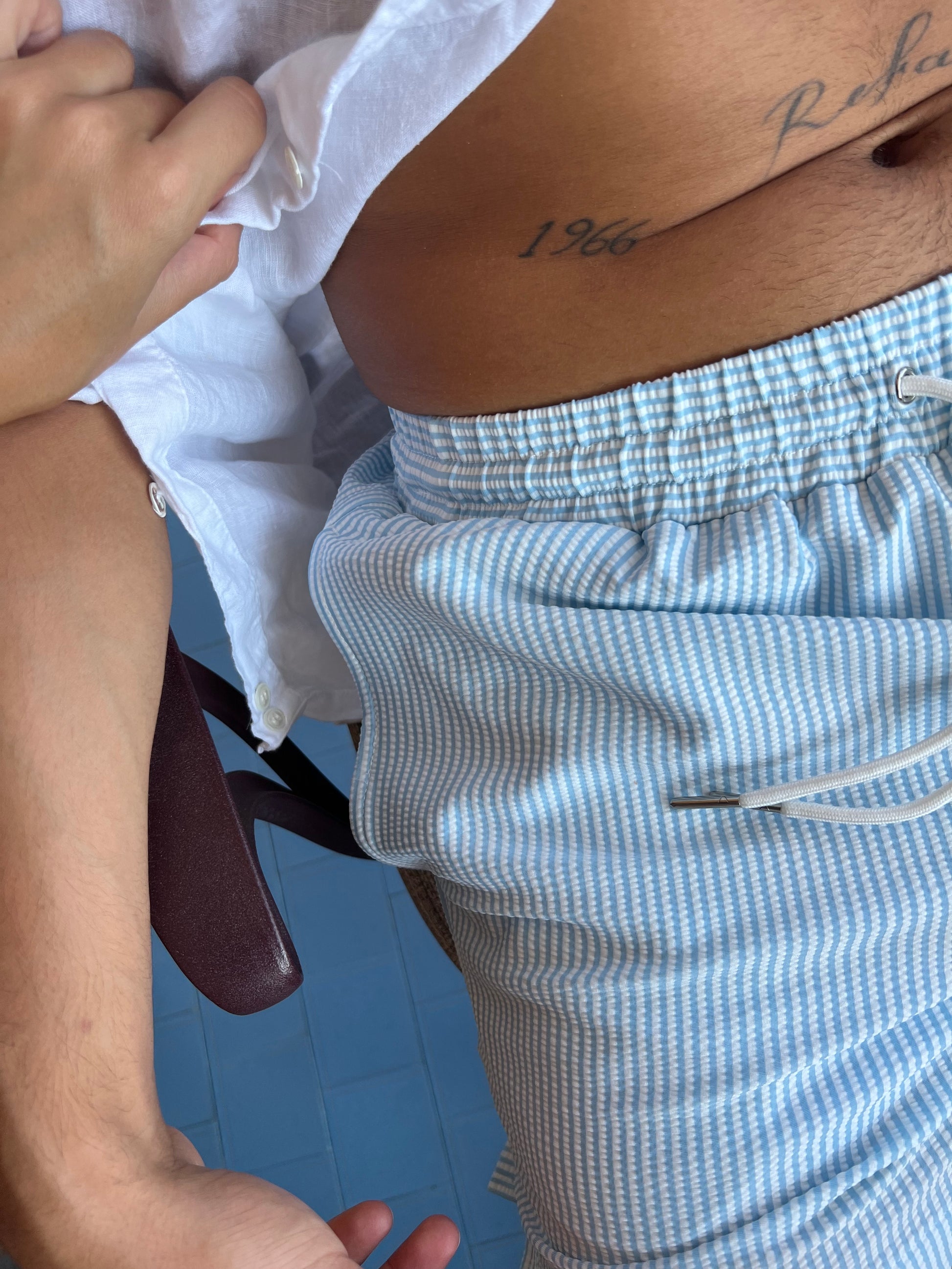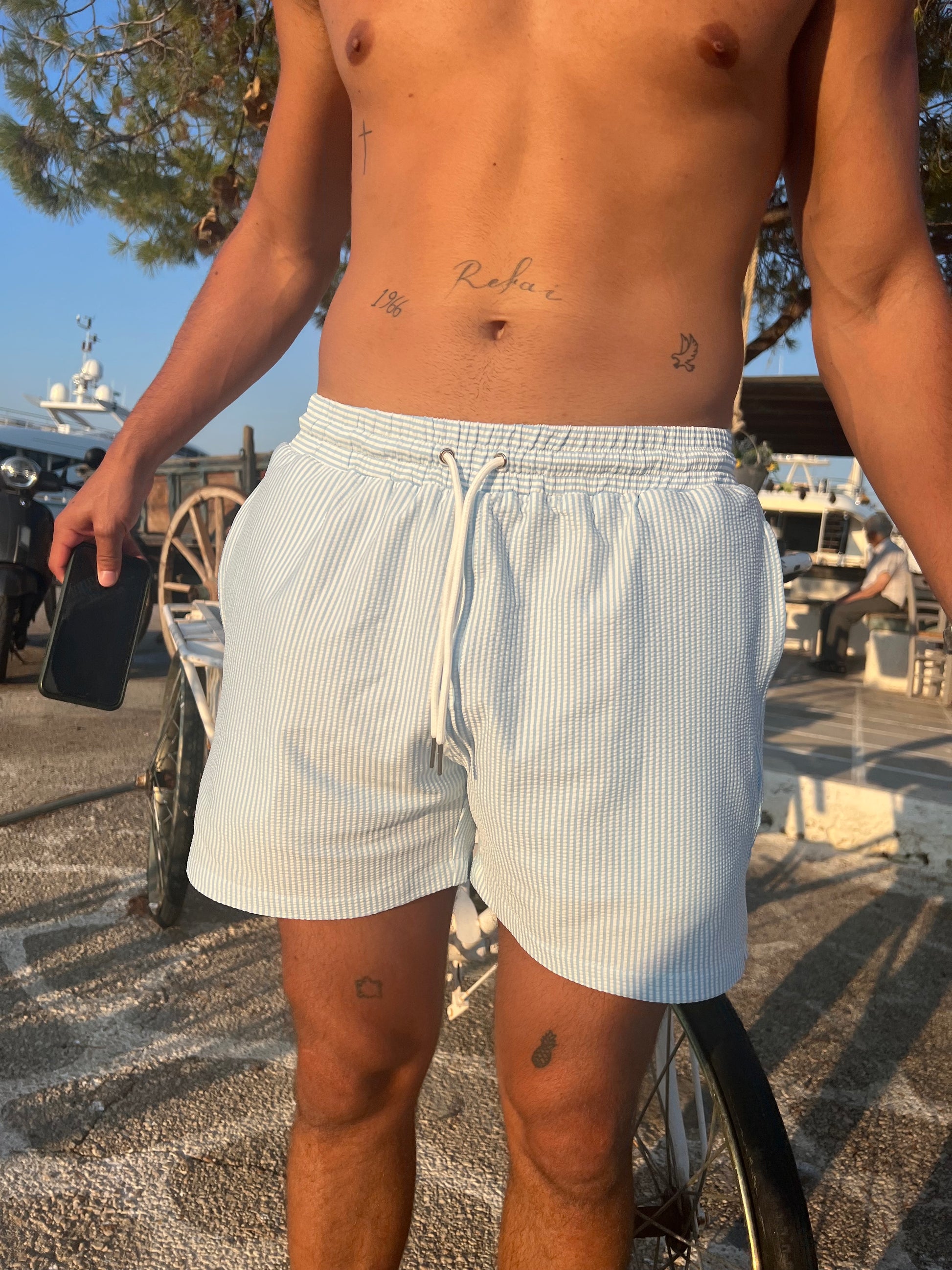Soak up the sun in style with our SeaBob Short. This classic baby blue and white pinstriped short comes in seersucker fabric, giving them that laid-back, beachy vibe. The unique seersucker texture with bunched threads creates a subtly bubbled appearance, adding texture to your beach look. Designed for ultimate convenience and versatility, this short features two side pockets, including sneaky zipper compartments for your secrets, so you'll have plenty of room for your essentials. The tie-string waist ensures a personalized fit, while a small slit on the leg bottom adds a hint of detail. These shorts boast a 5.5-inch inseam, and feature double-lined fabric, making them the perfect balance between everyday loungewear and swimwear.