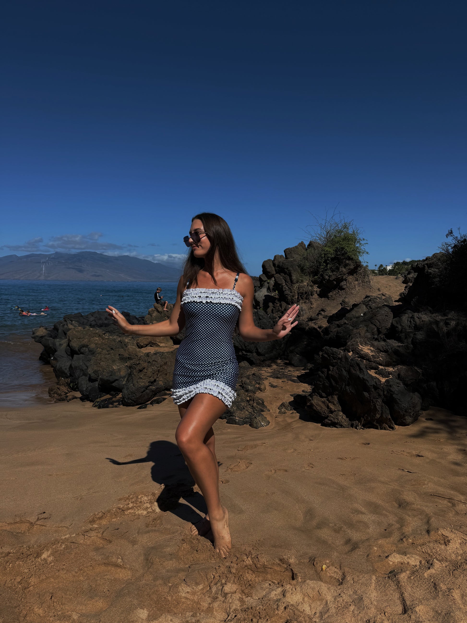 Slip into the Smooth Sailing Tube Dress, where playful polka dots and ruffled trim meet polished, sun-soaked style.