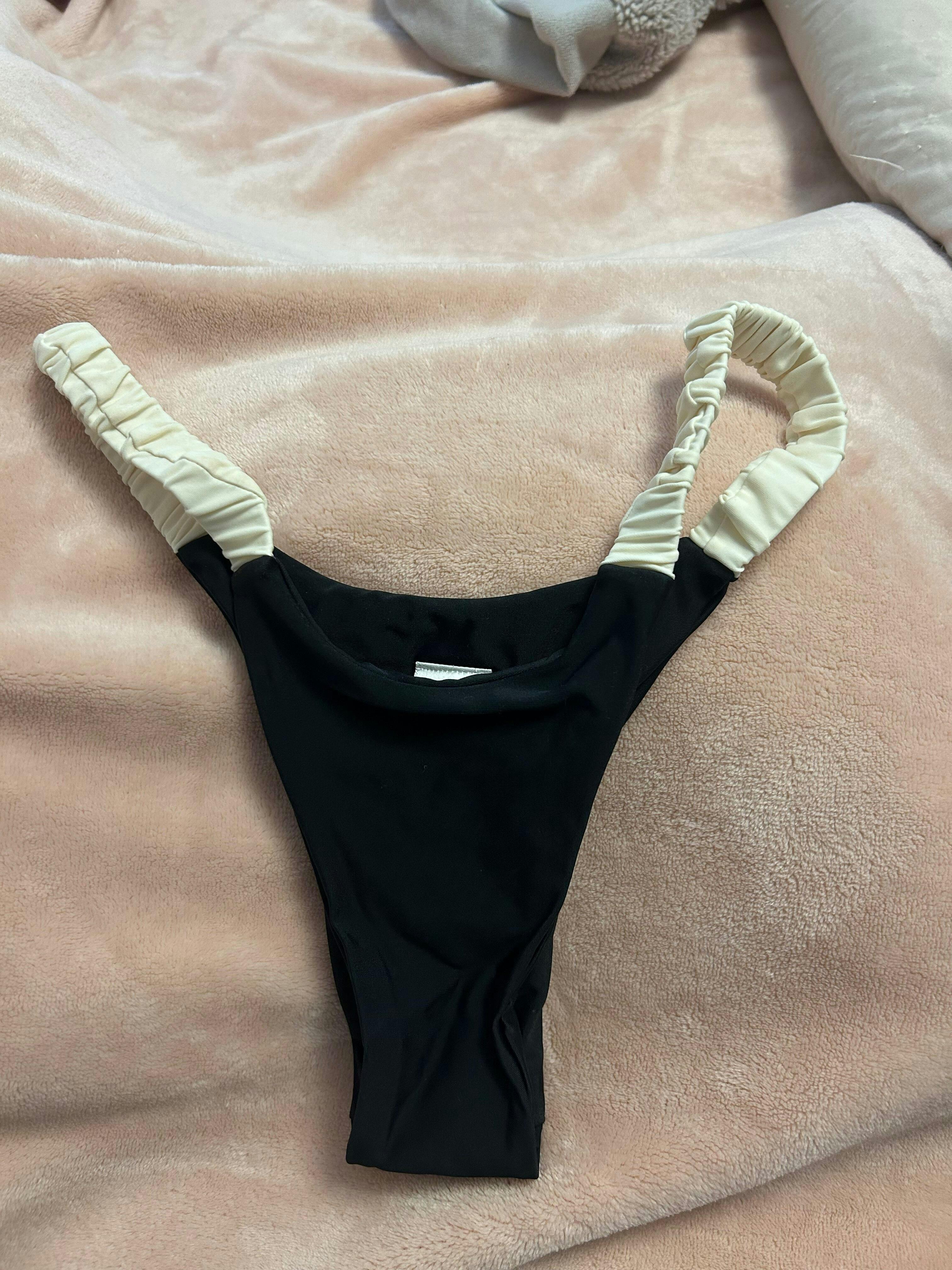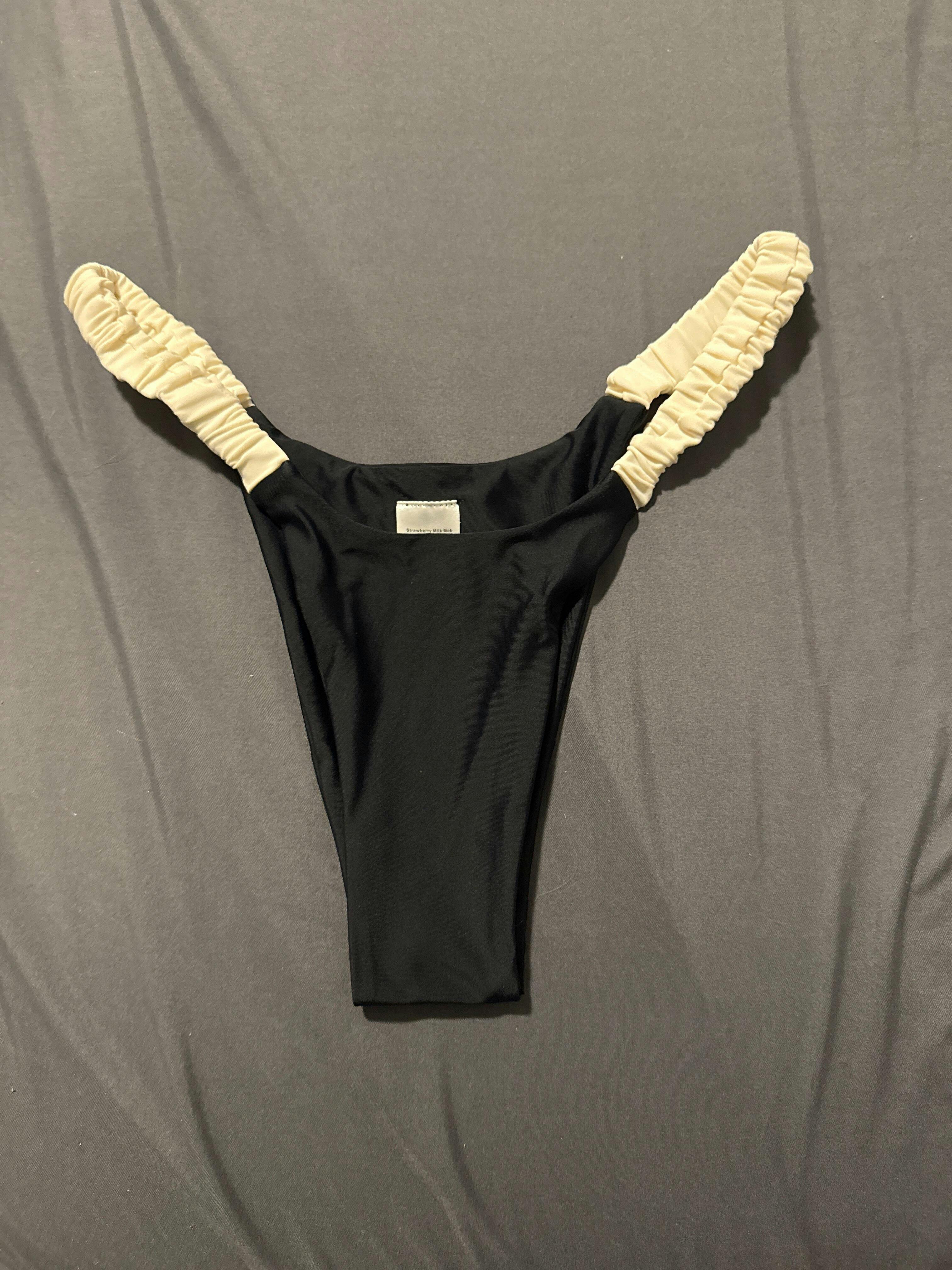The Sporty Bottom blends classic Hollywood glamor with modern athletic style. This bikini bottom boasts a bold black and white colorblock design, with the majority of the bottom in a sultry black hue that perfectly accentuates your curves. What sets it apart are the eye-catching white side waist straps, which not only pop with contrast but also feature a comfortably scrunched, thick design for a secure and chic fit, meant to be worn high on your waist. Slip into this iconic piece as you make a bold and unforgettable statement by the pool or on the beach.