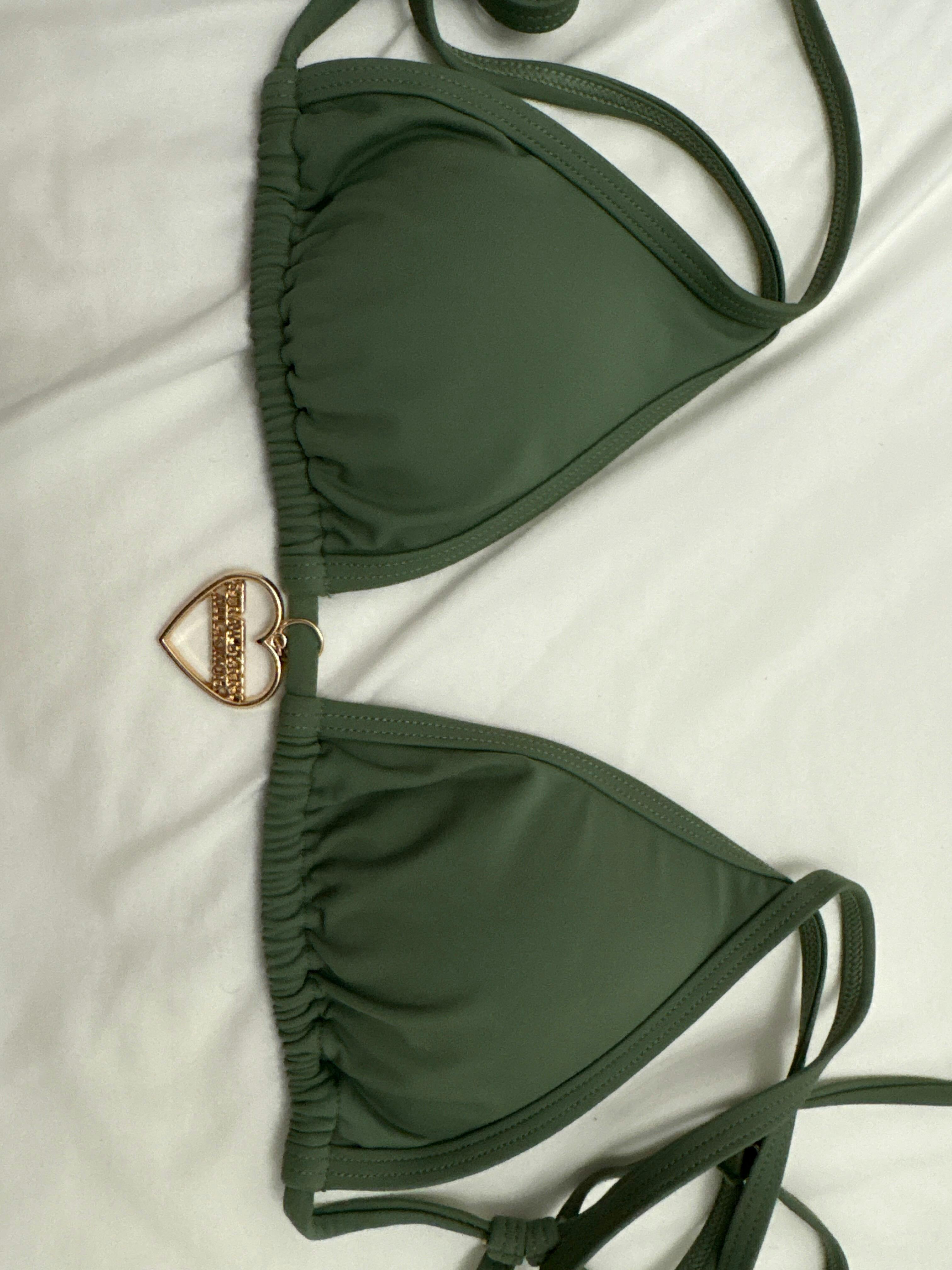 Get ready to rock beach days in this gorgeous khaki green triangle bikini top! With a neutral shade that's perfect for mixing and matching, this piece brings a soft pop of nature-inspired green that flatters every skin tone. Designed for comfort, it features adjustable straps and removable padding, making it easy to customize your fit. Plus, the gold "Strawberry Milk Mob" charm adds a touch of sparkle to this classic look. Whether you’re lounging or diving in, this khaki green swimwear is all about timeless, laid-back style with a chic twist!