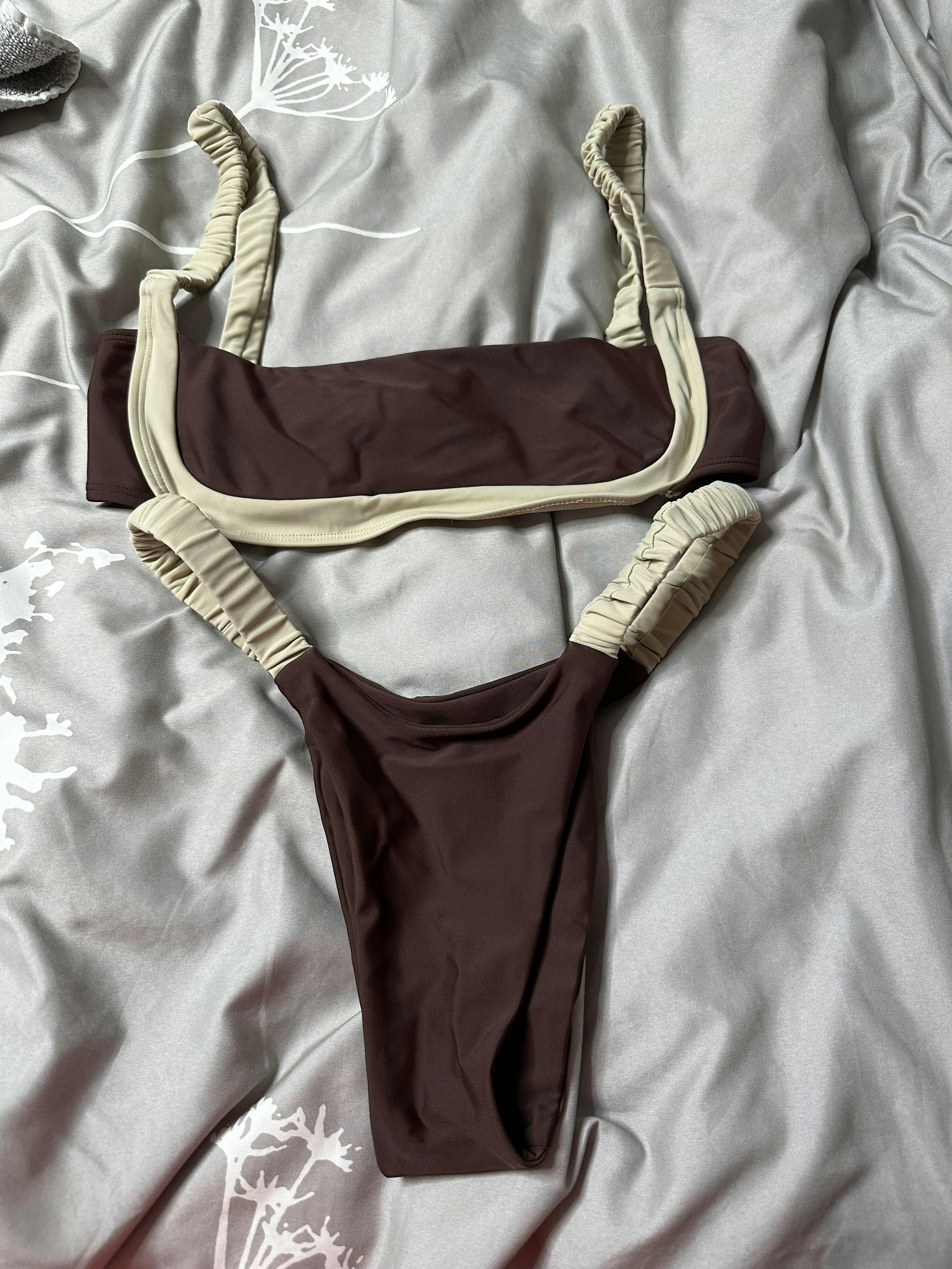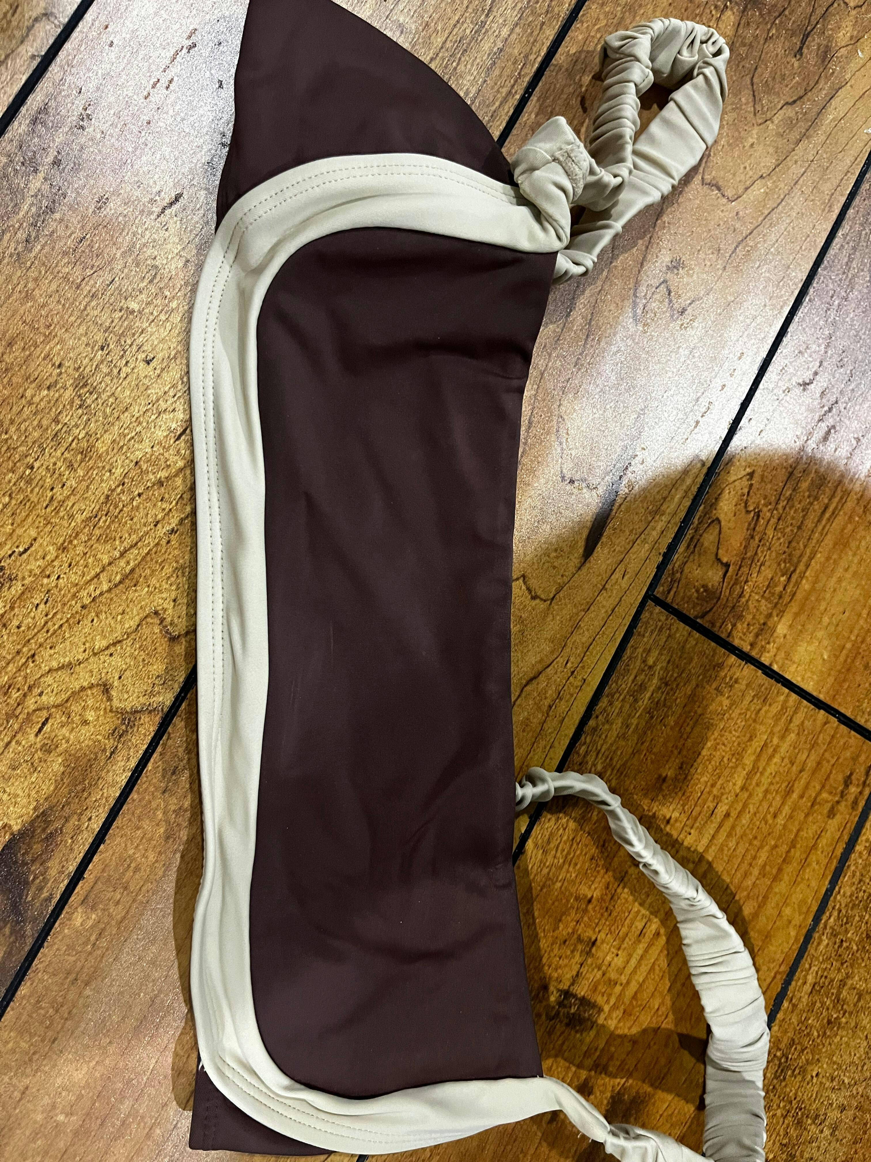 Dance through summer with the Tango Bikini Top, a stunning addition to our iconic Sporty collection! Featuring a rich chocolate brown base and cream scrunch straps/bottom lining, this two-tone beauty blends sports-bra functionality with elegant design. The non-adjustable scrunch straps offer a comfy fit, while the sleek, padding-free style keeps it effortlessly minimal. Embrace the neutral trend and turn heads in this timeless yet playful design!