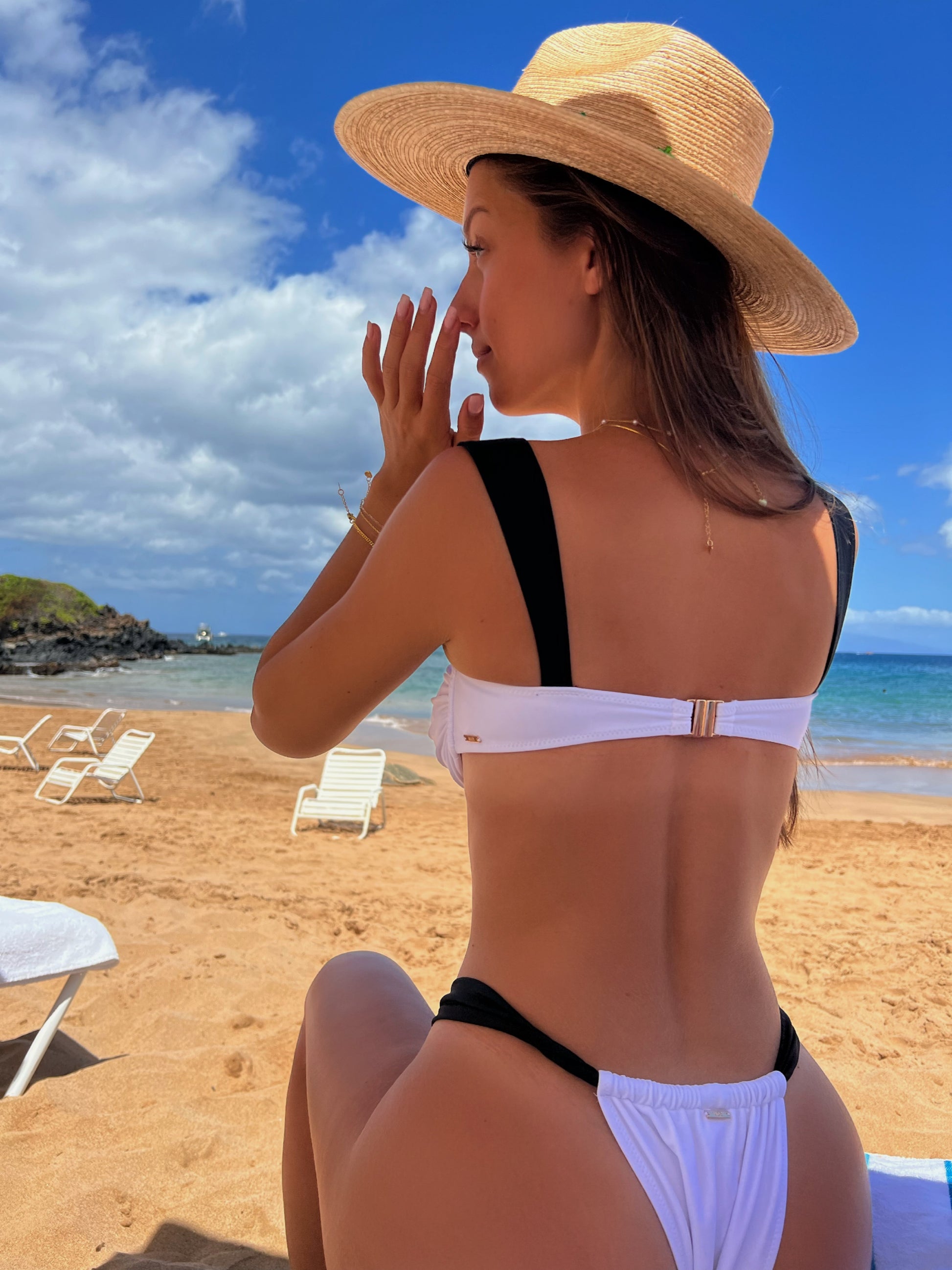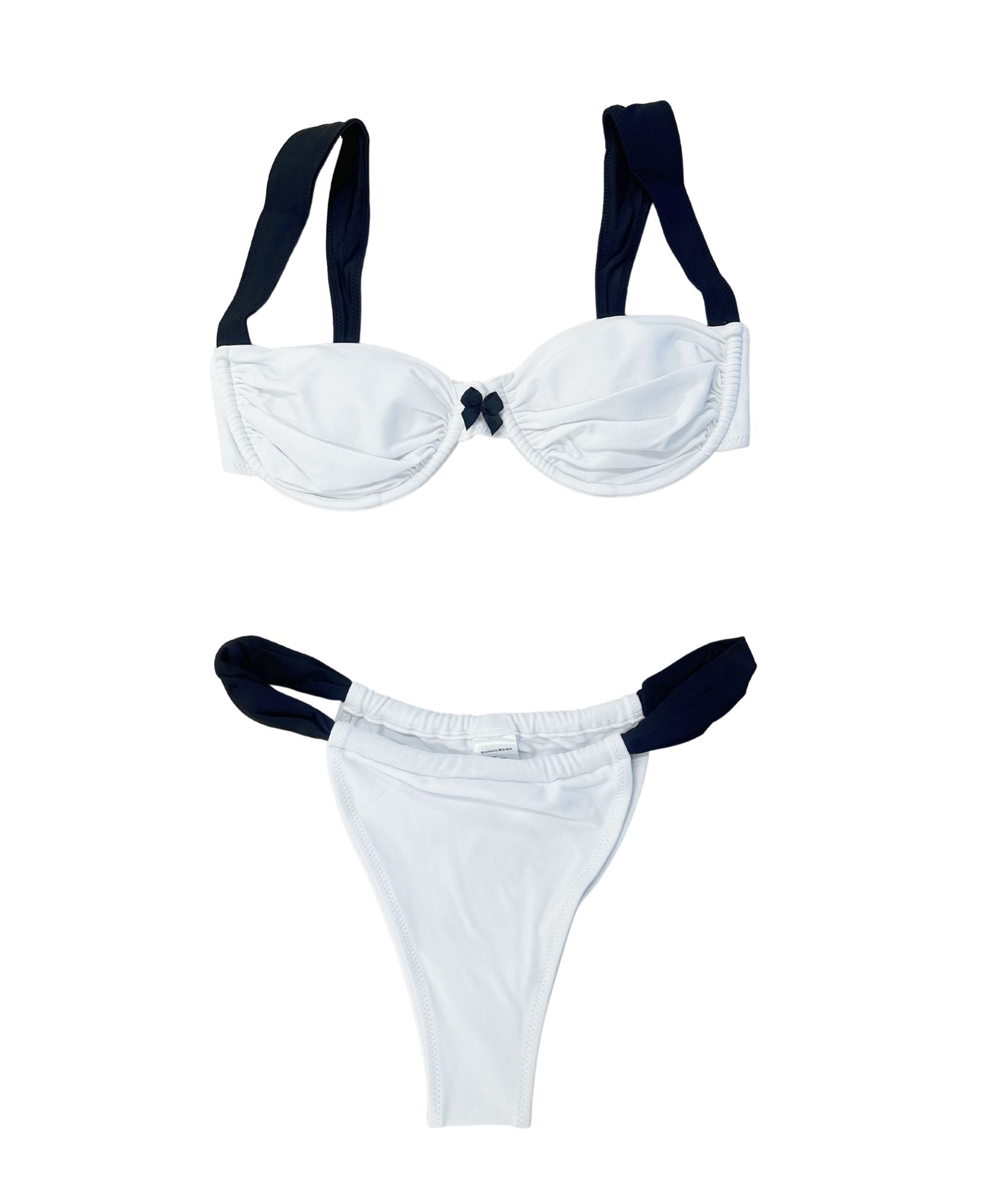 Unveil sophistication with our Tuxedo bikini top – a black and white ensemble that echoes elegance in every detail. While the bikini is white, the black straps and small center bow add a touch of contrast, elevating your beach style to a refined level. Designed to fit generously, the spacious cups ensure a comfortable embrace. Padded yet removable, it's customizable to suit your preference. The metal clasp at the back adds a polished touch, while the central bow detail exudes charm. While the straps remain non-adjustable, the structured metal wiring shape enhances both style and support.