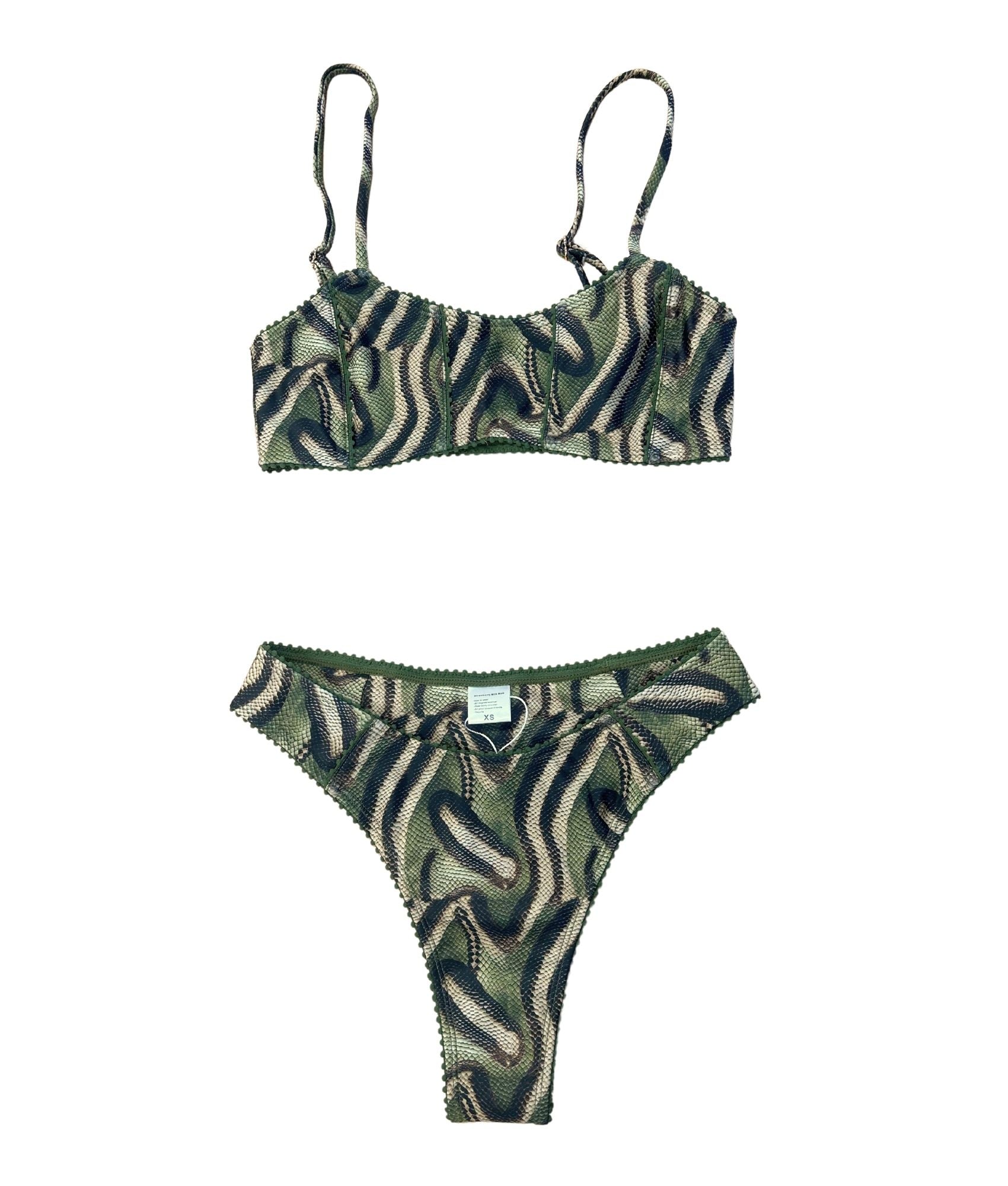 Meet our new Viper bottoms! Designed in our beloved "Cento" cut, these bikini bottoms slither into style with a striking green, beige, and black snake print. Offering a balance of medium to full coverage, they ensure all-day comfort with just the right fit. The delicate lace trim adds a touch of sweetness to this bold look, making it perfect for a family-friendly day at the beach. Get ready to charm in the Viper—it's simply ssss-stunning!