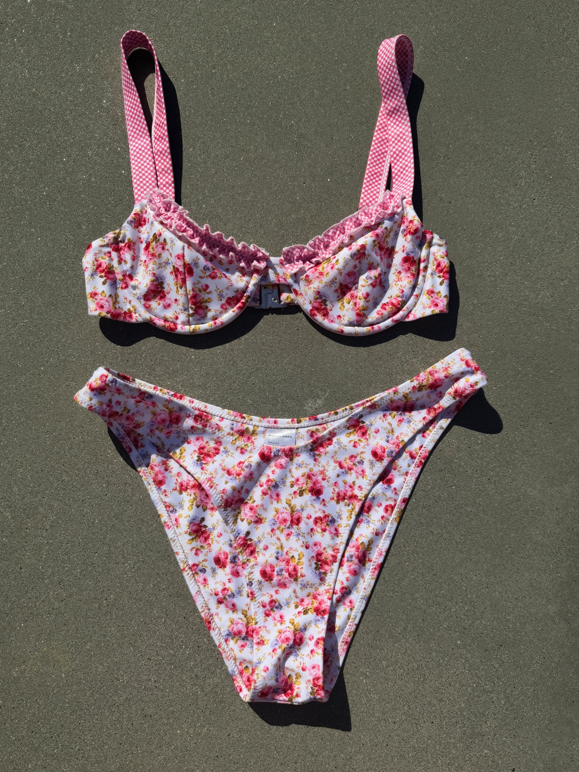 The Young Love Bikini bottom features a romantic floral print, inspired by some of our favorite floral prints from the 60s. This bottom fits true to size, and offers full-booty-coverage. The zig zag stitching provides a comfortable yet secure stretch, as it is meant to be worn on your high hip, creating that perfect V-shape.