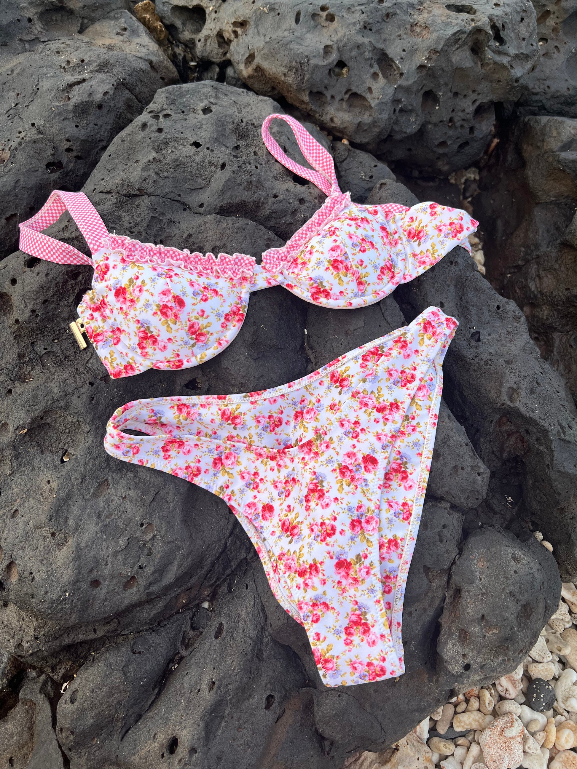 The Young Love Bikini top features a romantic floral print, inspired by some of our favorite frilly cuts from the 60s. This top fits small, as it is a champion for our itty bitty girlies. The padding creates the perfect push-up effect, with the option to remove if preferred, and the shoulder straps are both adjustable. Comes complete with a metal clasp at the back.